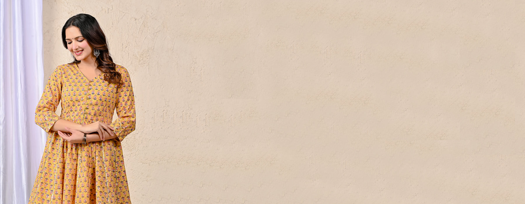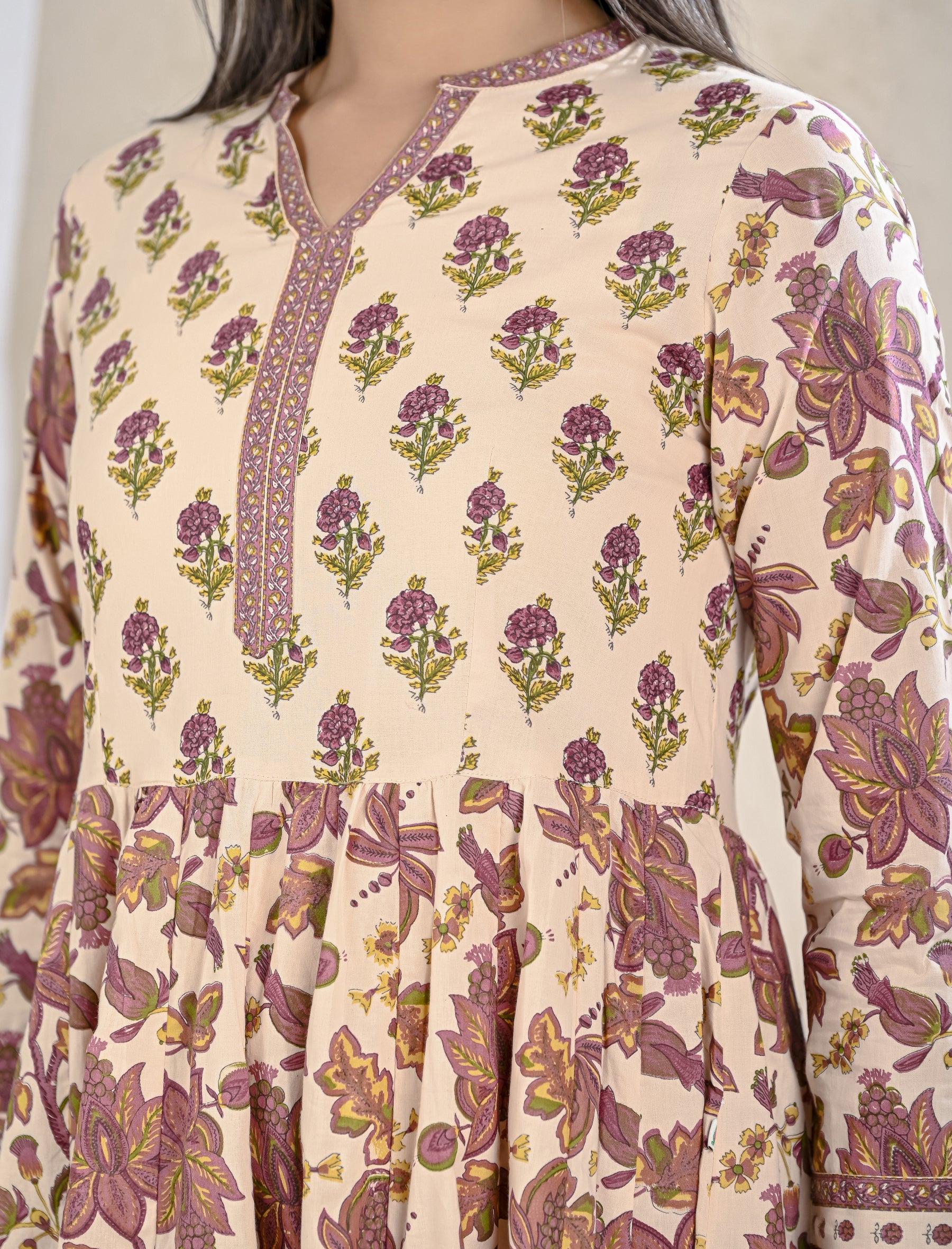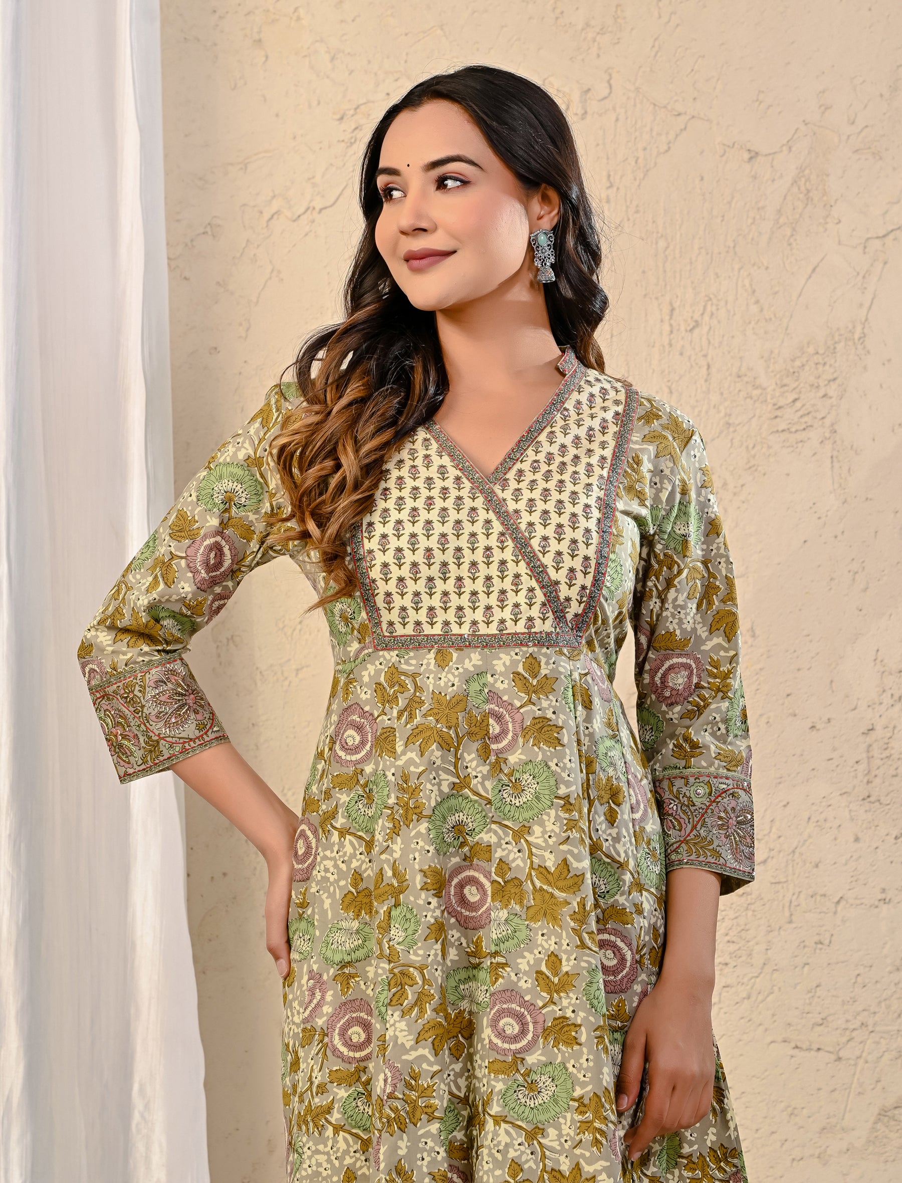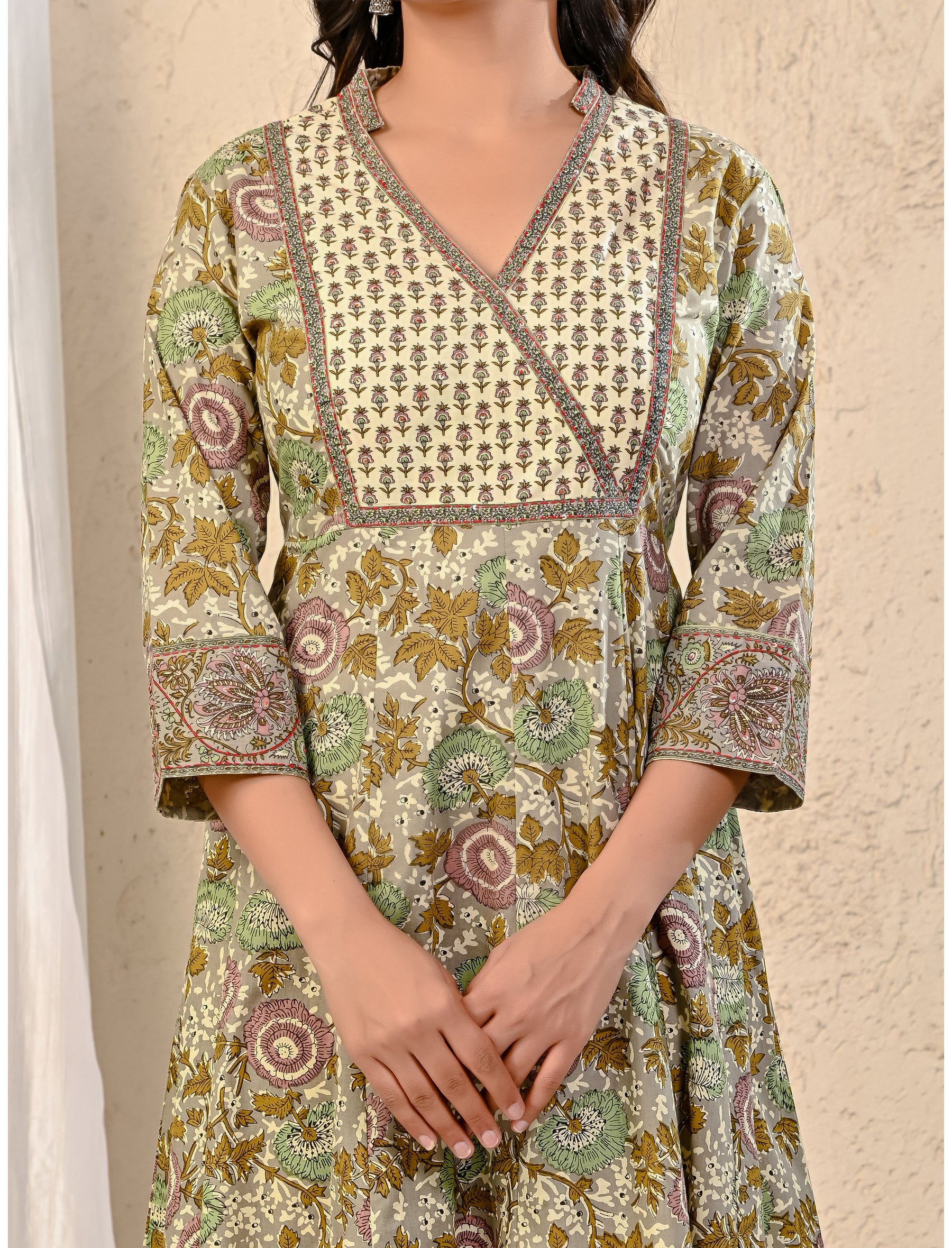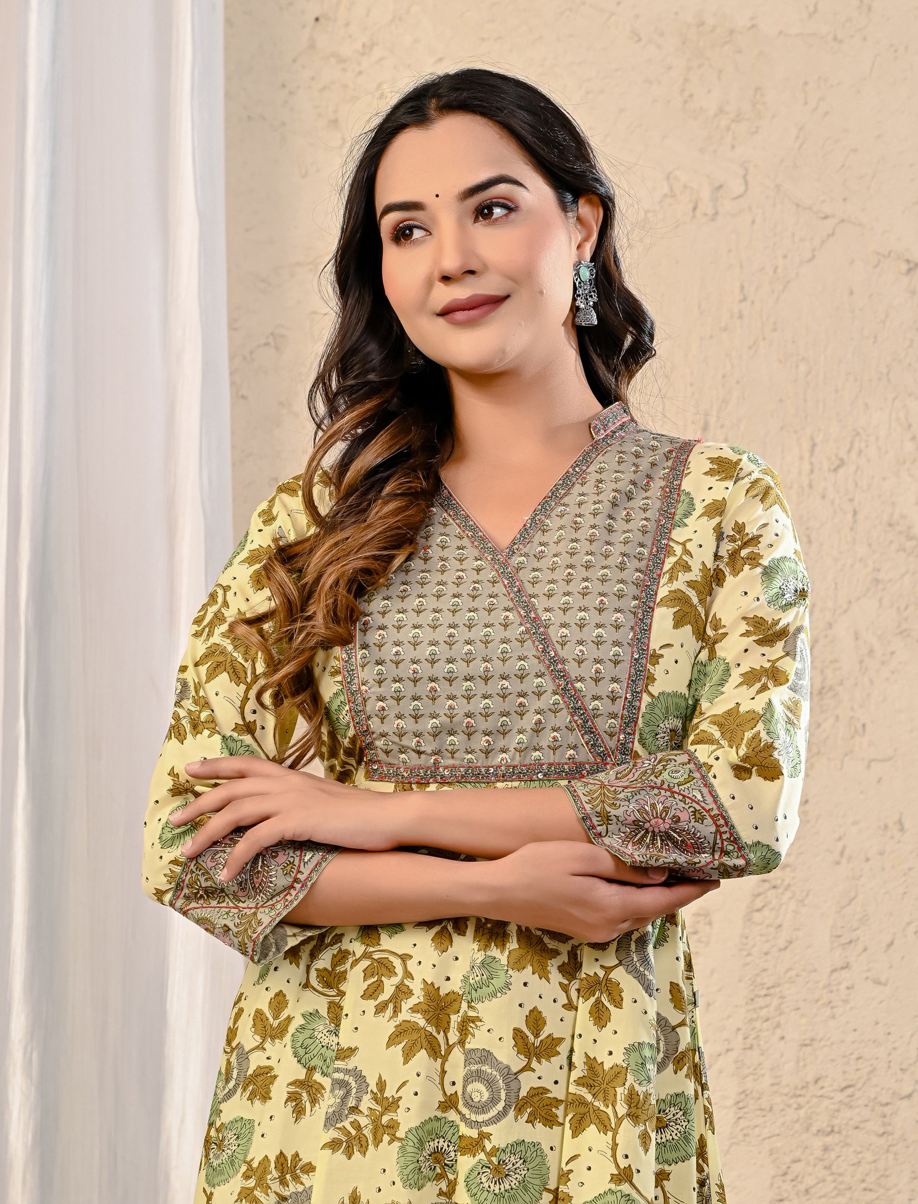 Cream Yellow Butta Printed Angrakha Long Dress With Flare