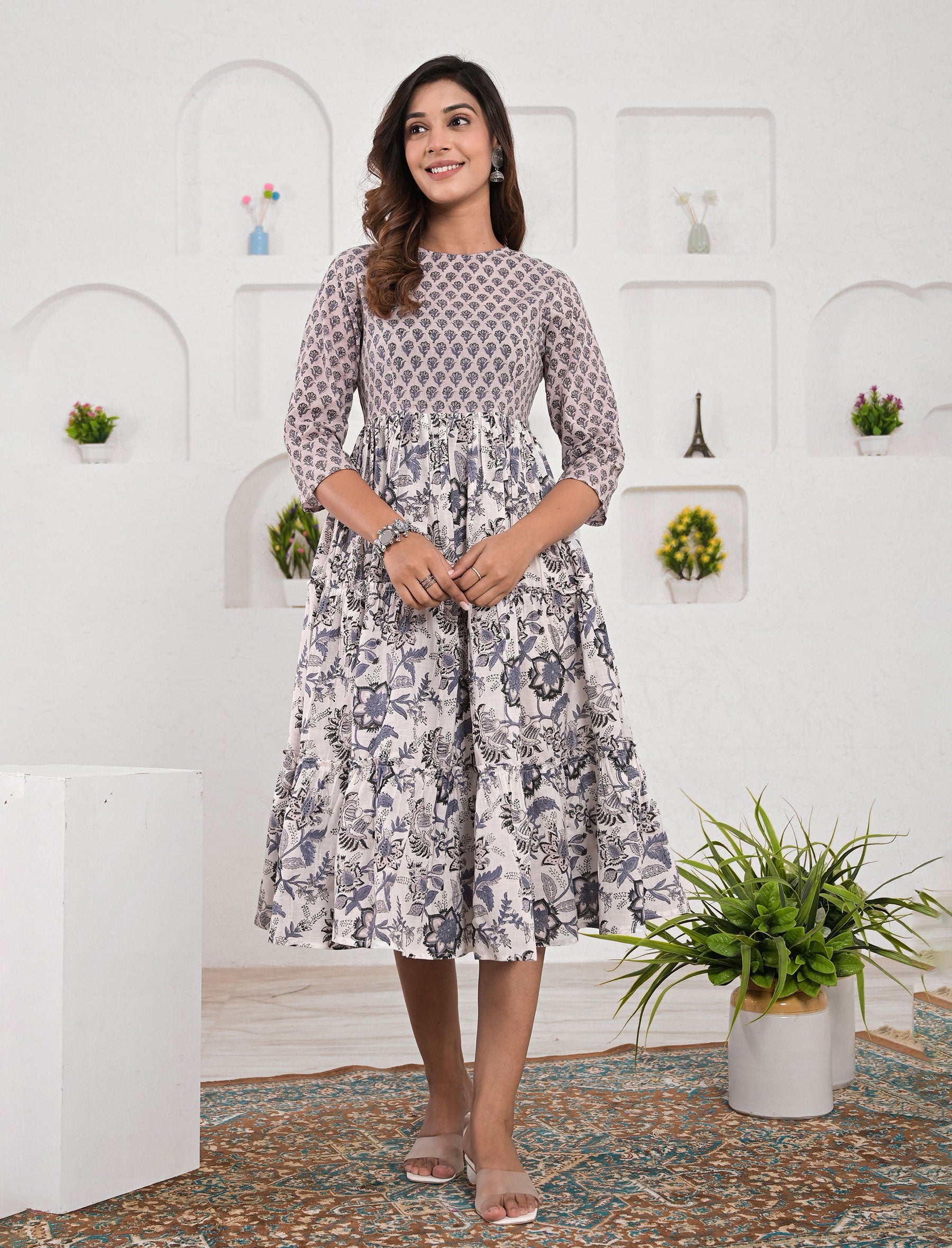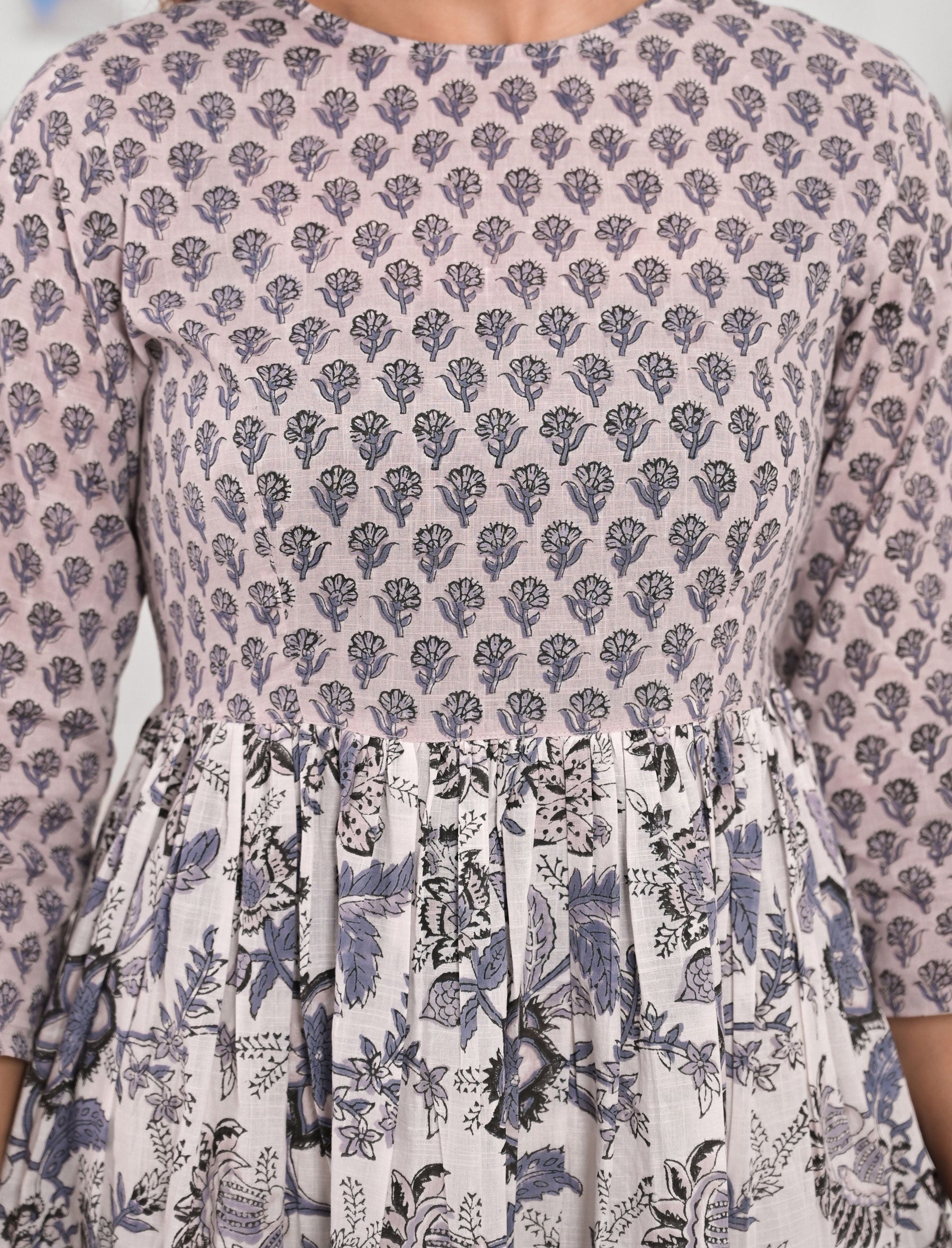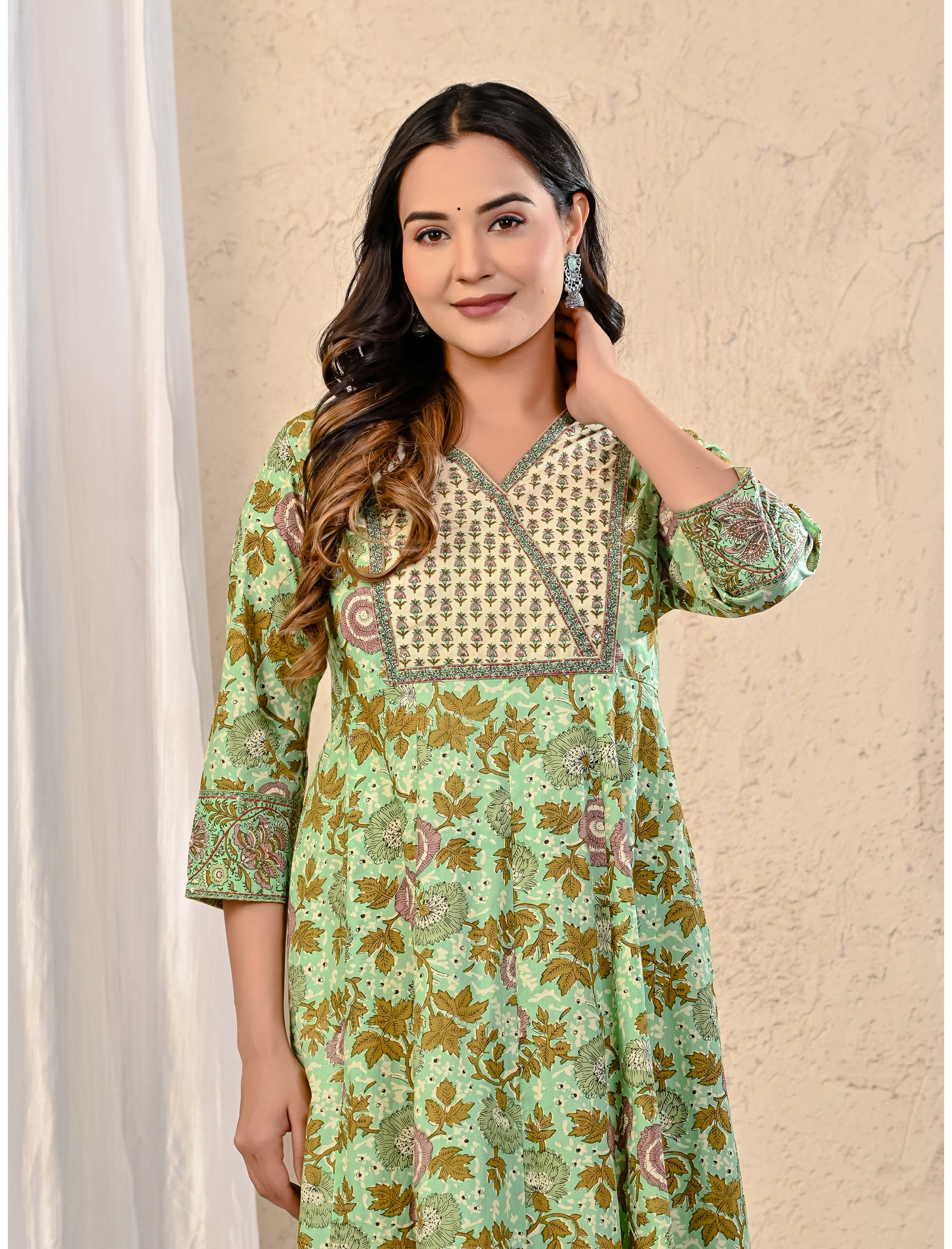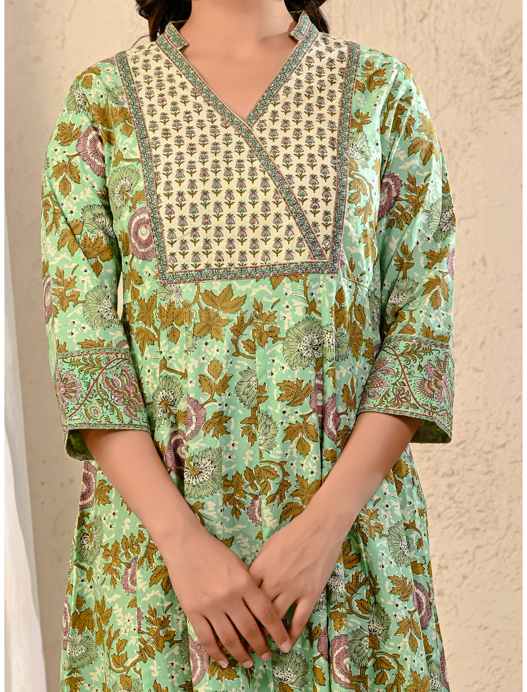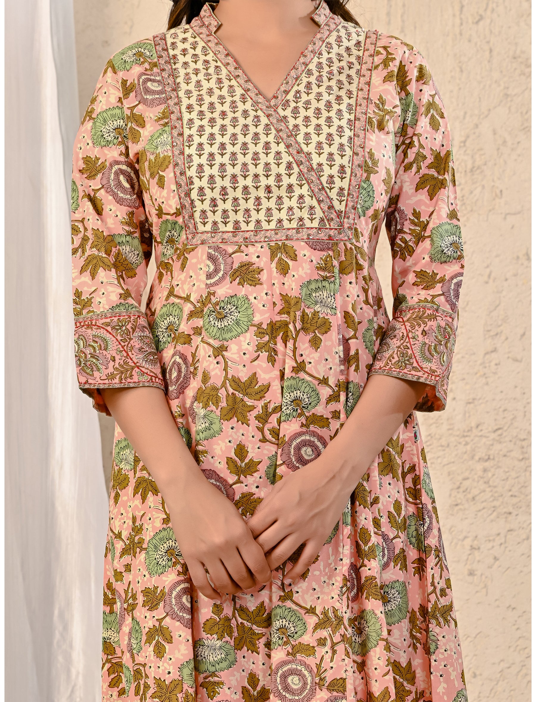 Cream Yellow Butta Printed Angrakha Long Dress With Flare
