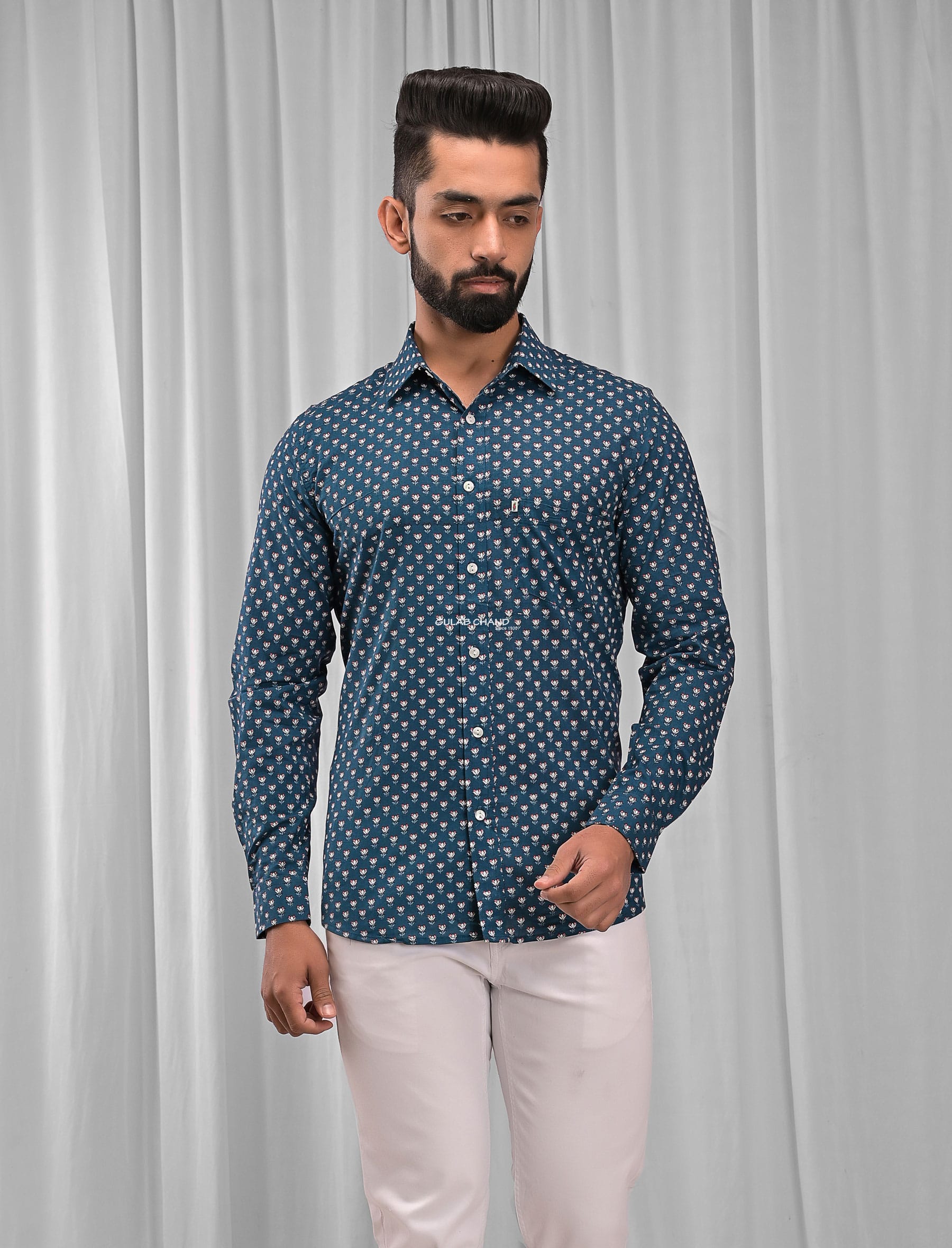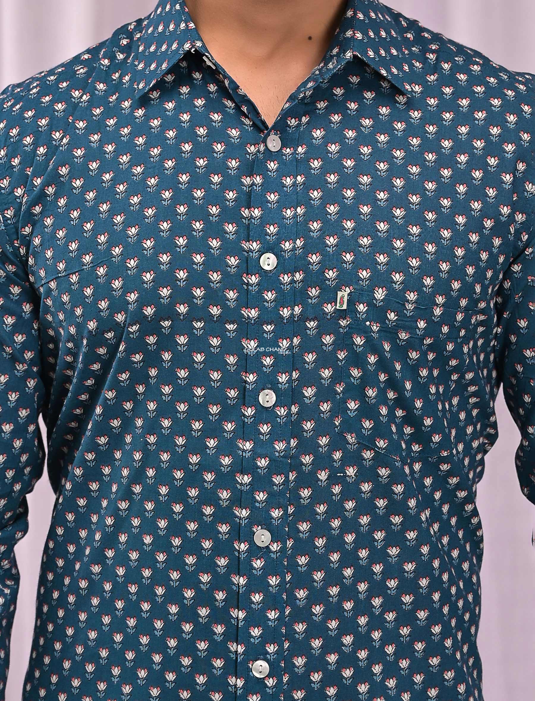 Sea Blue Cotton Printed Full Sleeves Shirt