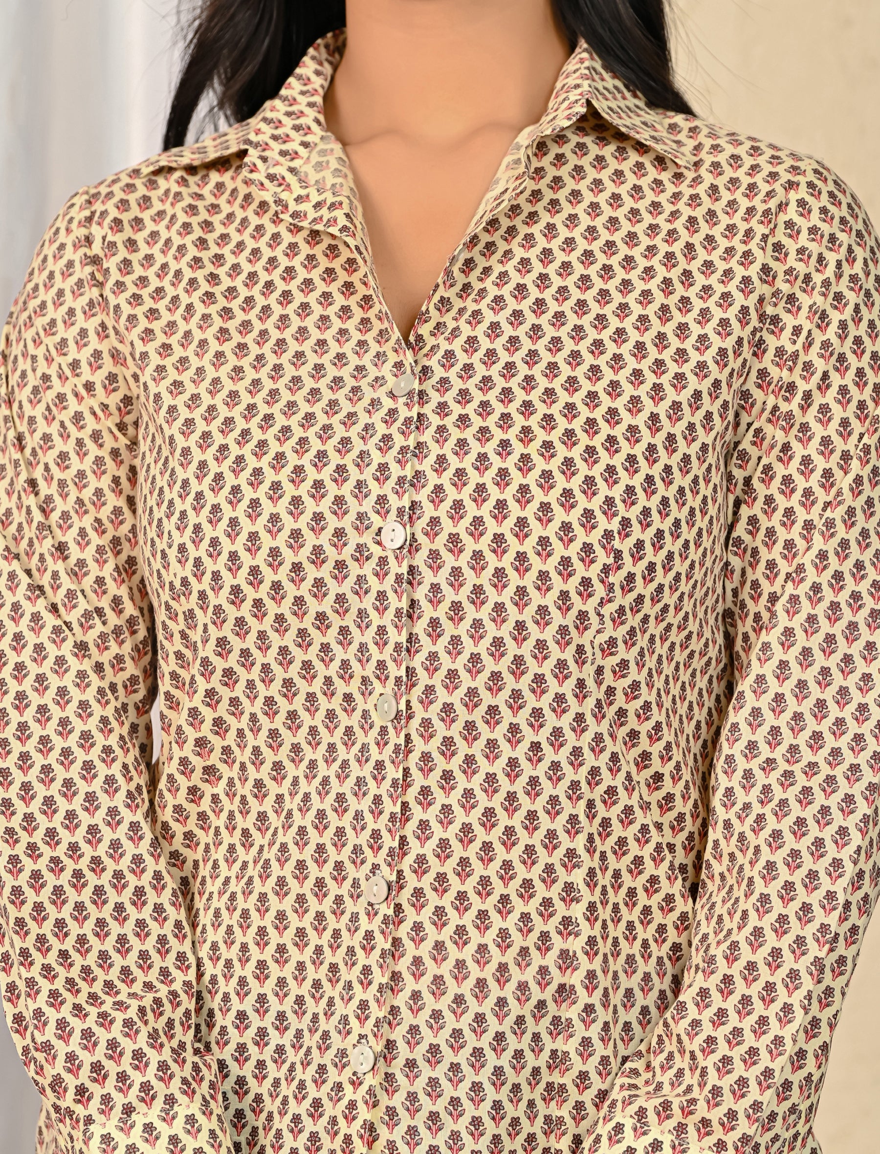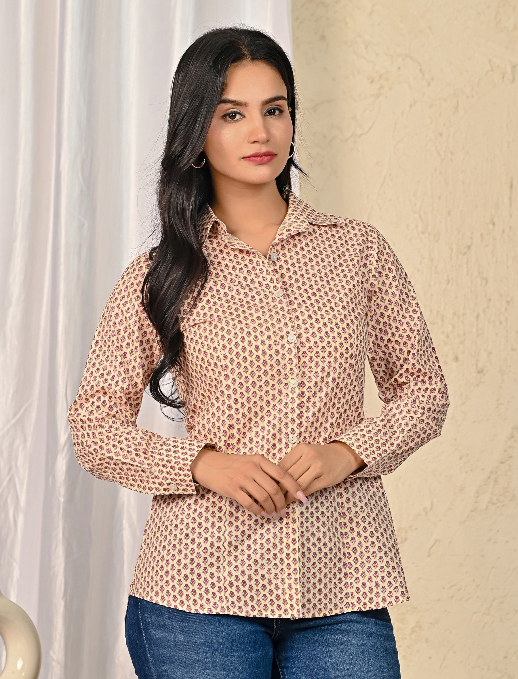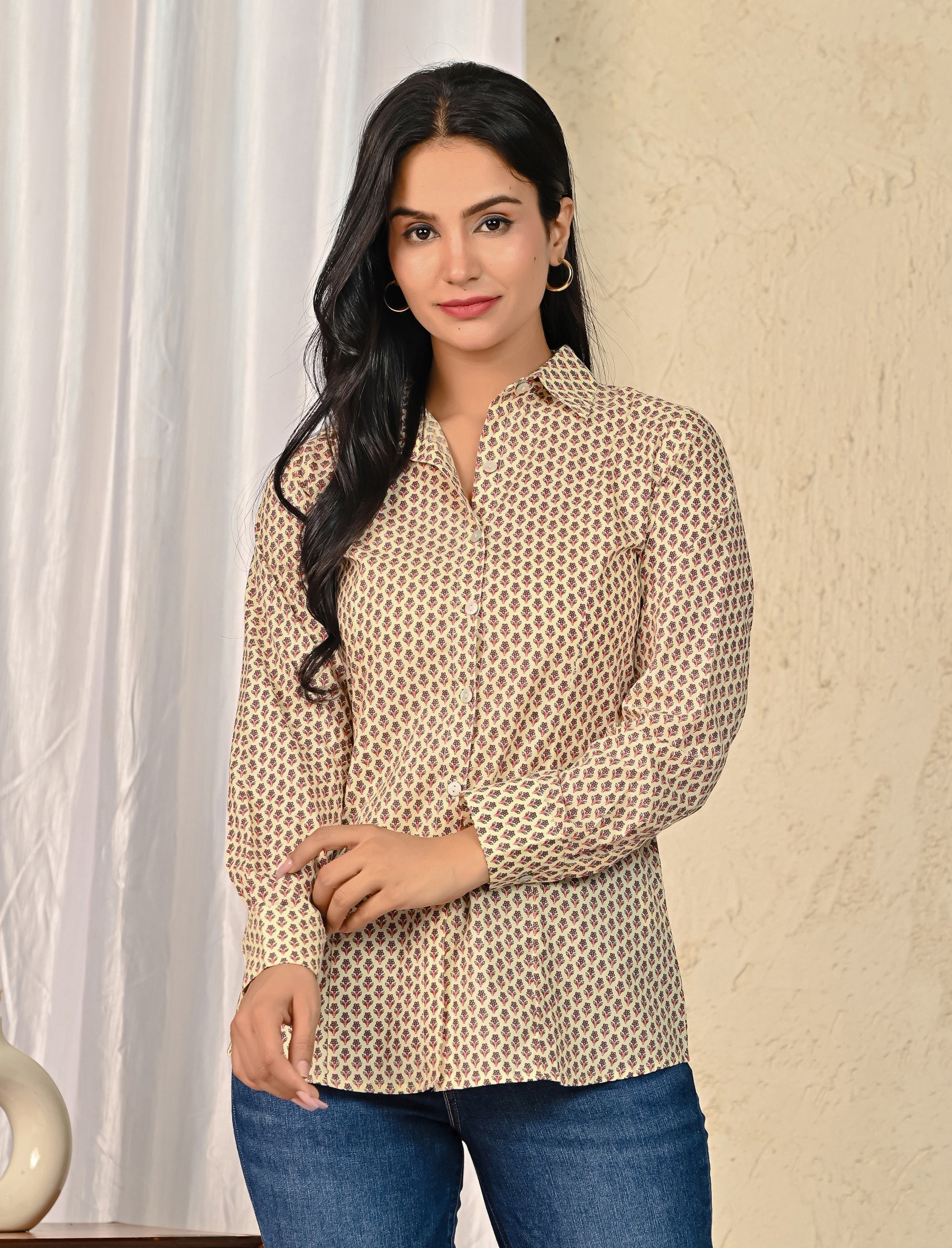 Cream Cotton Printed Full Sleeves Shirt For Women