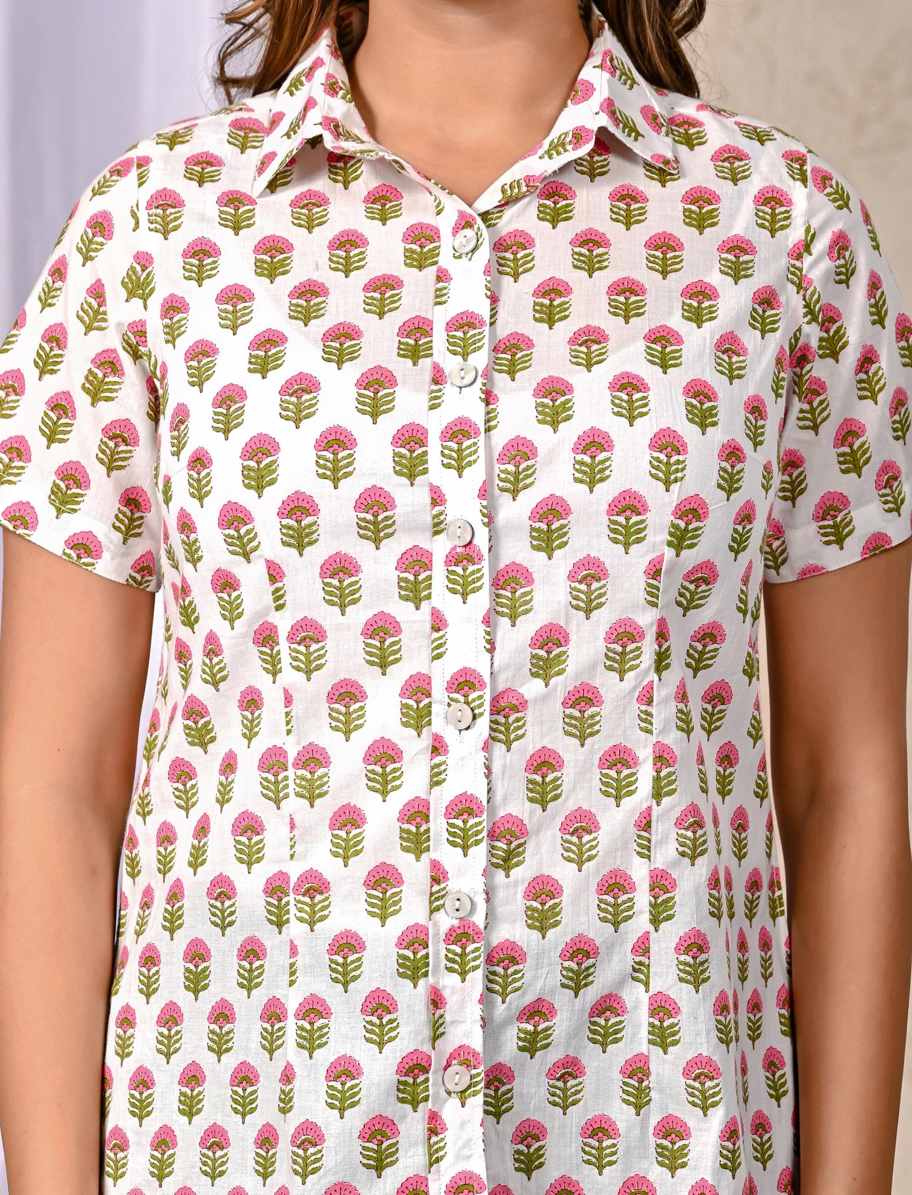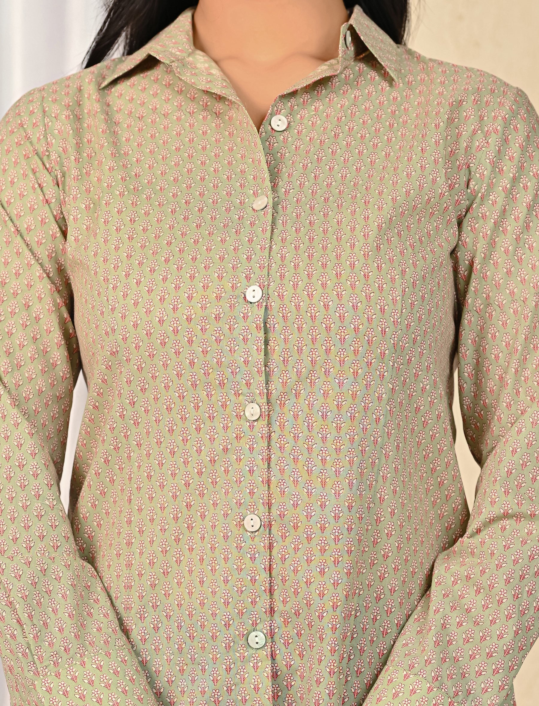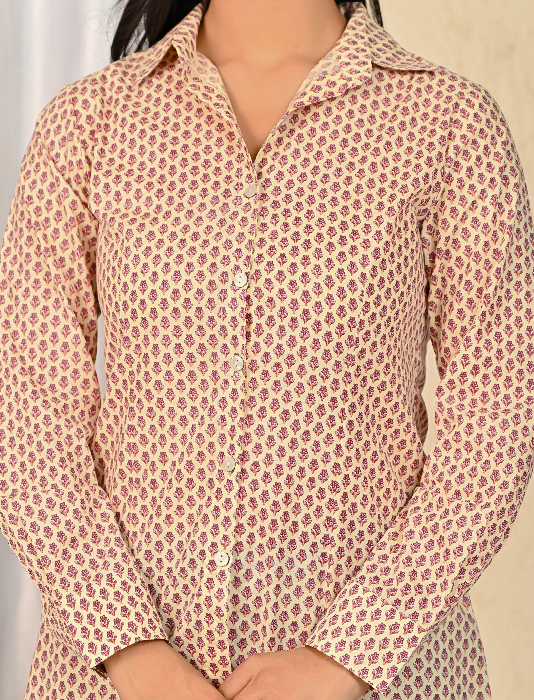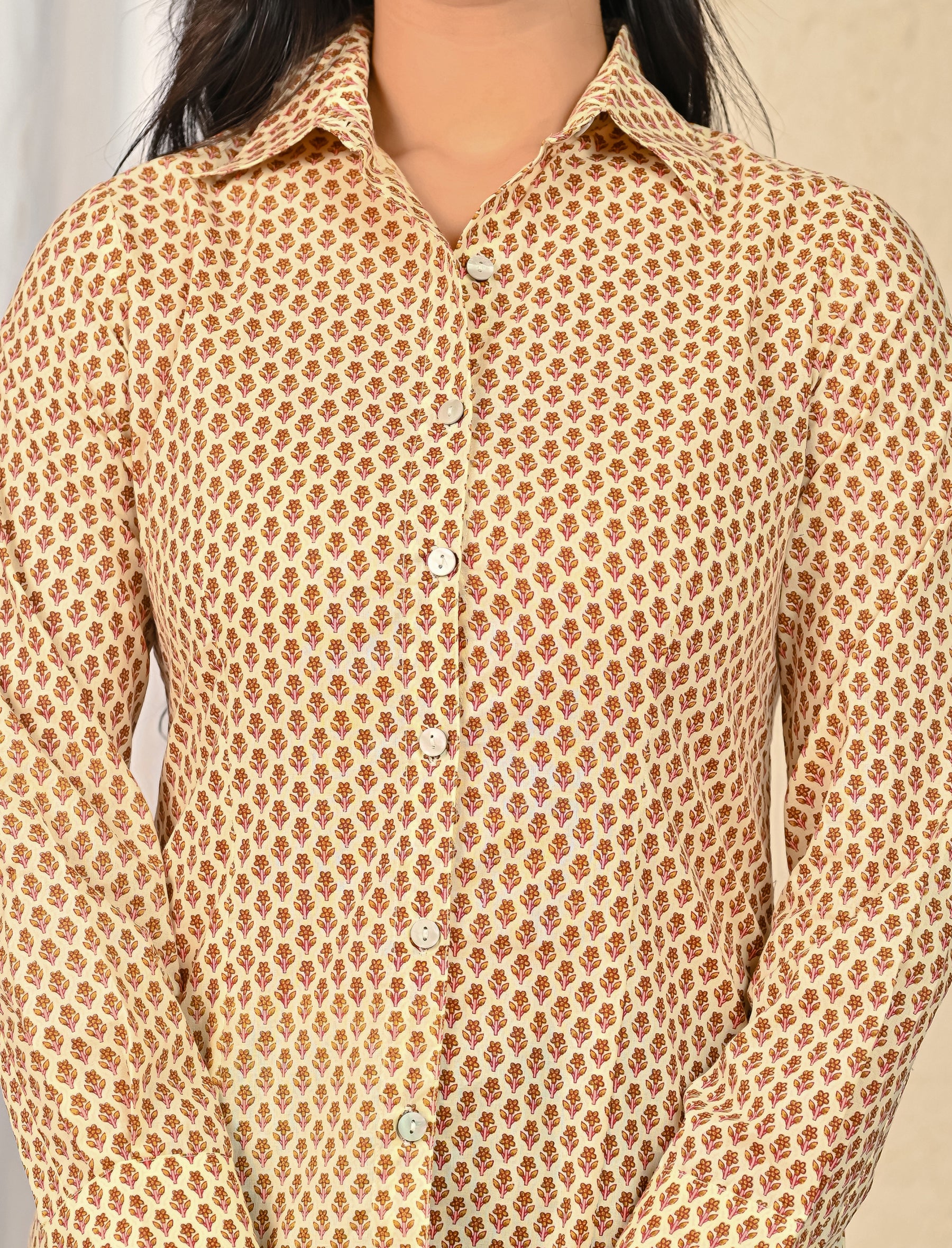 Cream Cotton Printed Full Sleeves Shirt For Women