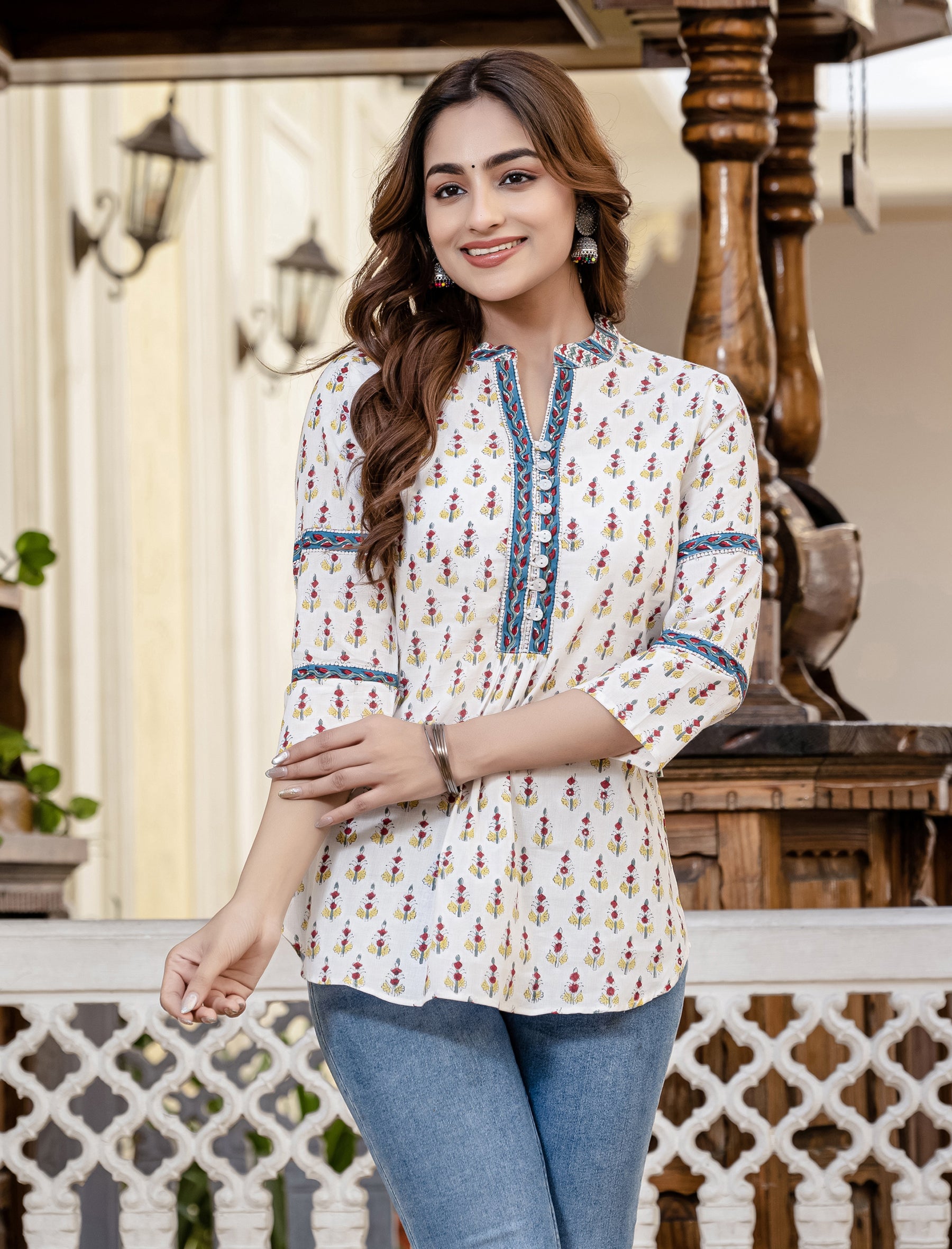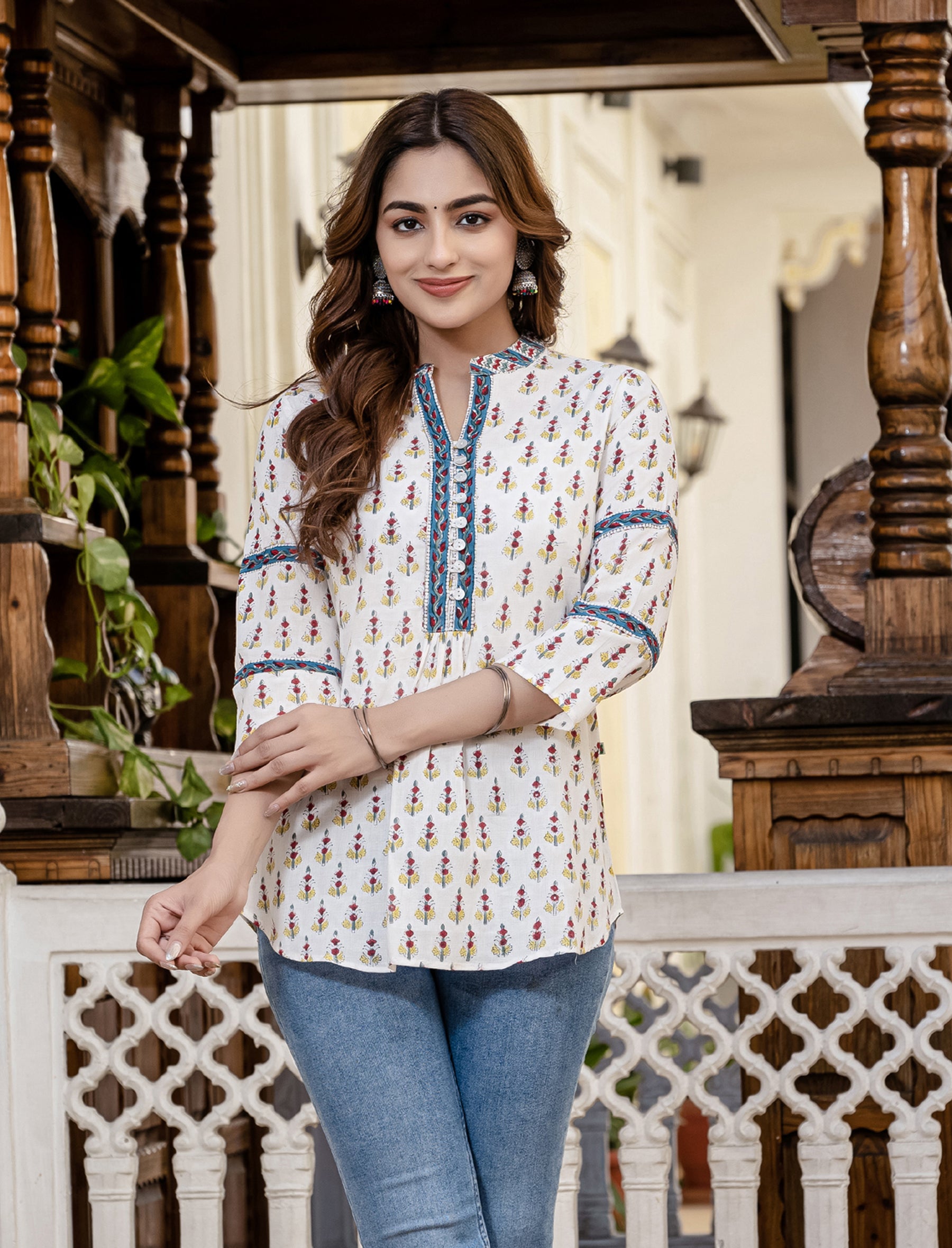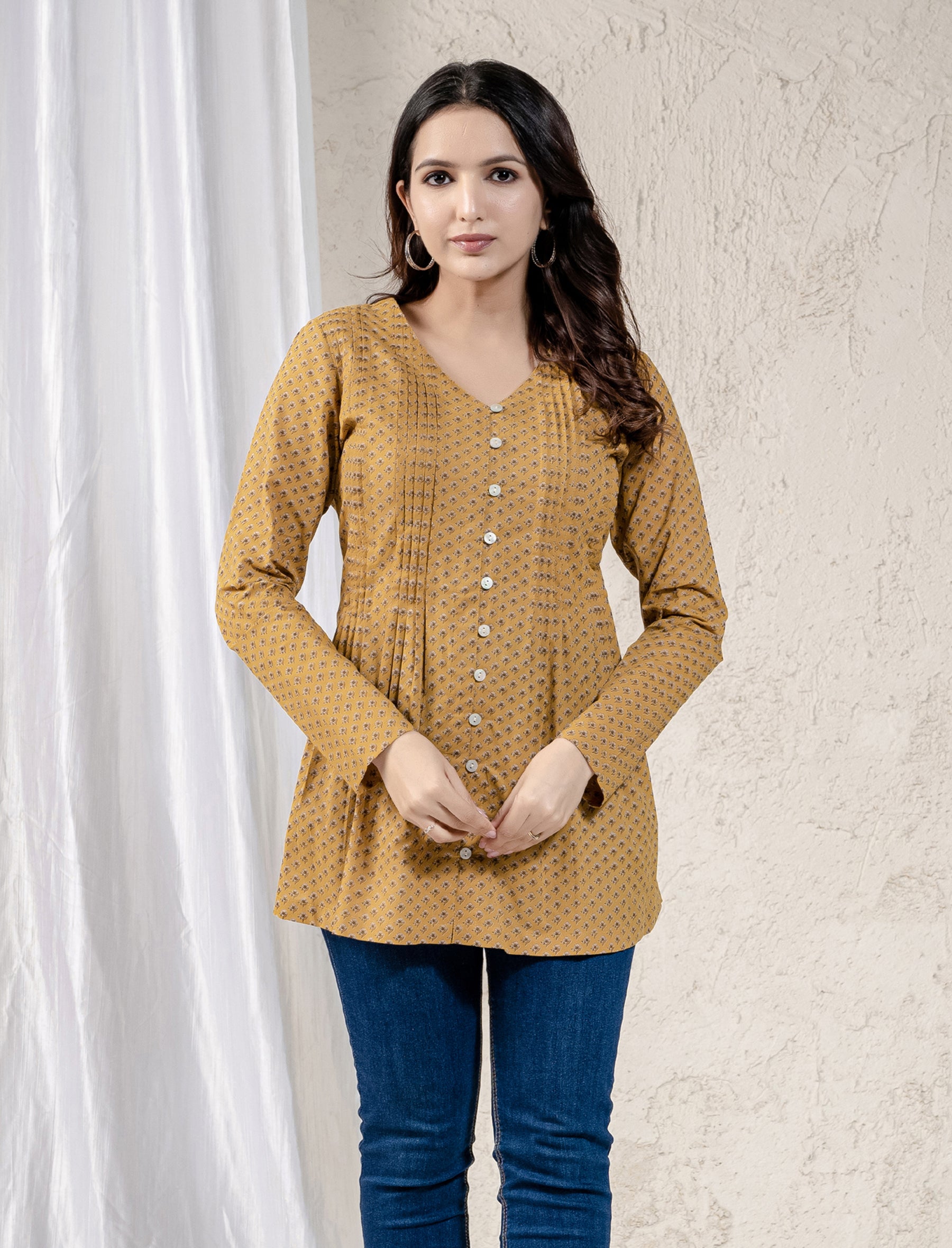 Cream Cotton Printed Full Sleeves Shirt For Women