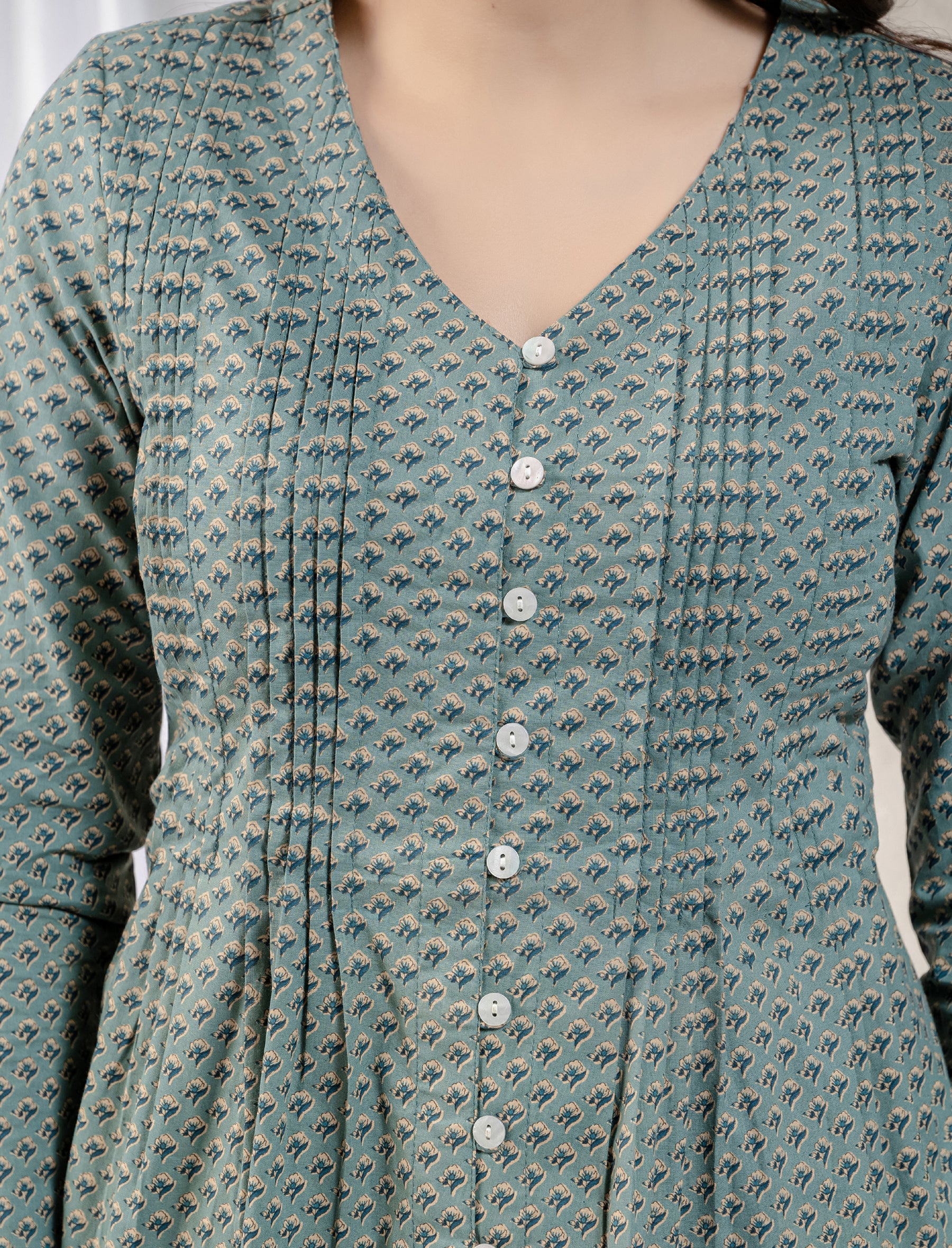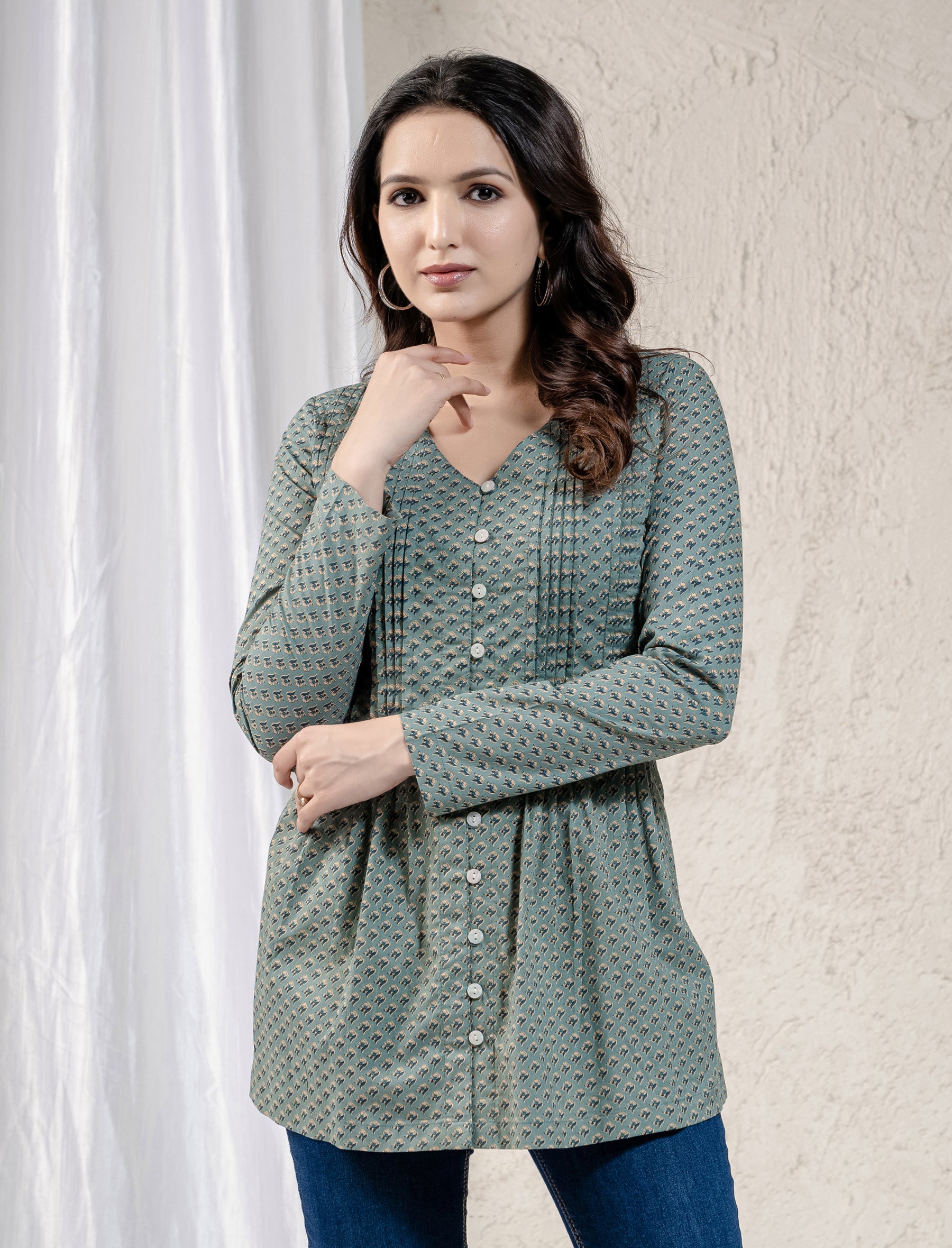 Grey Cotton Printed Full Sleeves Shirt For Women