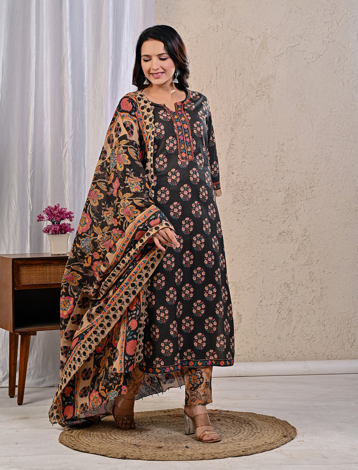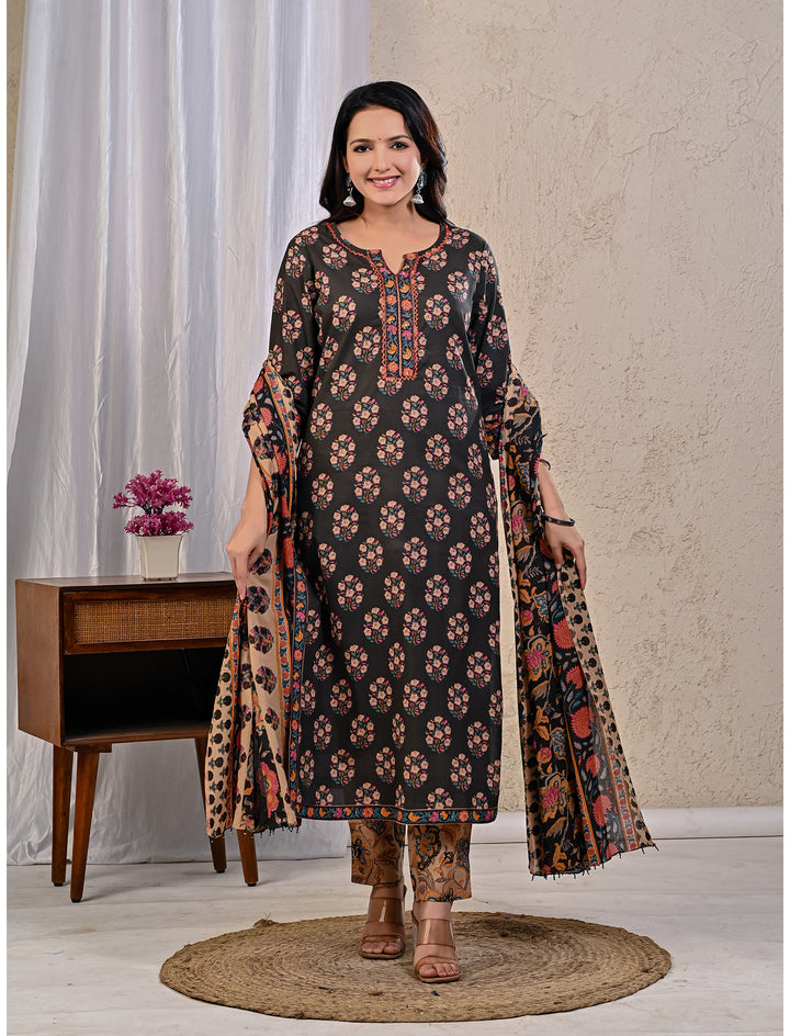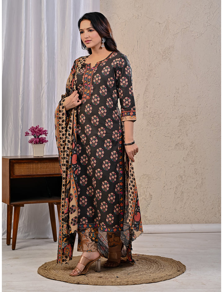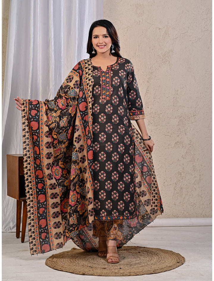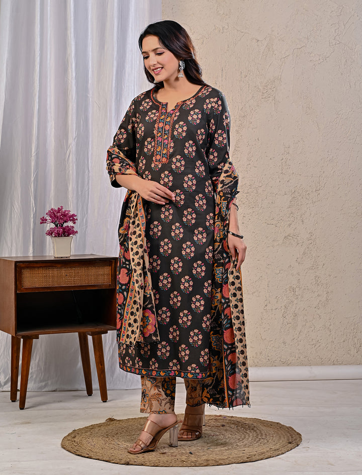 Black Butta Block Printed Cotton Kurta Pant Set With Mulmul Dupatta