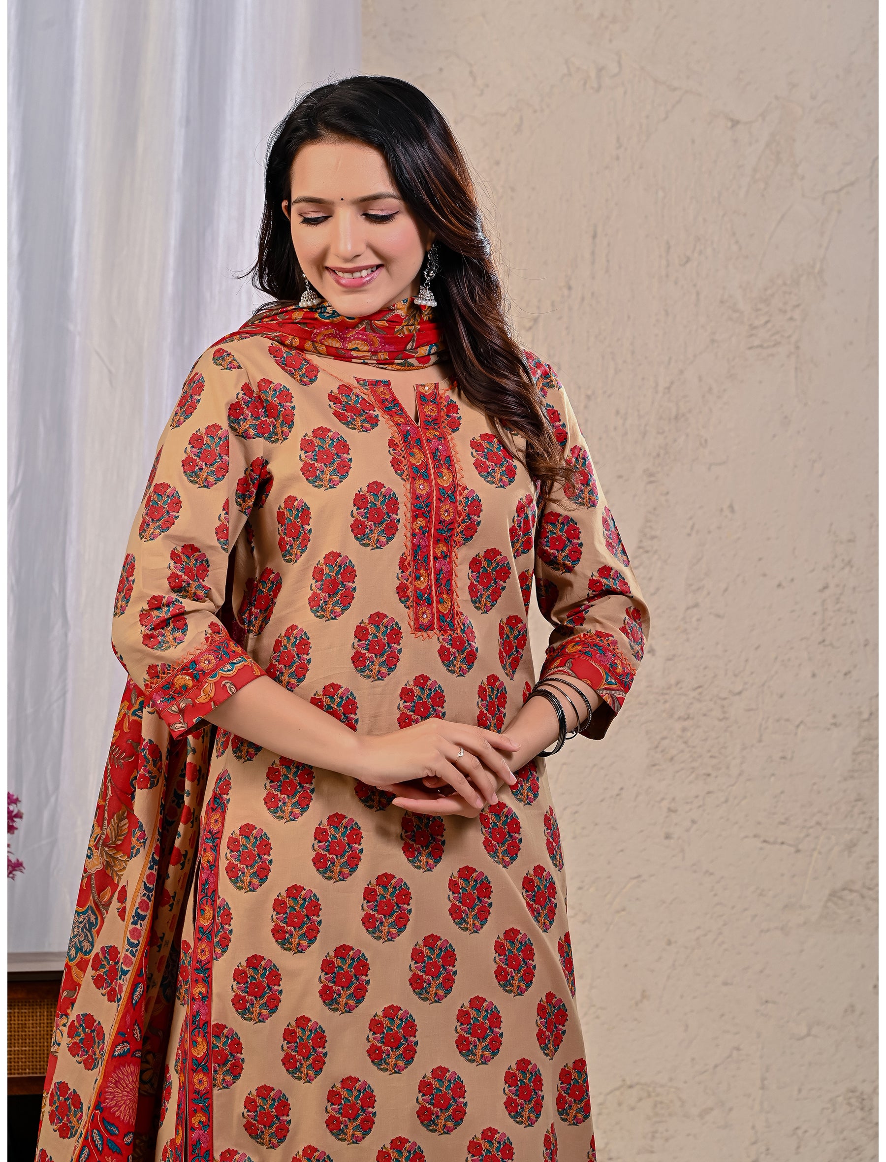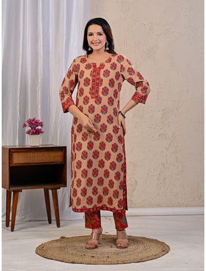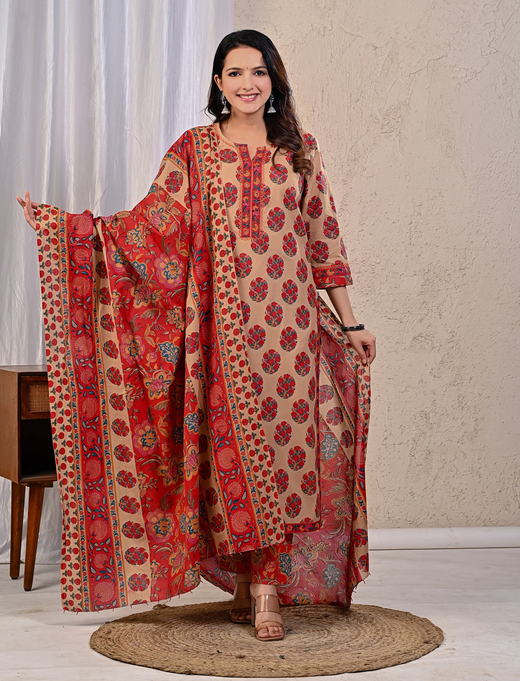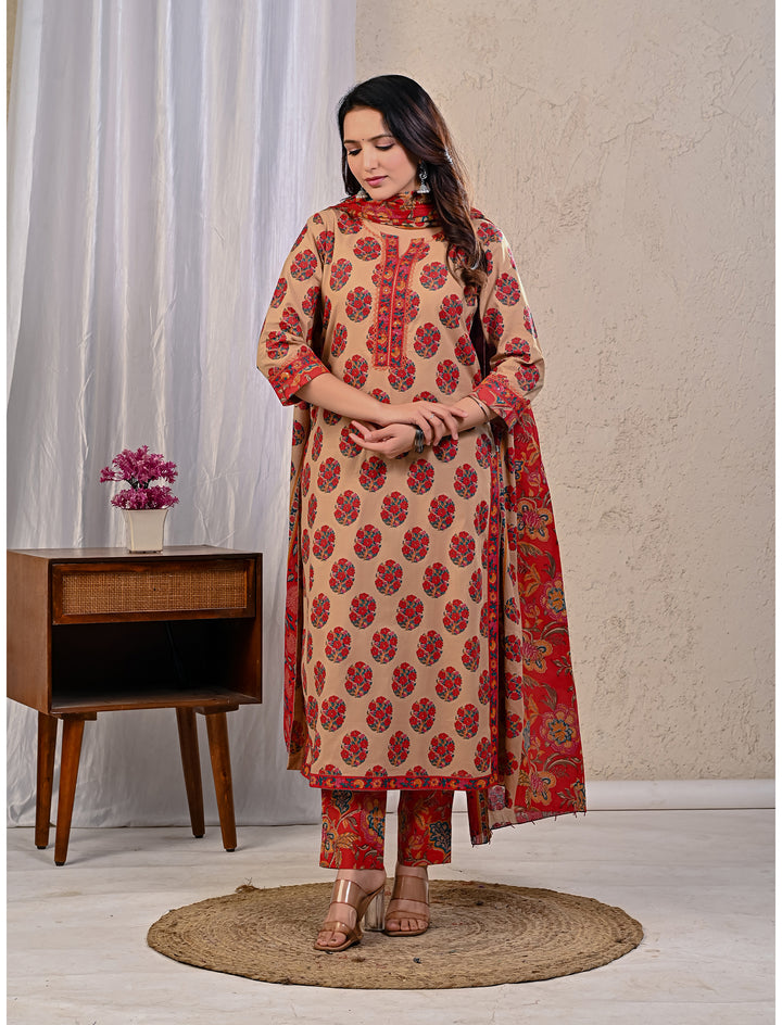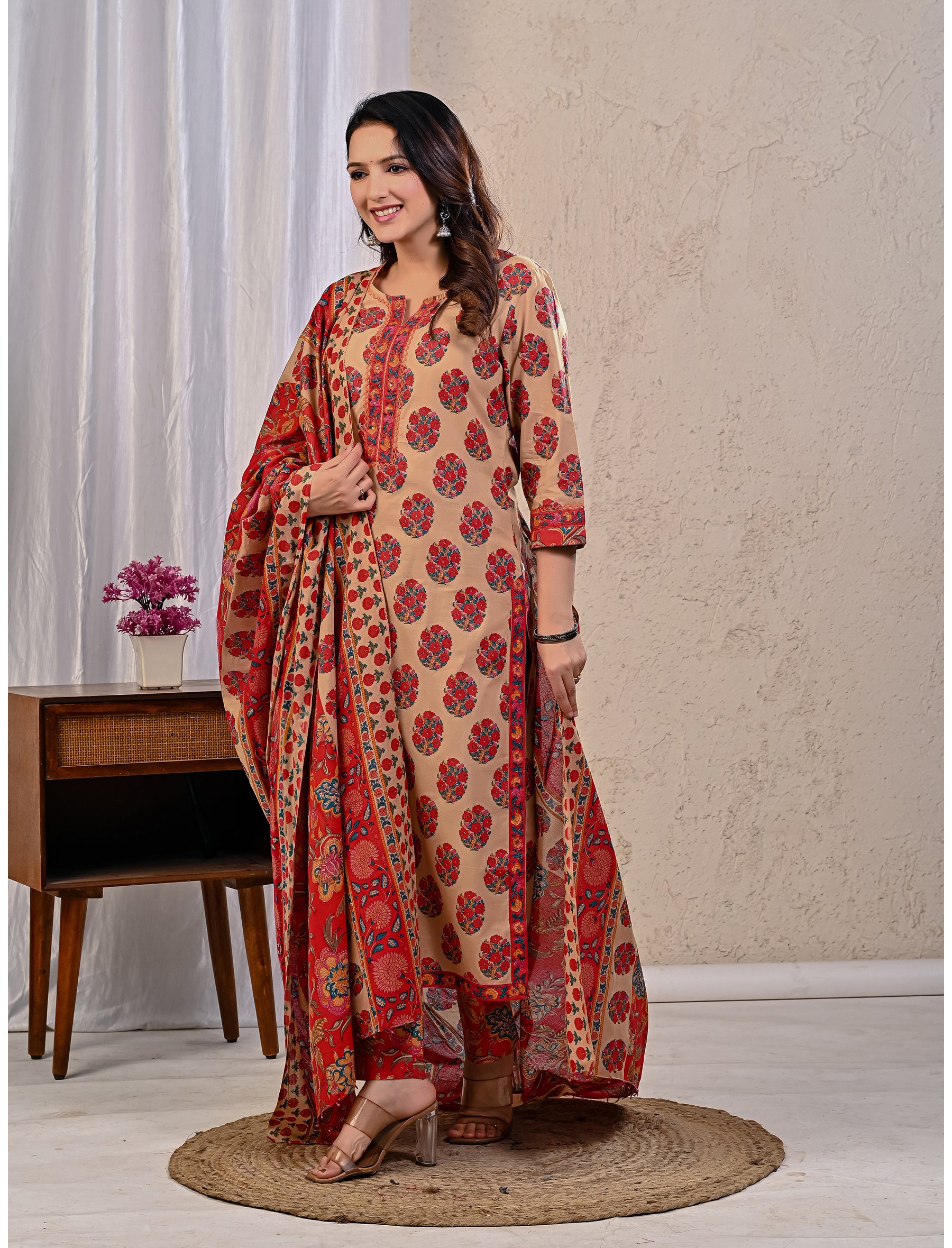 Beige Red Butta Block Printed Cotton Kurta Pant Set With Mulmul Dupatta