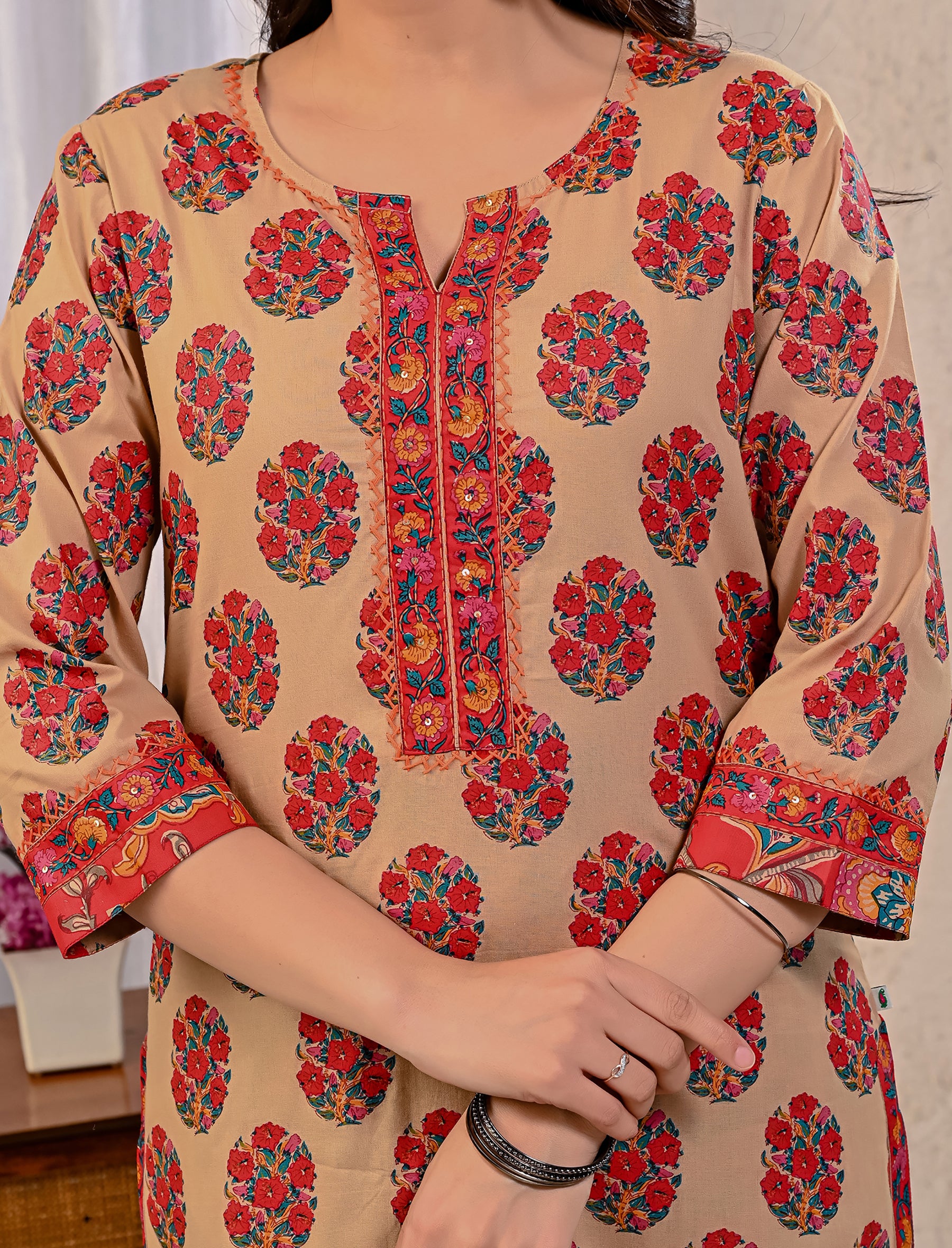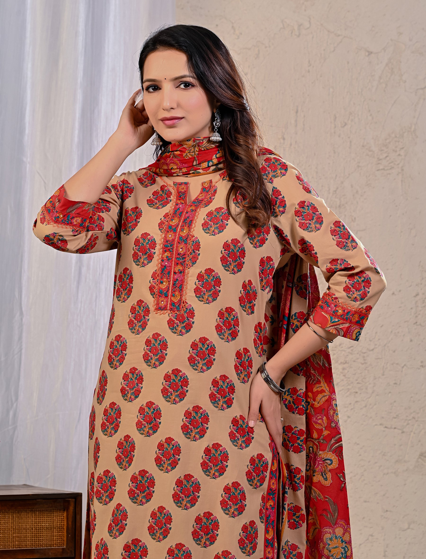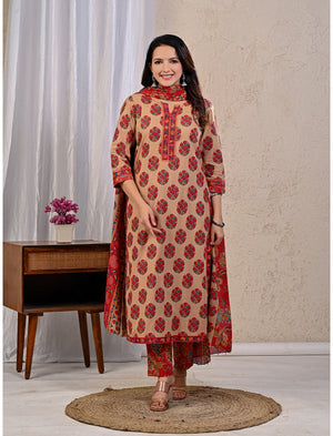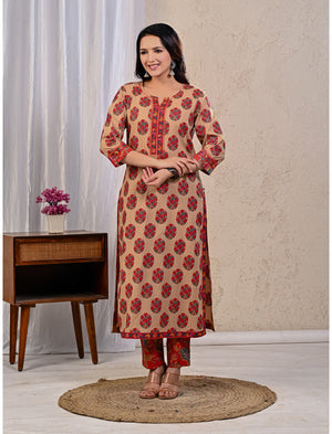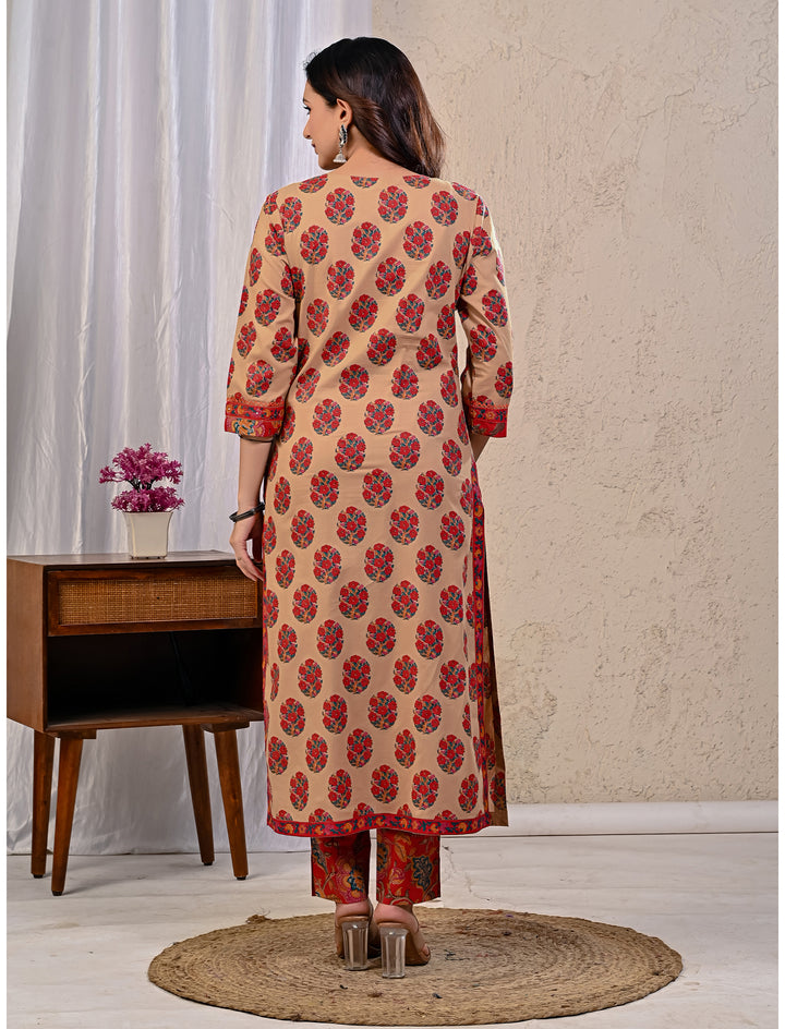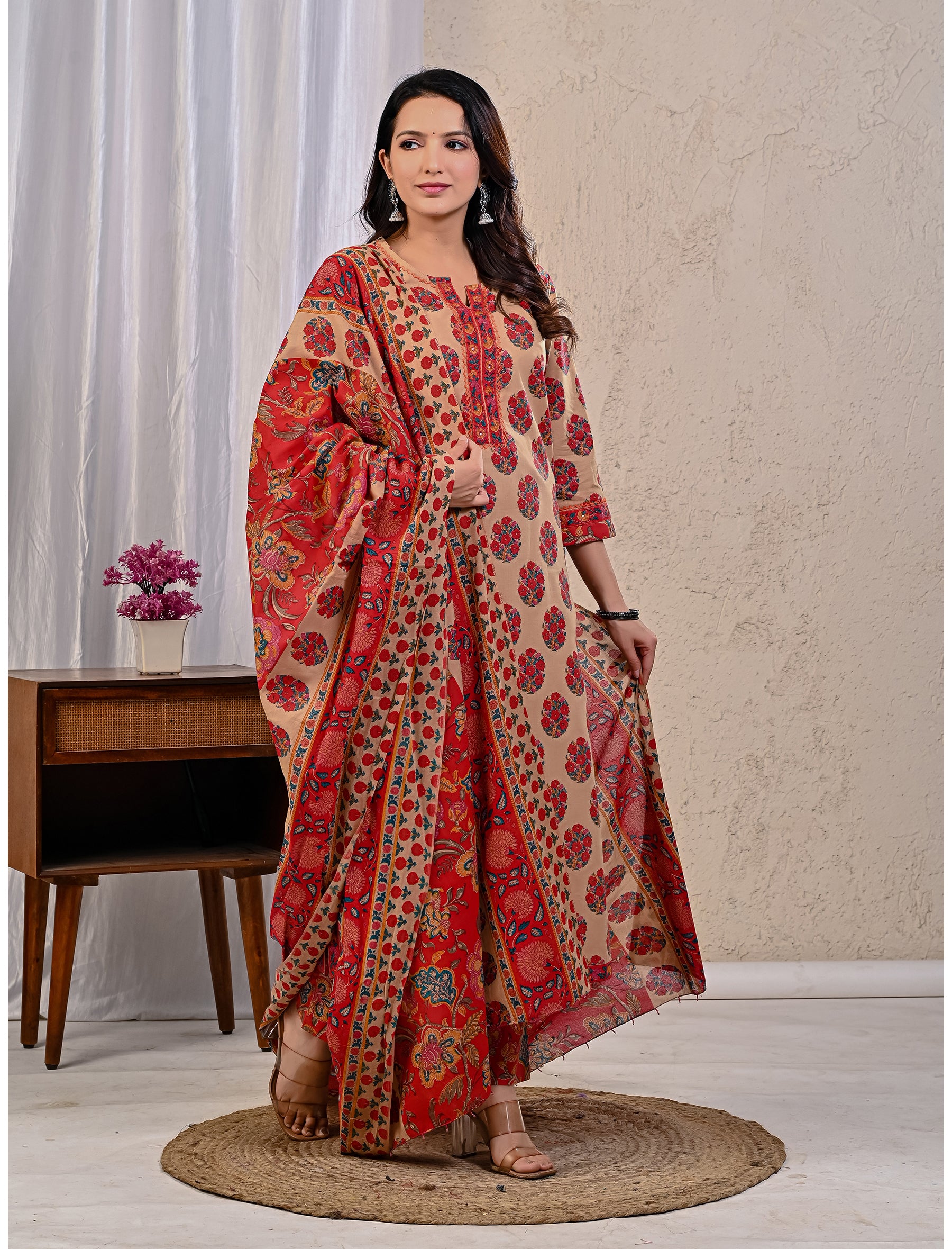Beige Red Butta Block Printed Cotton Kurta Pant Set With Mulmul Dupatta