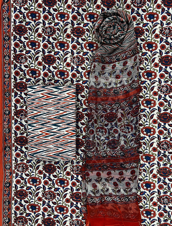 Block Khadi Printed Unstitched Suit Set With Chiffon Dupatta