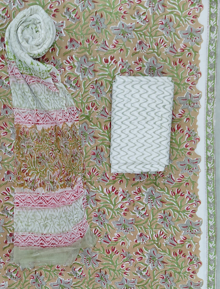 Block Printed Unstitched Dress Material With Chiffon Dupatta
