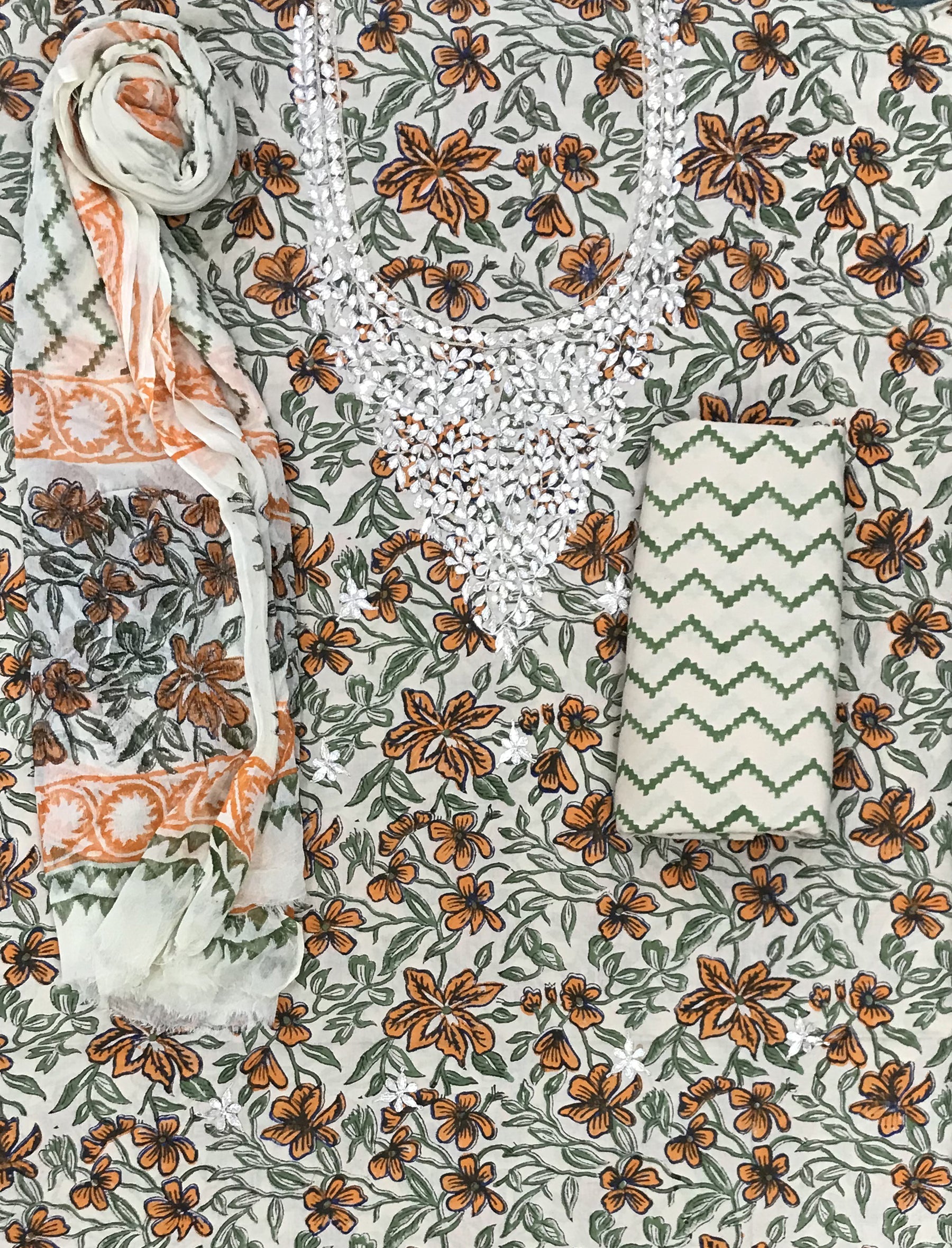 Block Printed Unstitched Dress Material With Hand Work