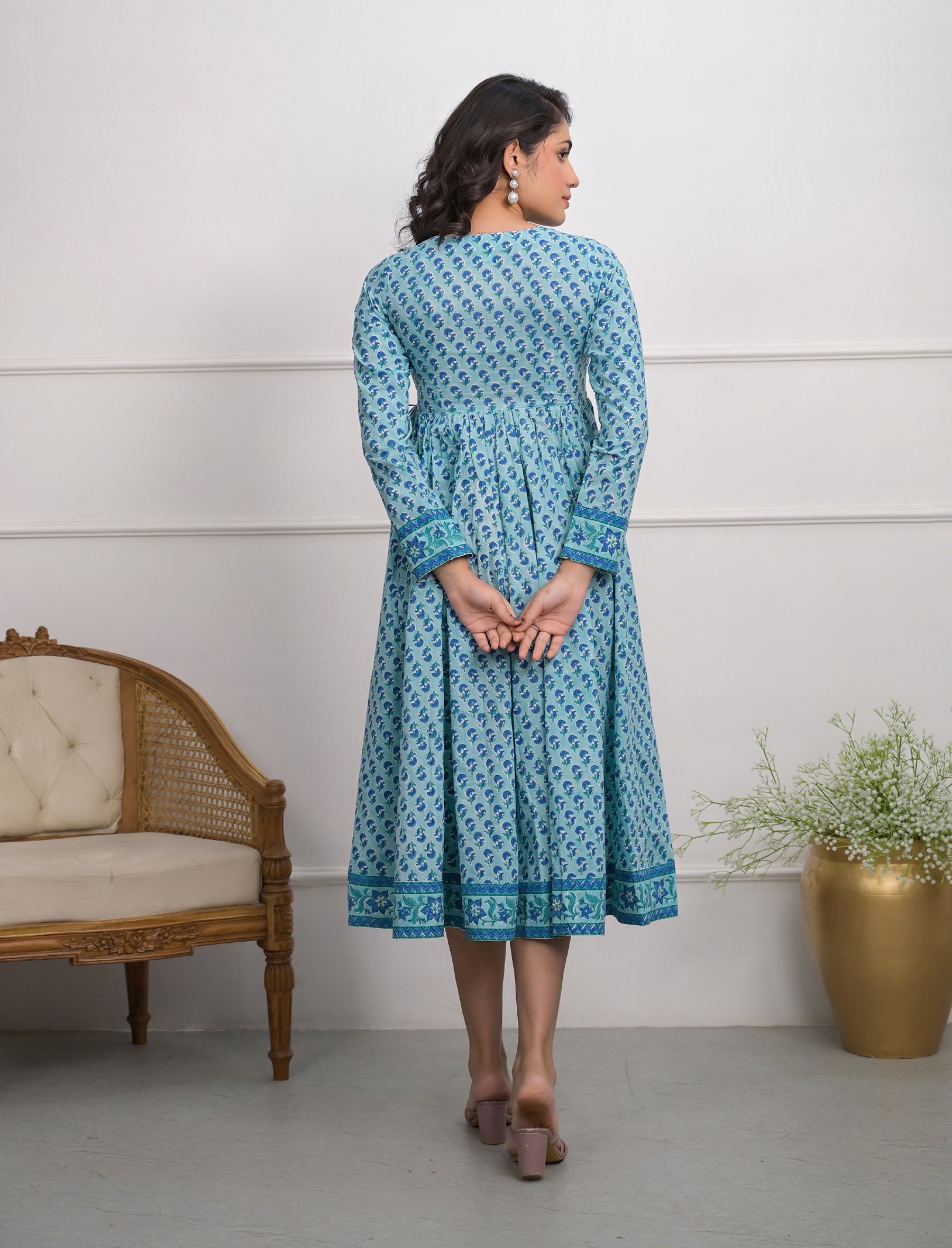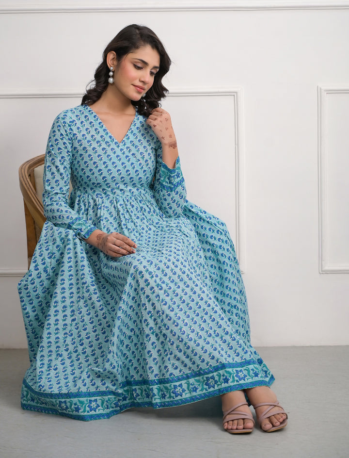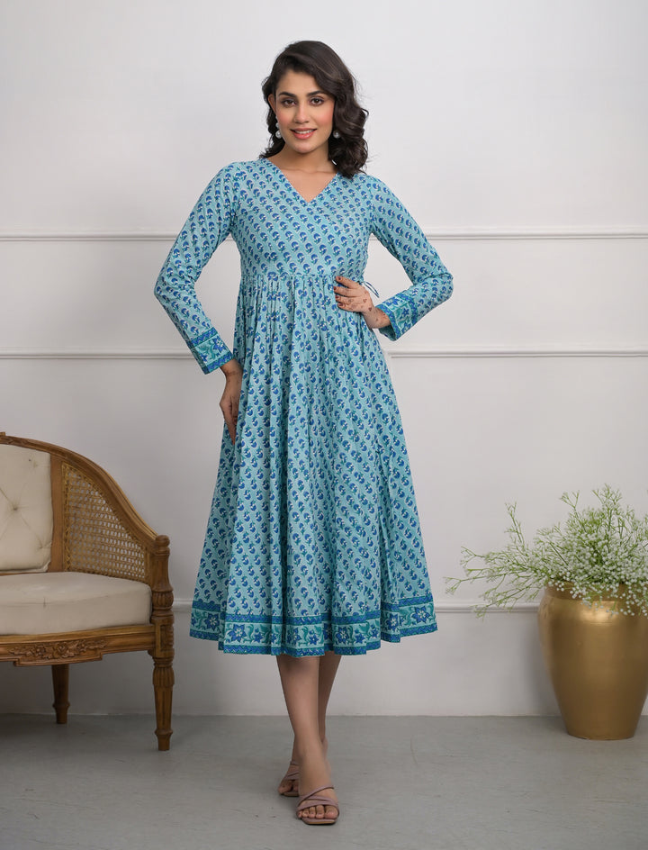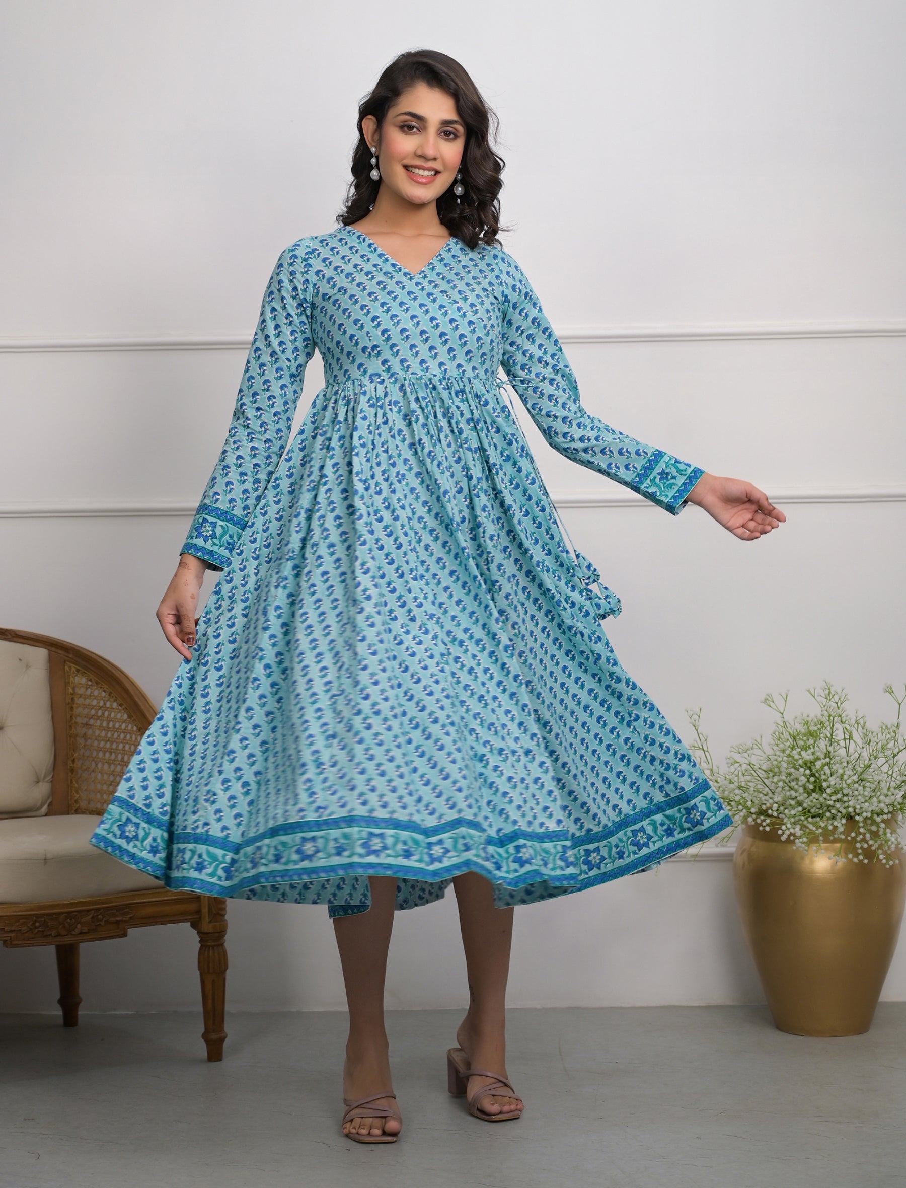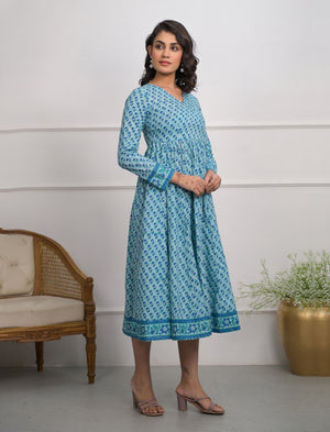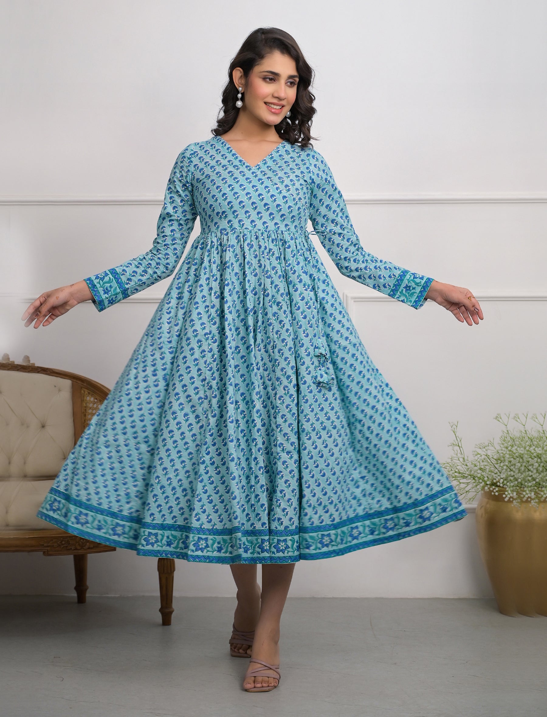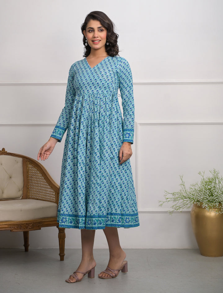 This printed dress is presented to you by Gulabchand Prints, A well-known brand in hand block prints from over 9 decades. This exclusively hand stitched dress is made of 100% pure cotton fabric with having printed prints over it. The dress is best suitable for you to showcase your women hood. Wear this at your ease and the fabric is so smooth to skin that you will love it and the attractive prints adds more charm to the same.
