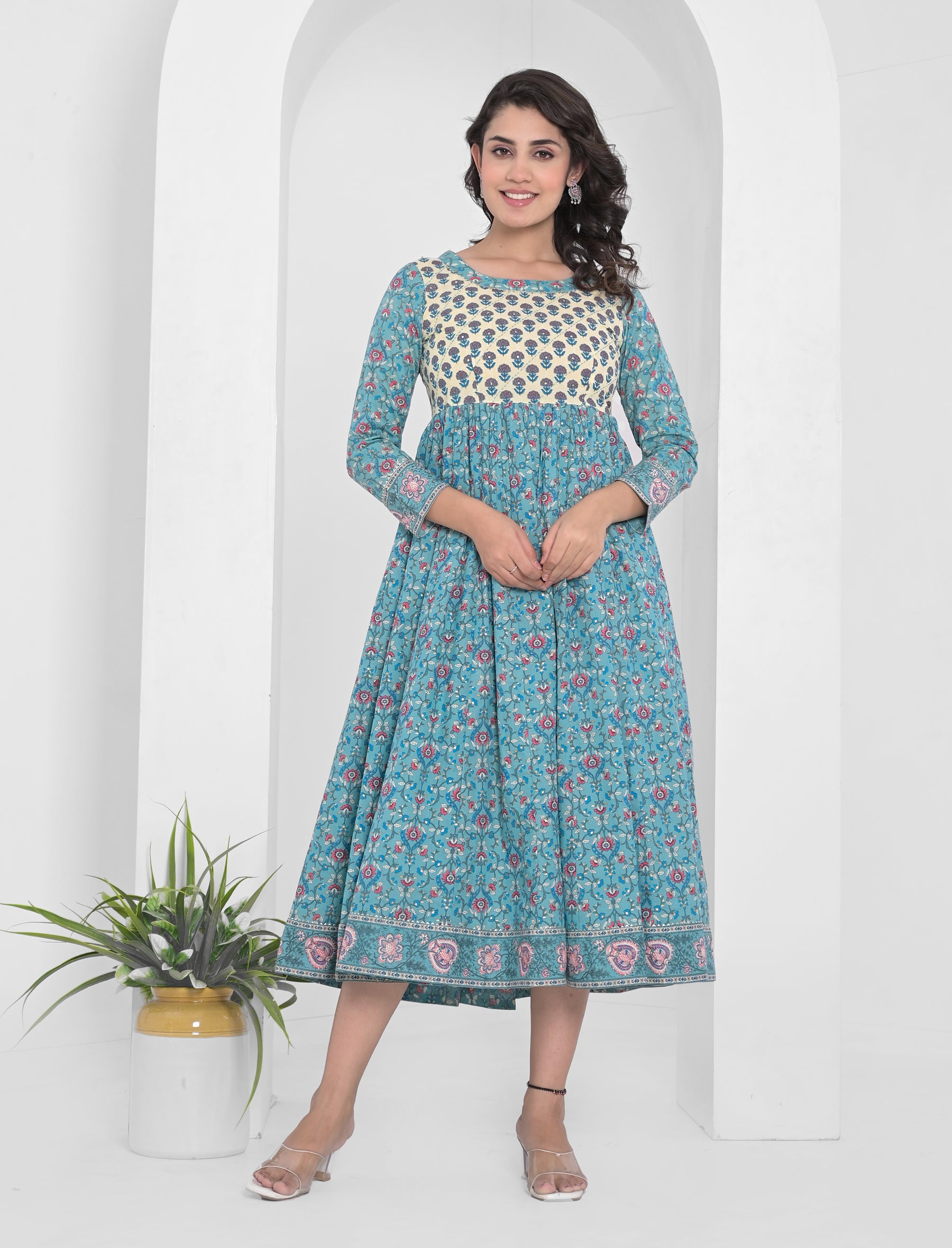 This printed ethnic wear dress is presented to you by Gulabchand Prints, A well-known brand in hand block prints from over 9 decades. This exclusively hand stitched dress is made of 100% pure cotton fabric with having printed prints over it. The dress is best suitable for you to showcase your women hood. Wear this at your ease and the fabric is so smooth to skin that you will love it and the attractive prints adds more charm to the same.