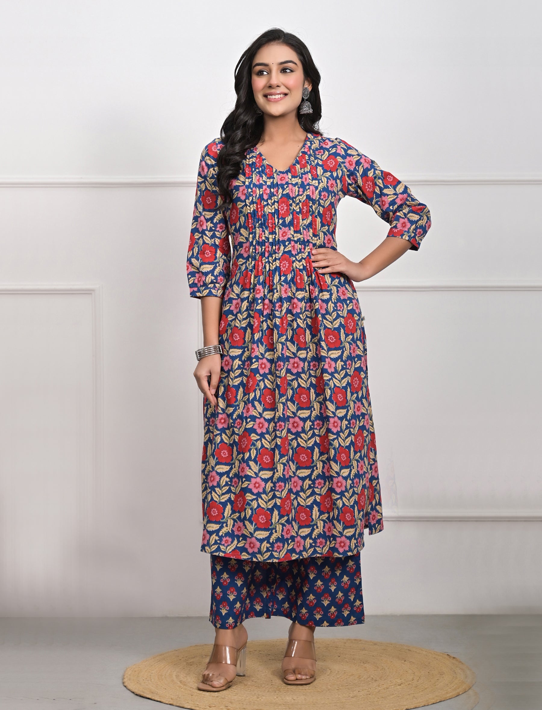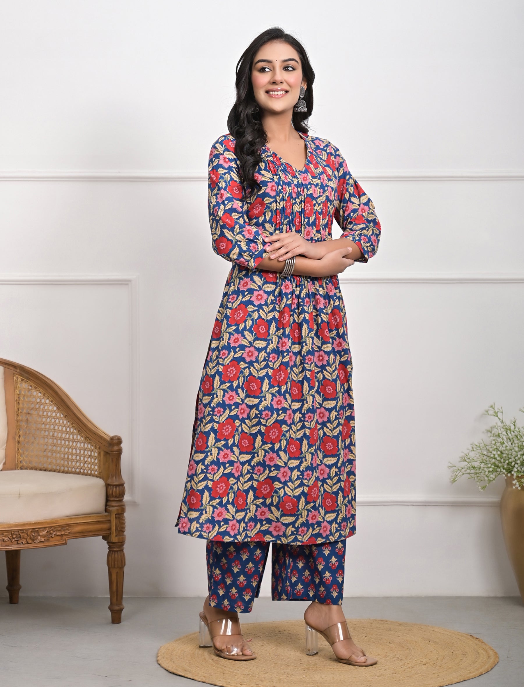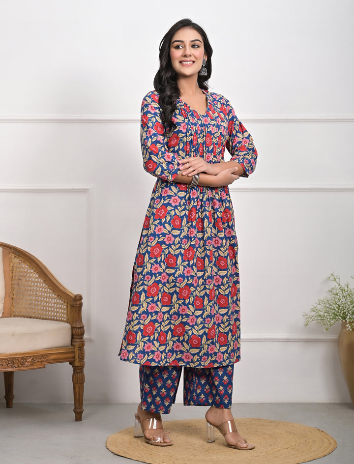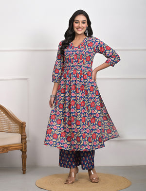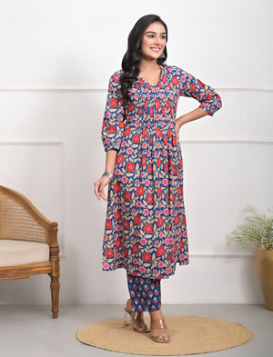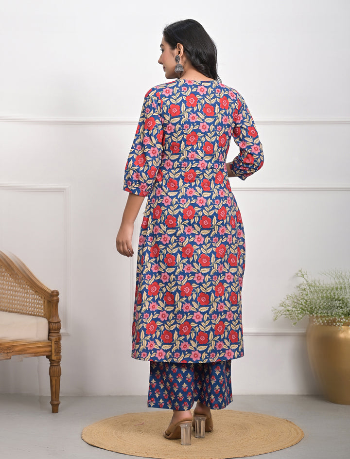 Blue Red Floral Block Printed Cotton Kurta Pant Set