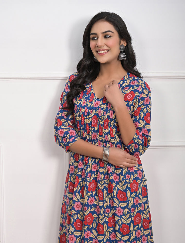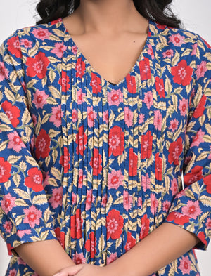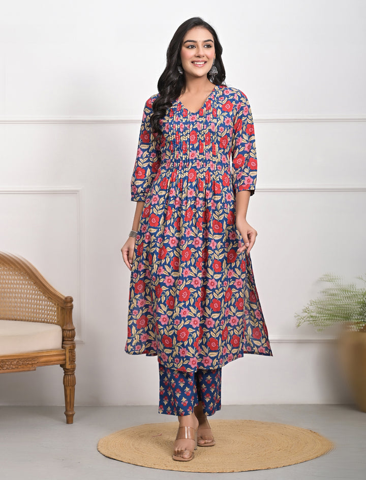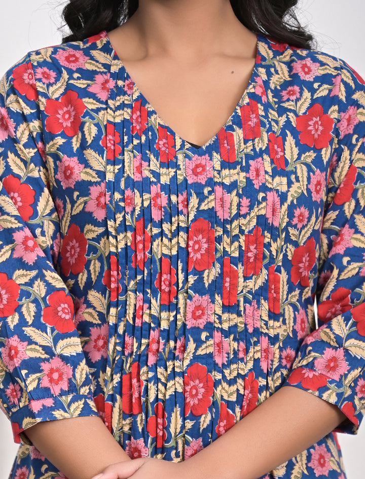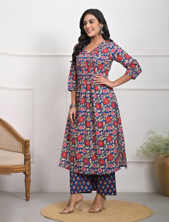 Blue Red Floral Block Printed Cotton Kurta Pant Set