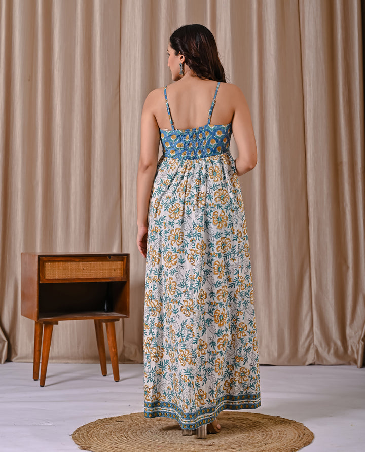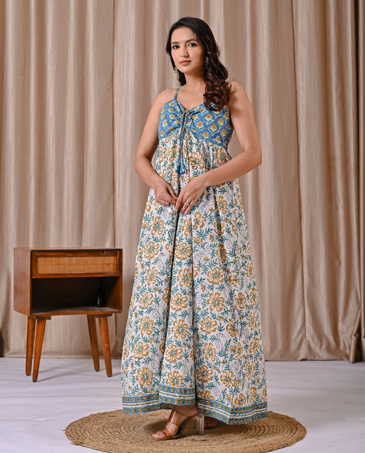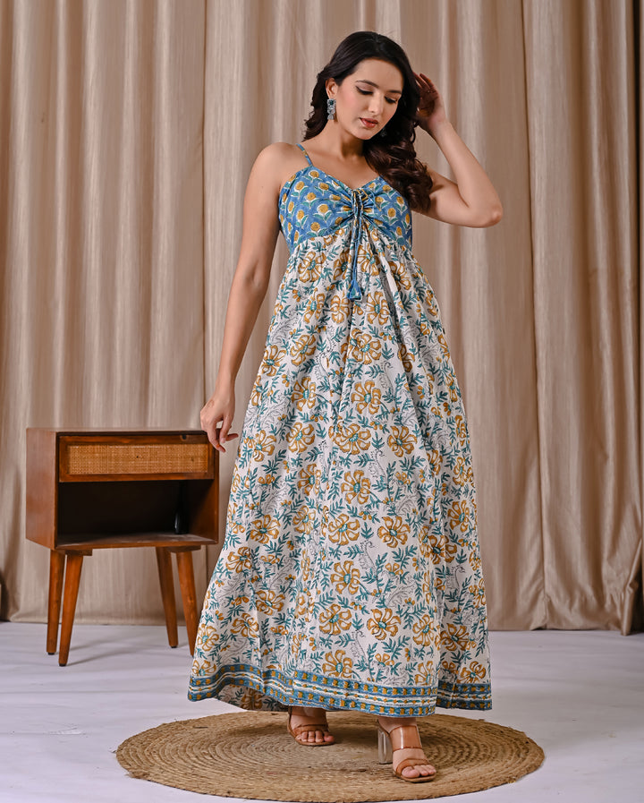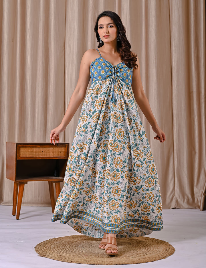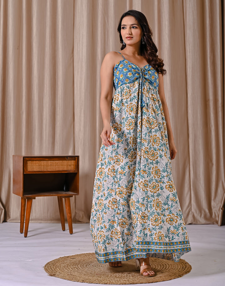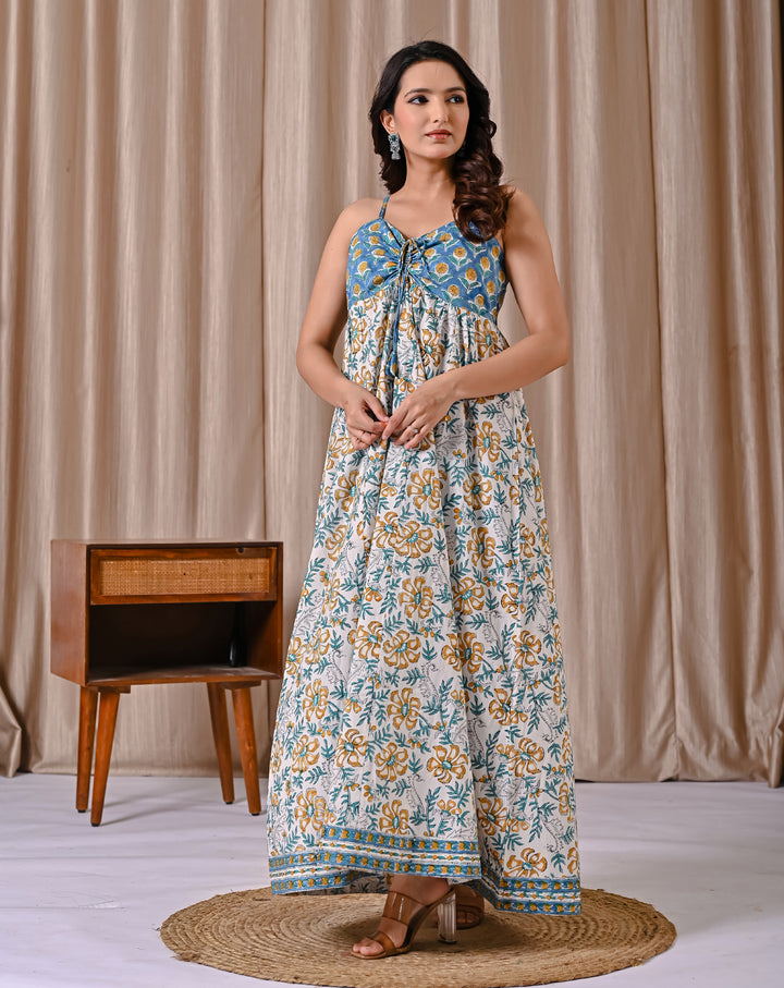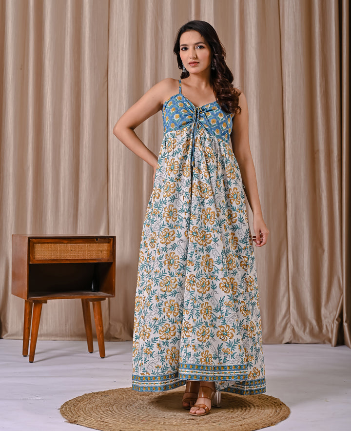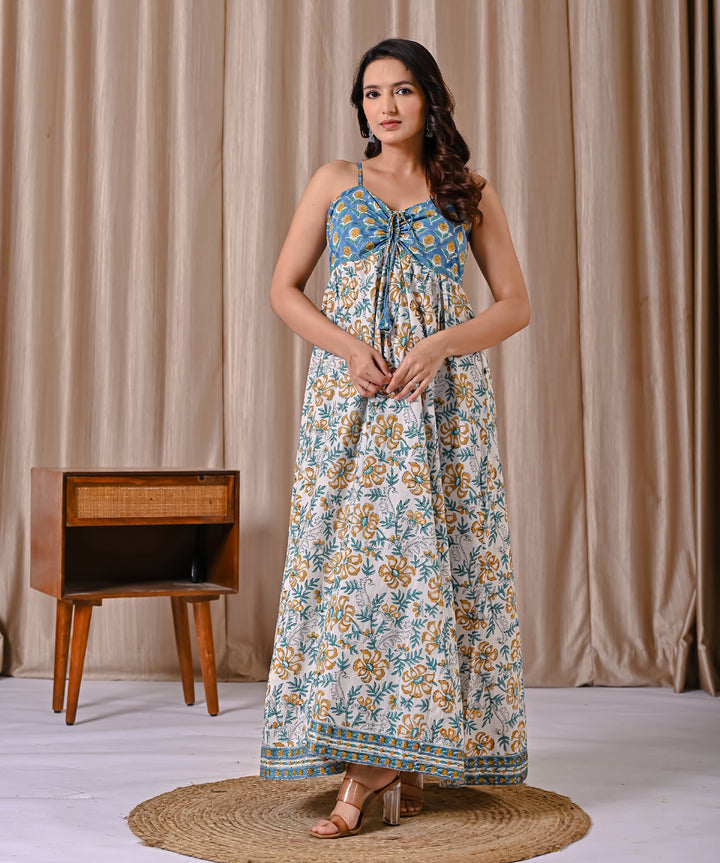 This Blue White Spaghetti Strap Block Printed Cotton Dress offers a comfortable and breathable fit, perfect for warm days. Its delicate block print adds a subtle, artistic touch to a classic white backdrop, while the spaghetti straps create a light, airy feel. Ideal for casual outings or relaxed gatherings, this dress combines style with ease, making it a versatile addition to your wardrobe.