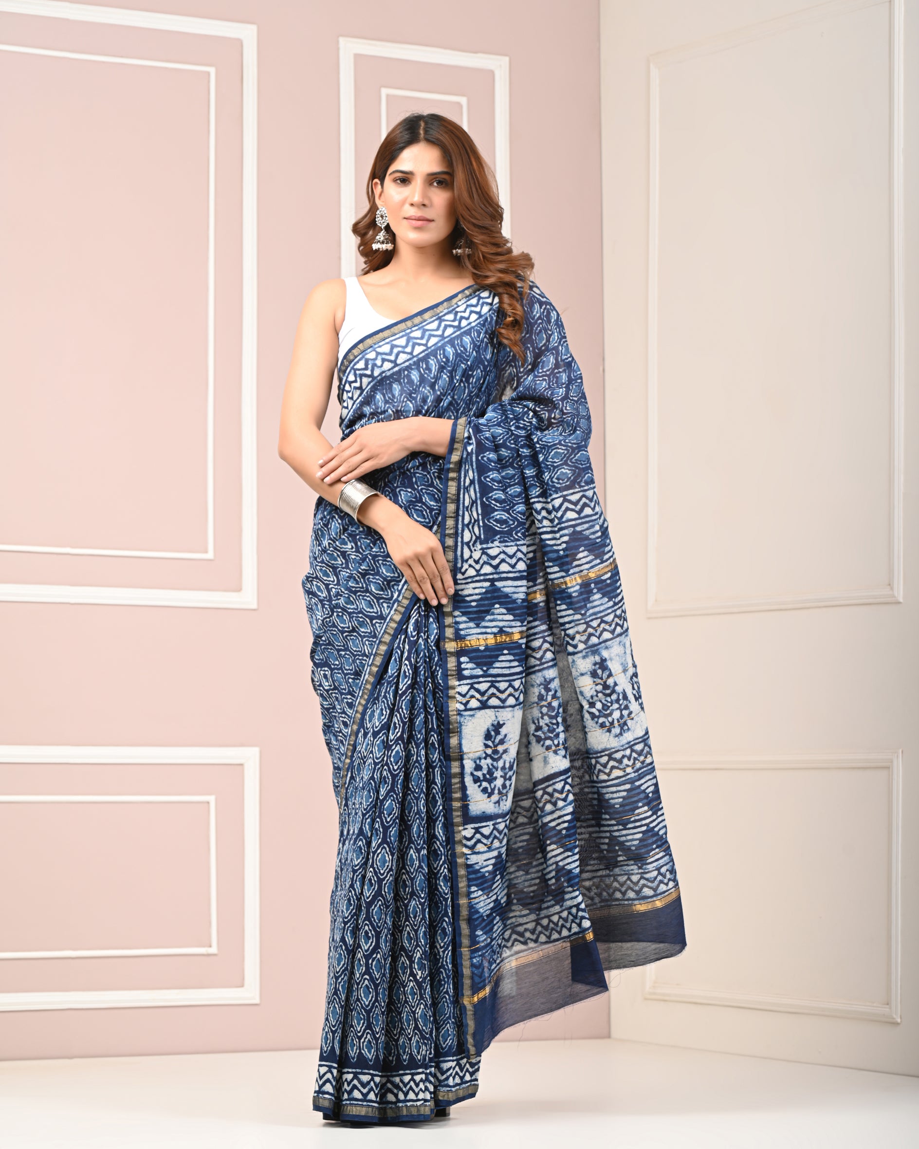 This printed saree is presented to you by Gulabchand Prints, A well-known brand in hand block prints from over 9 decades. This exclusively saree is made of 100% pure chanderi fabric with having printed prints over it. Attached with a blouse, this saree can be your perfect for your saree needs.