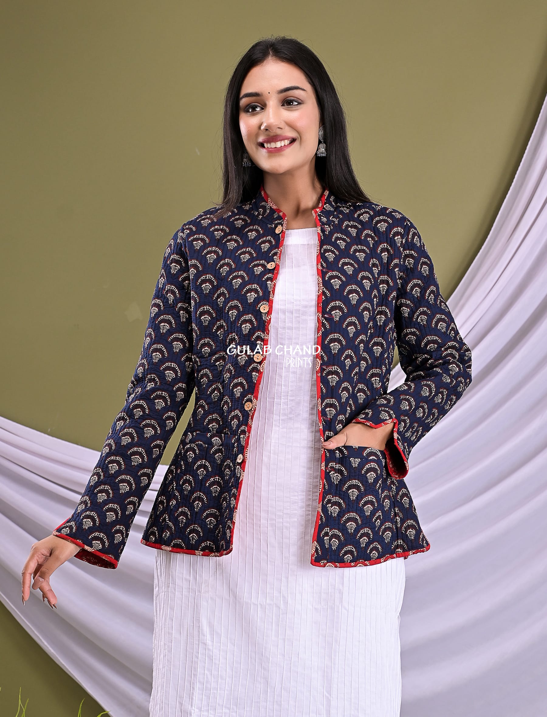 This printed jacket is presented to you by Gulabchand Prints, A well-known brand in hand block prints from over 9 decades. This exclusively hand stitched jacket is made of 100% pure cotton fabric with having printed prints over it. The jacket is best suitable for you to showcase your women hood. Wear this at your ease and the fabric is so smooth to skin that you will love it and the attractive prints adds more charm to the same.
