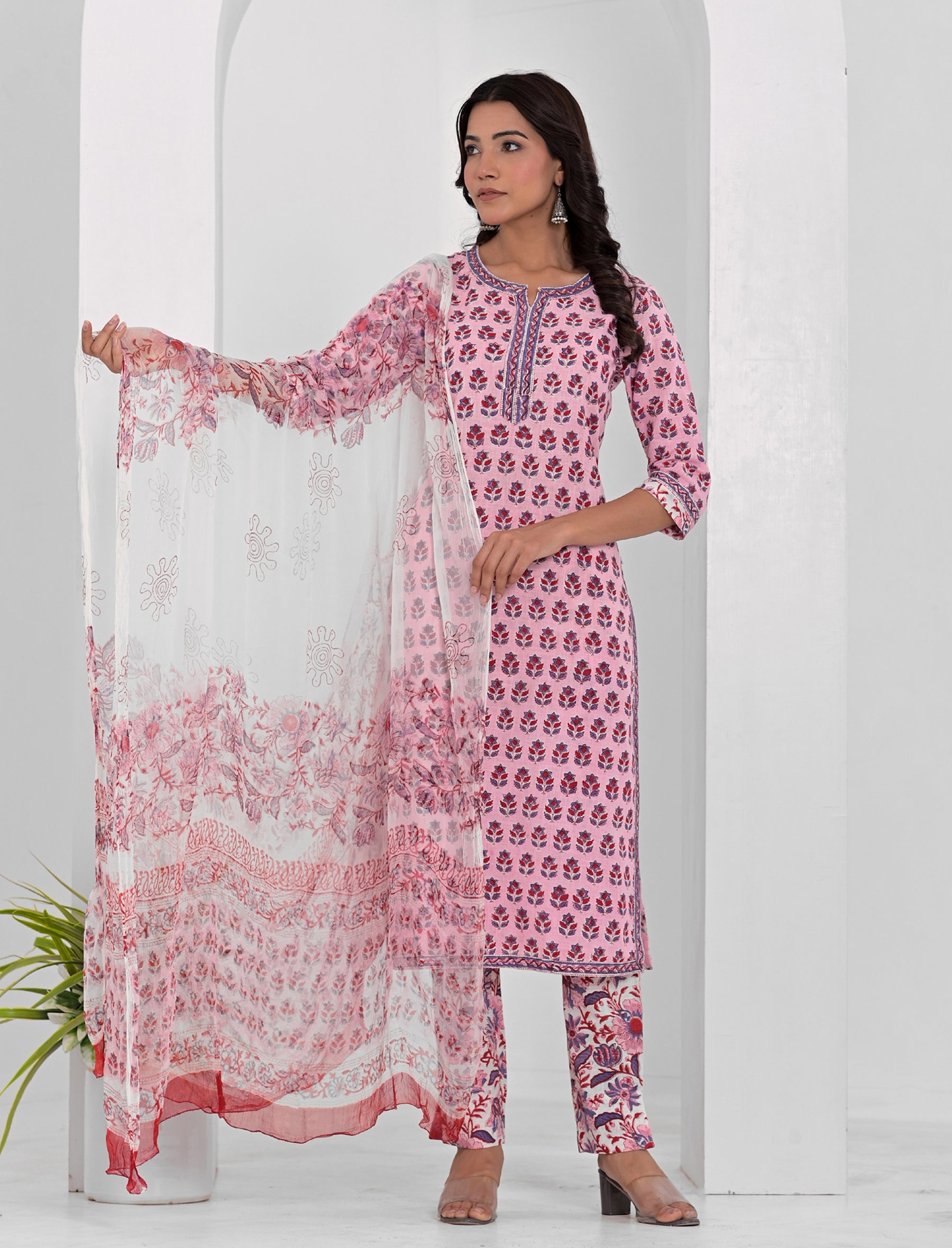 This printed ethnic wear kurta set is presented to you by Gulabchand Prints, A well-known brand in hand block prints from over 9 decades. This exclusively hand stitched kurta set is made of 100% pure cotton fabric with having printed prints over it. The kurta set is best suitable for you to showcase your women hood. Wear this at your ease and the fabric is so smooth to skin that you will love it and the attractive prints adds more charm to the same.