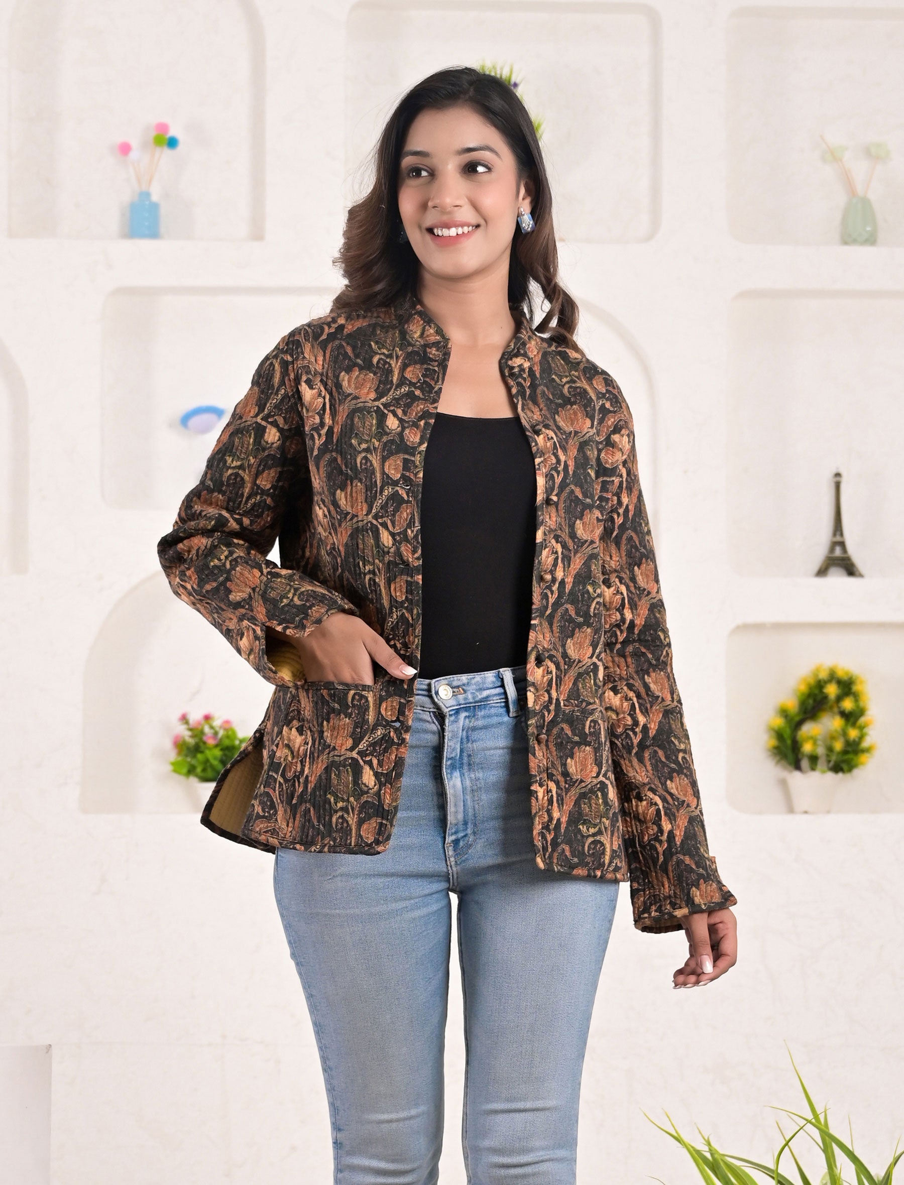 This printed jacket is presented to you by Gulabchand Prints, A well-known brand in hand block prints from over 9 decades. This exclusively hand stitched jacket is made of 100% pure silk fabric with having printed prints over it. The jacket is best suitable for you to showcase your women hood. Wear this at your ease and the fabric is so smooth to skin that you will love it and the attractive prints adds more charm to the same.