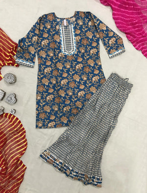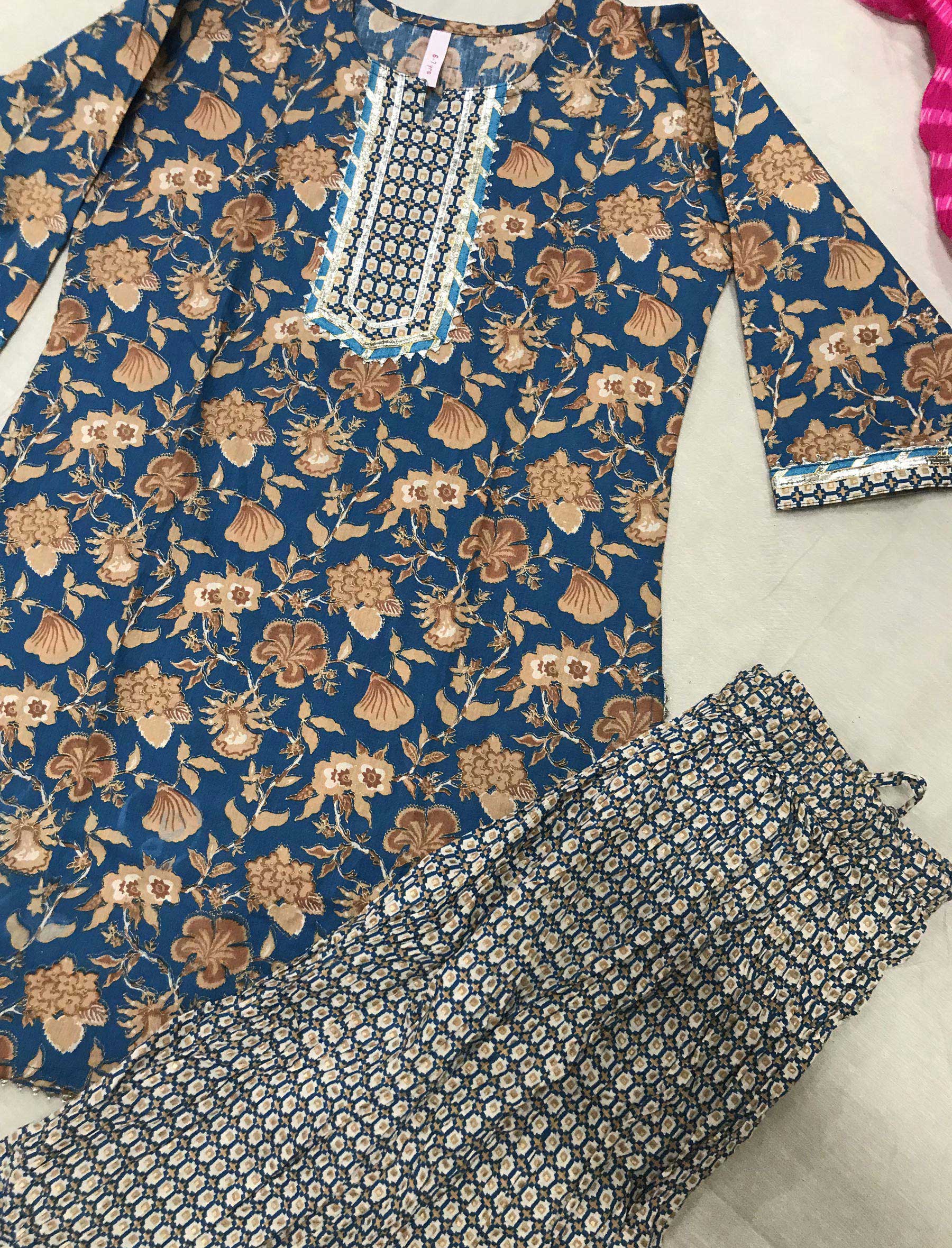 This hand block printed cotton kurta pant set for kids is presented to you by Gulabchand Prints, A well-known brand in hand block prints from over 9 decades. This exclusively hand stitched set is made of 100% pure cotton fabric with having hand block printed prints over it. Wear this at your ease and the fabric is so smooth to skin that you will love it and the attractive prints adds more charm to the same.