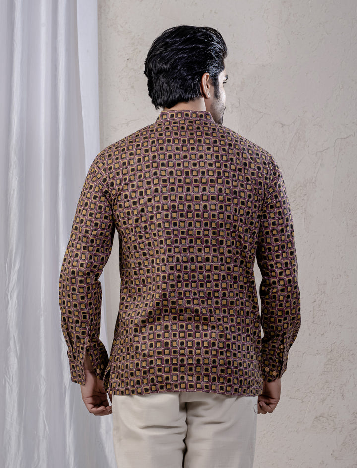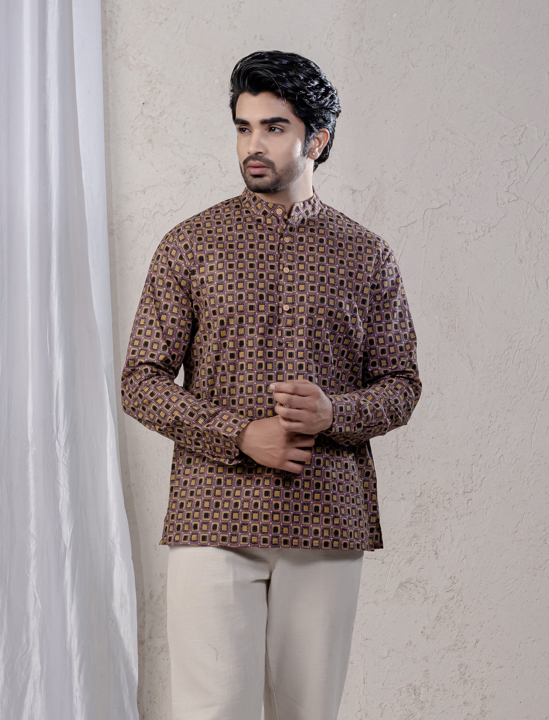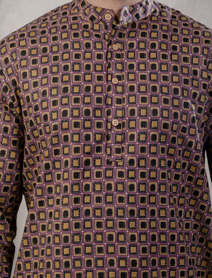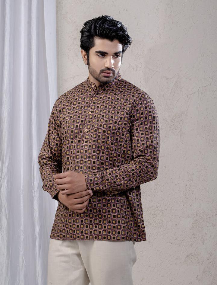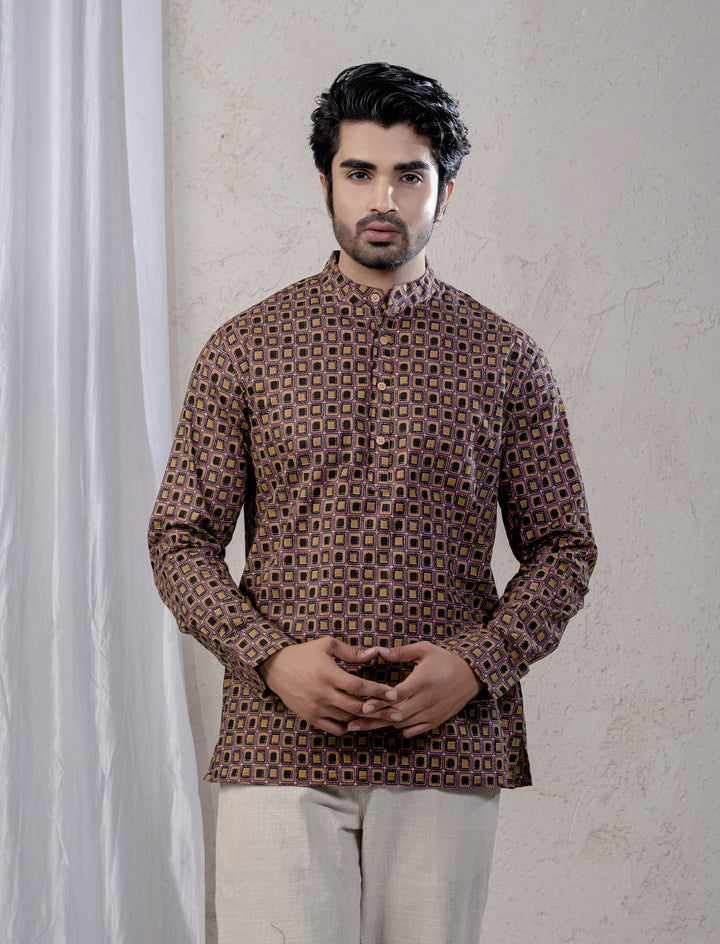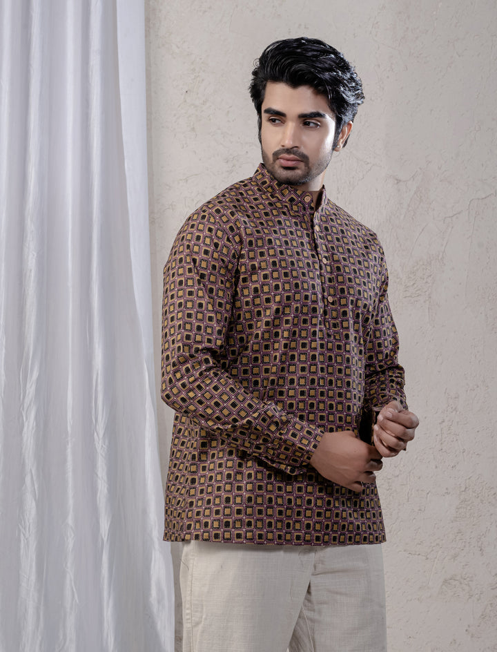 Cotton Printed Full Sleeves Short Kurta For Men
