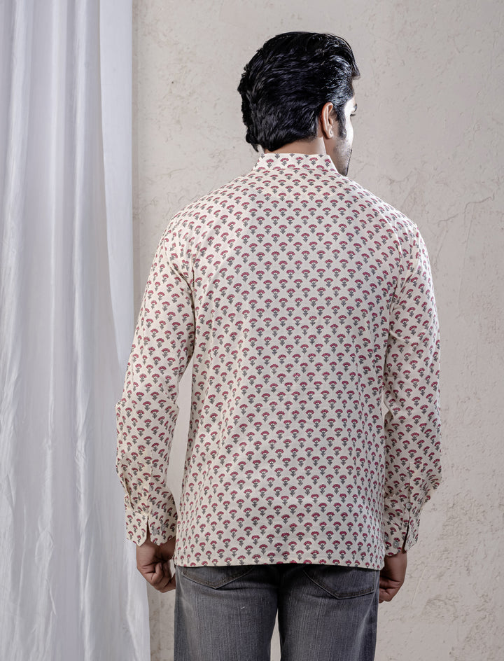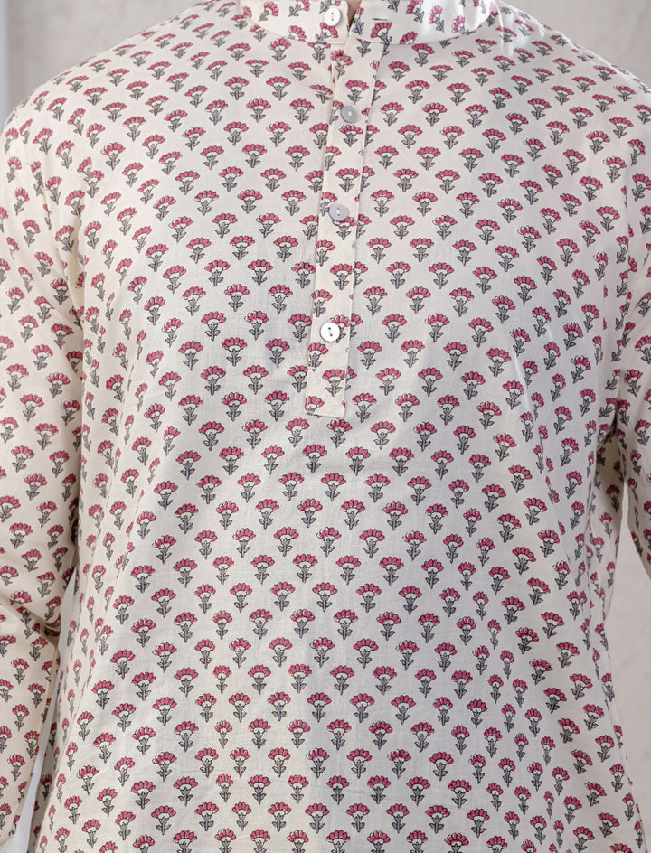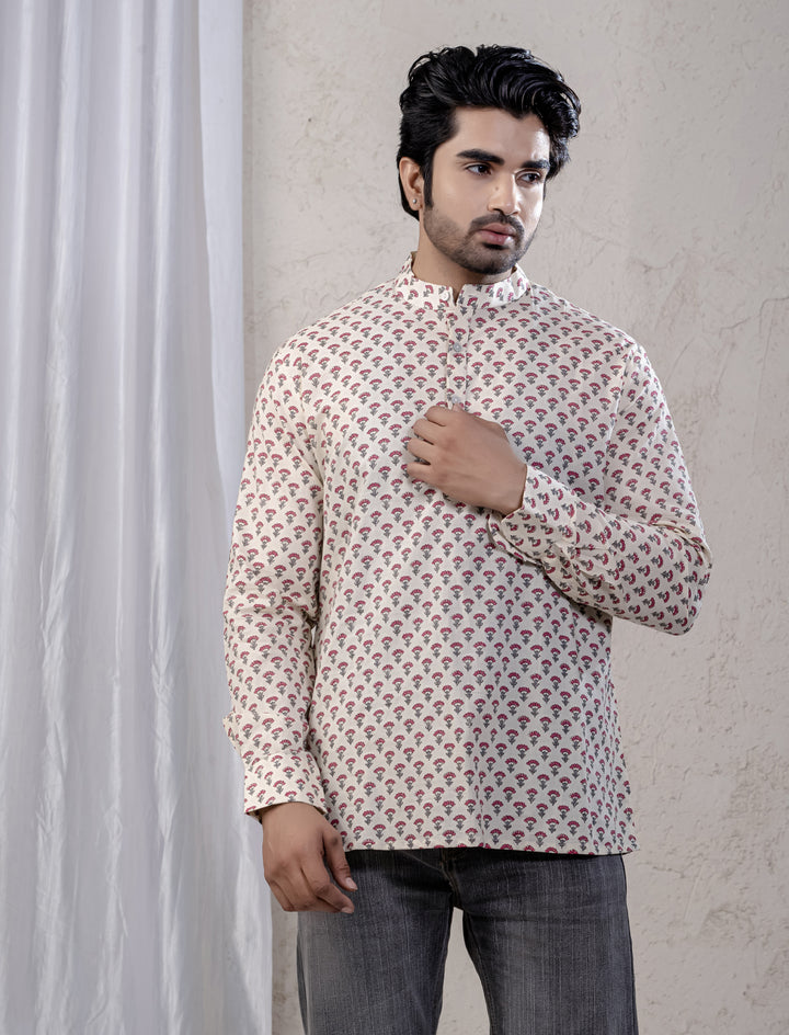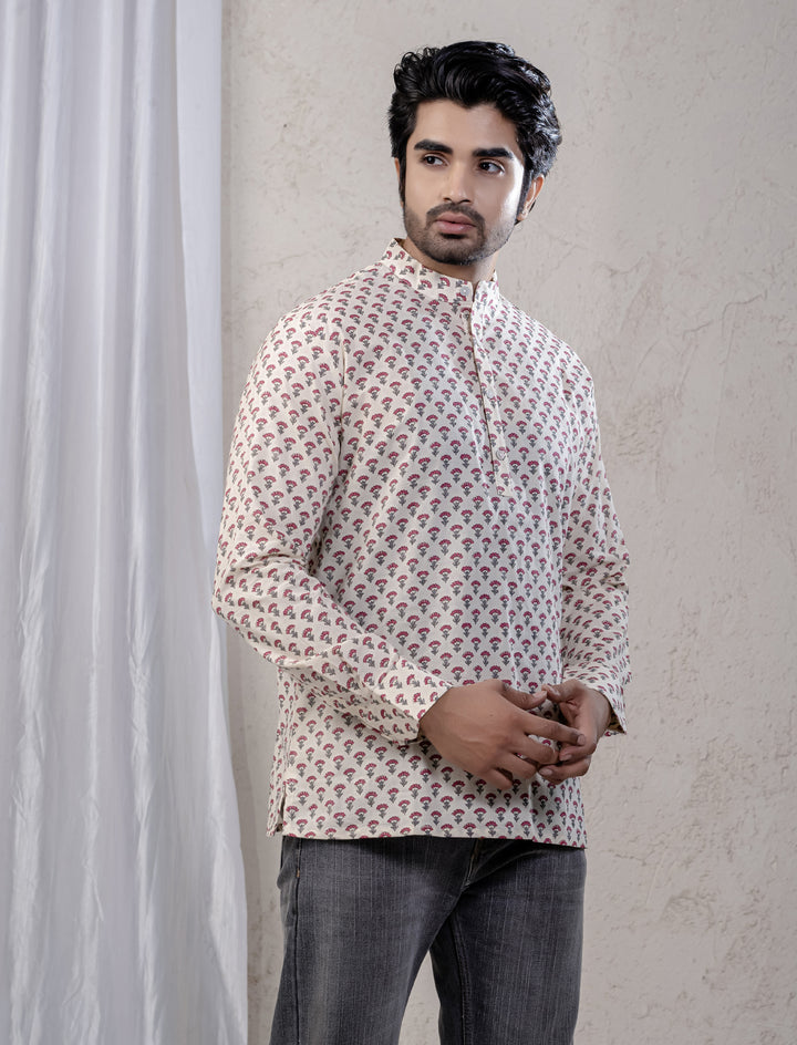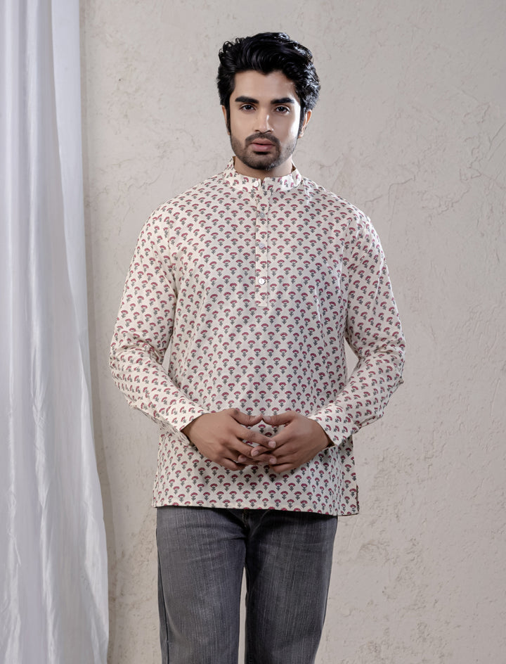 Cotton Printed Full Sleeves Short Kurta For Men