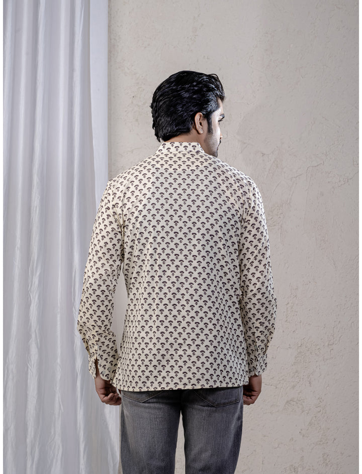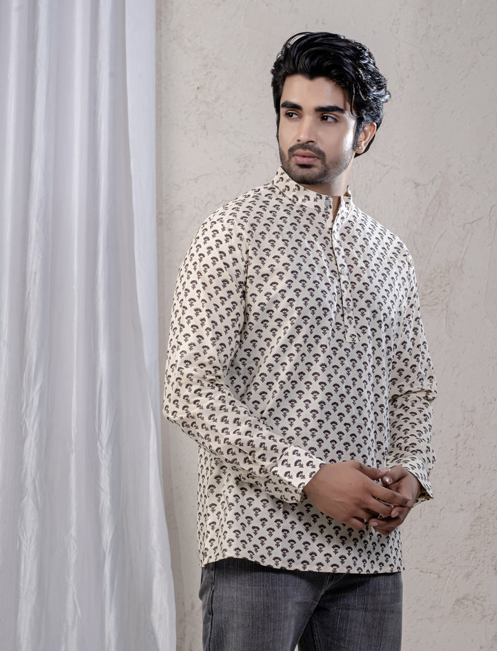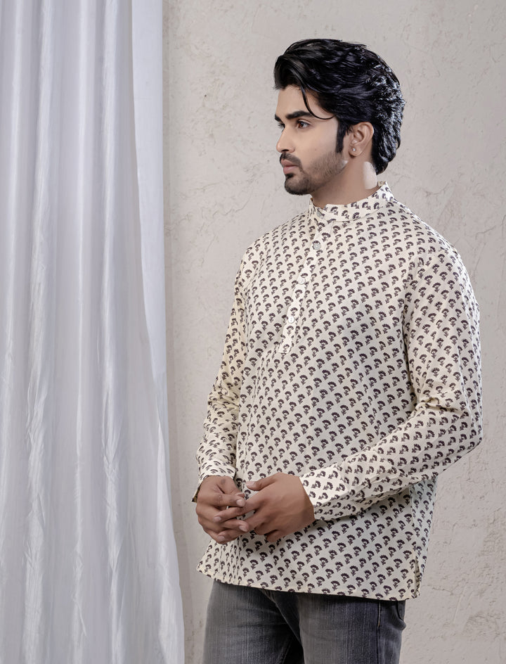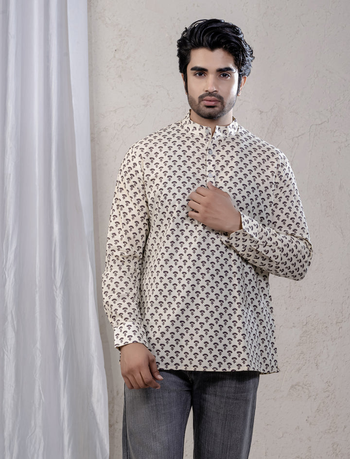 Cotton Printed Full Sleeves Short Kurta For Men
