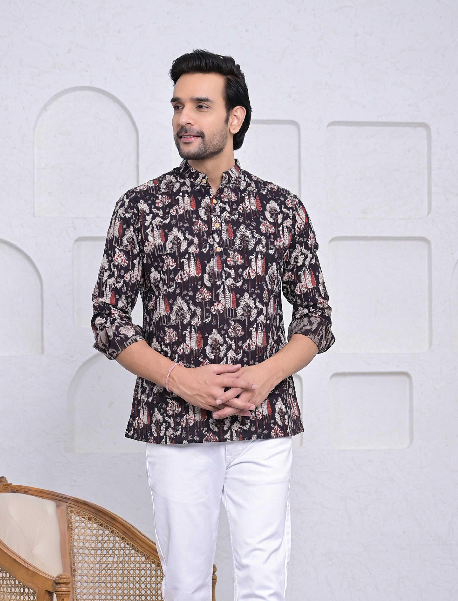 Cotton Printed Full Sleeves Short Kurta For Men