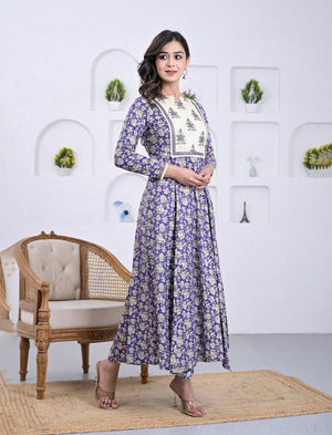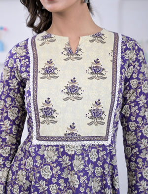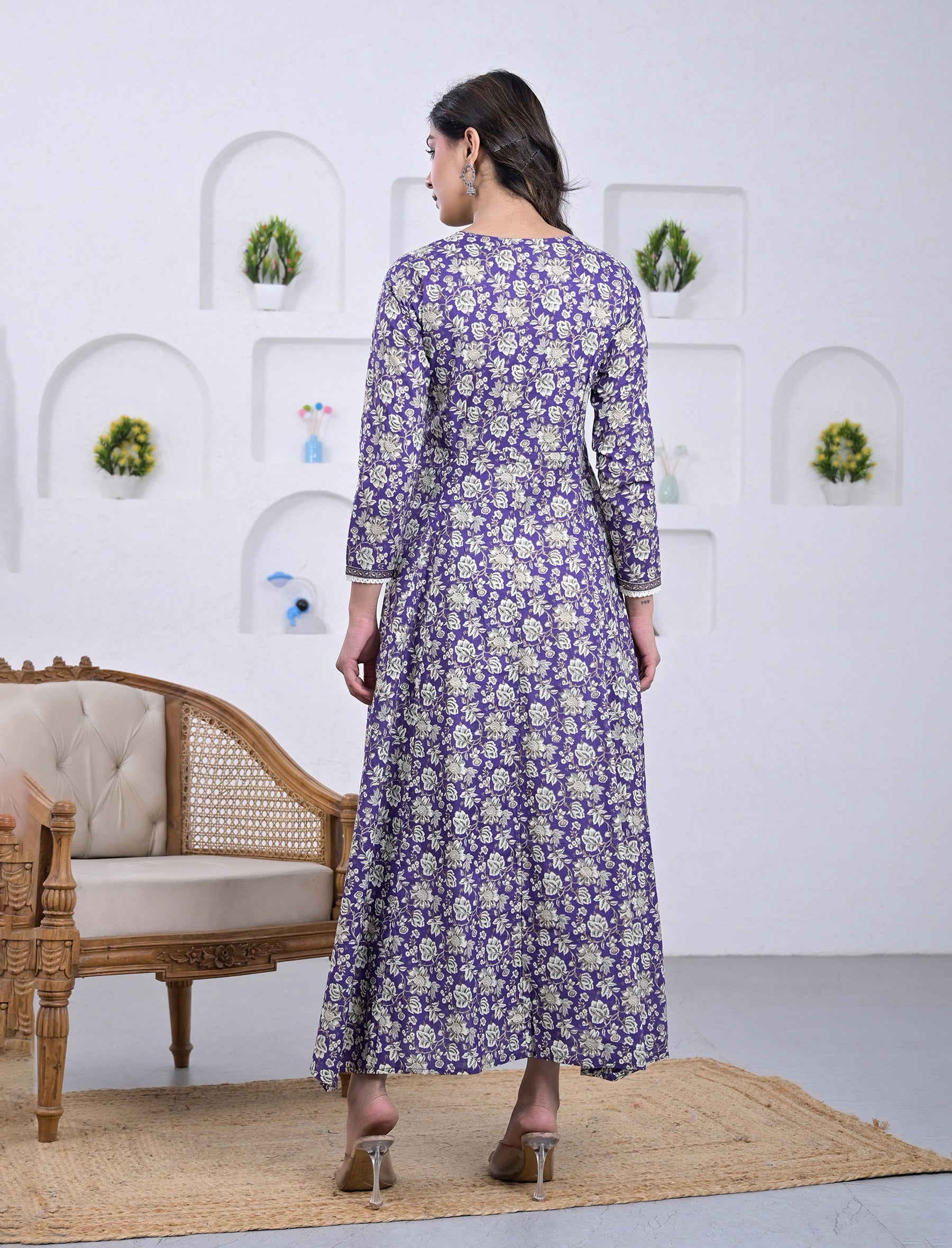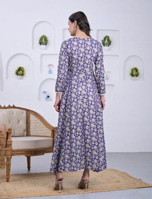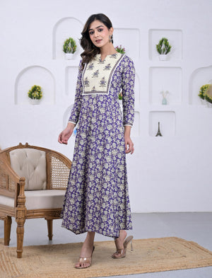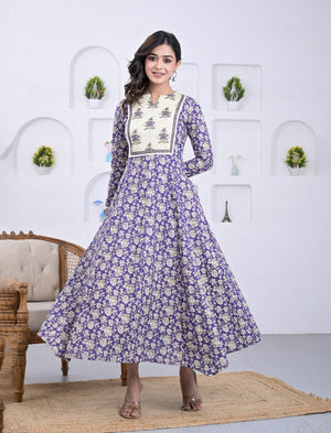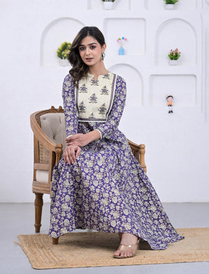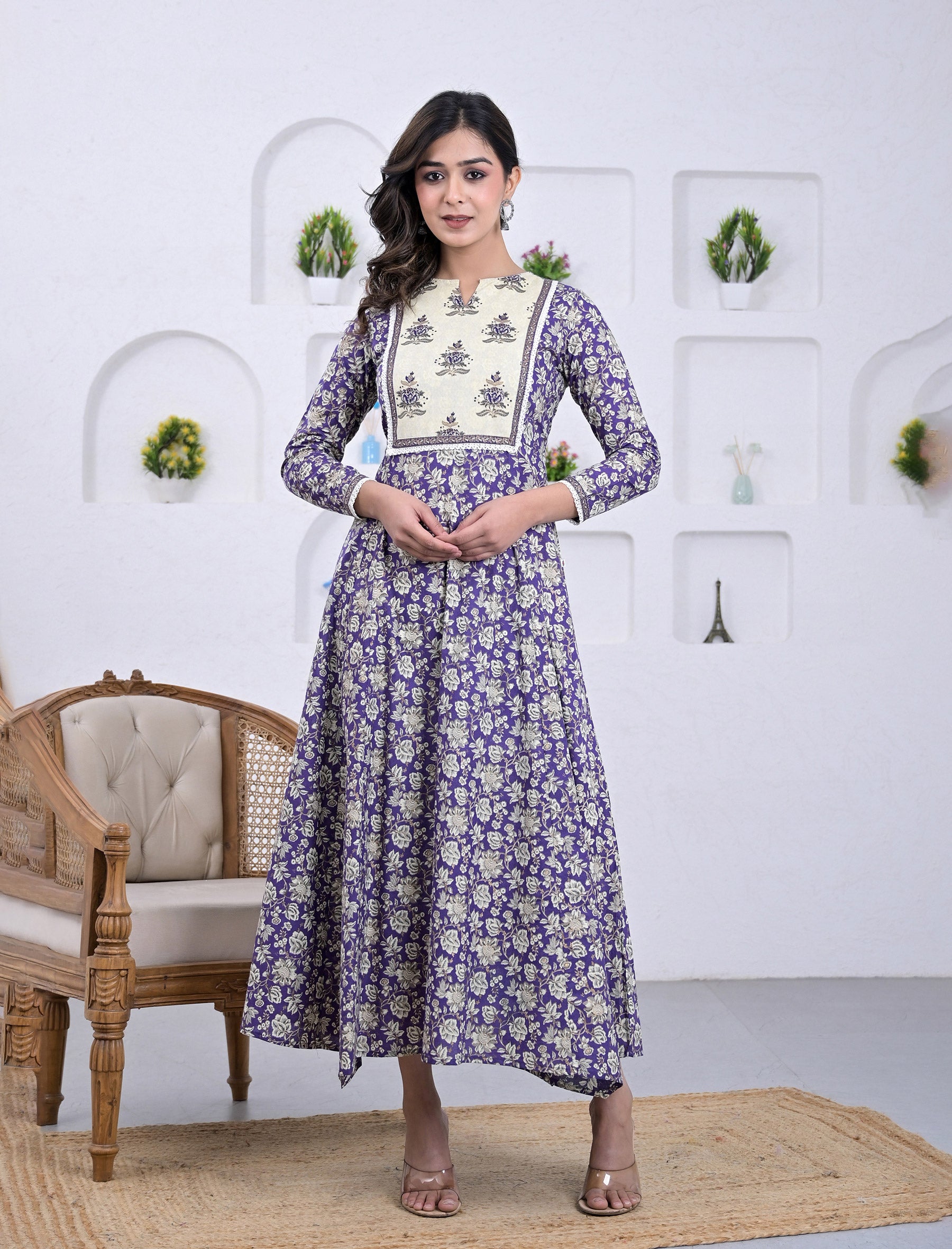 This printed ethnic wear dress is presented to you by Gulabchand Prints, A well-known brand in hand block prints from over 9 decades. This exclusively hand stitched dress is made of 100% pure cotton fabric with having printed prints over it. The dress is best suitable for you to showcase your women hood. Wear this at your ease and the fabric is so smooth to skin that you will love it and the attractive prints adds more charm to the same.