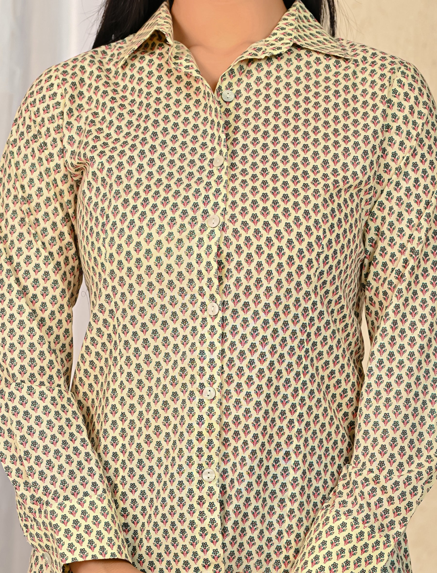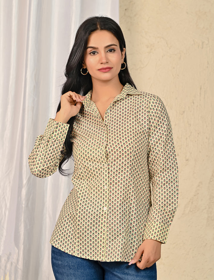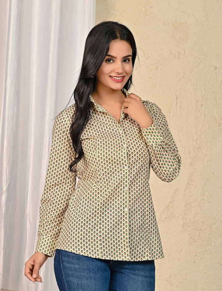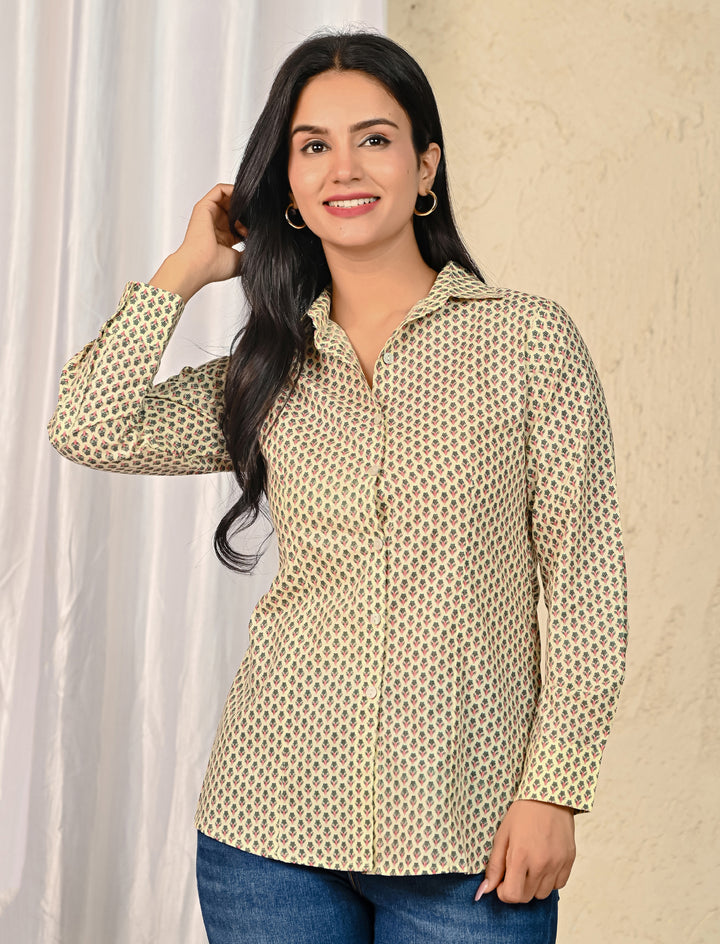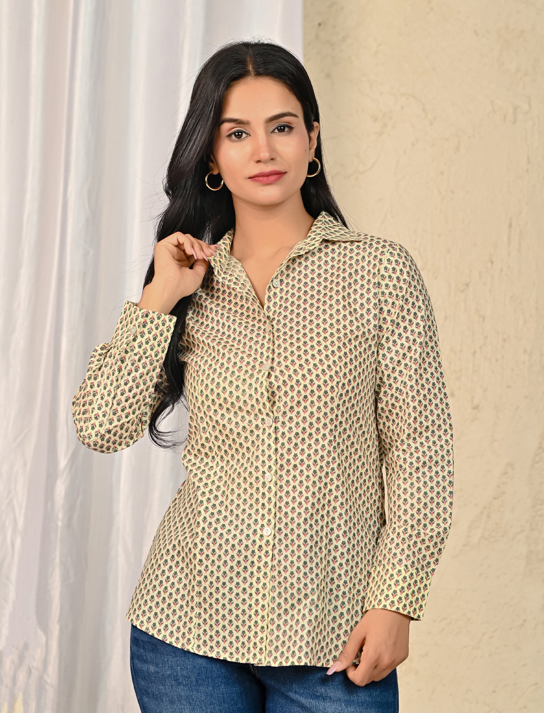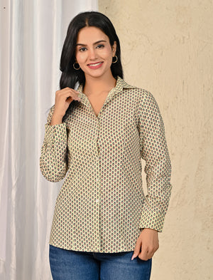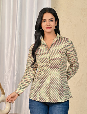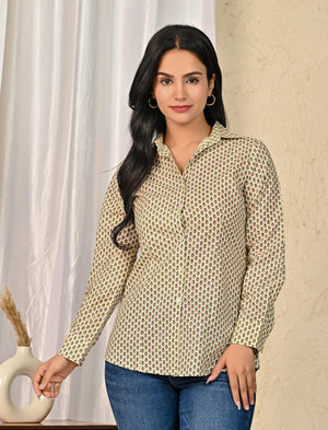 Cream Cotton Printed Full Sleeves Shirt For Women