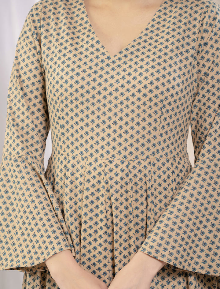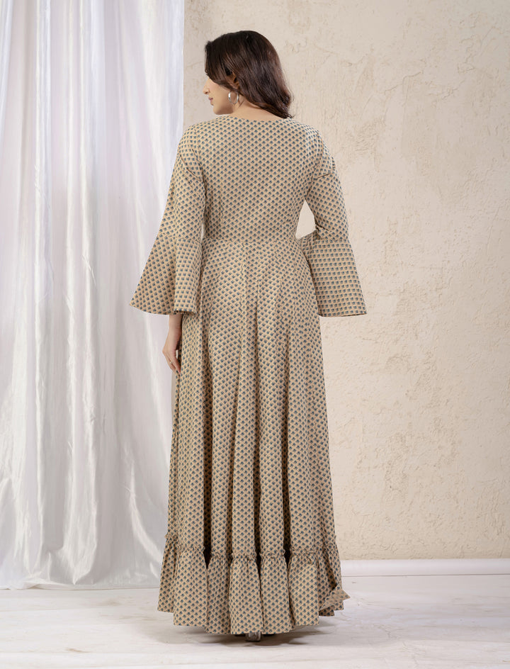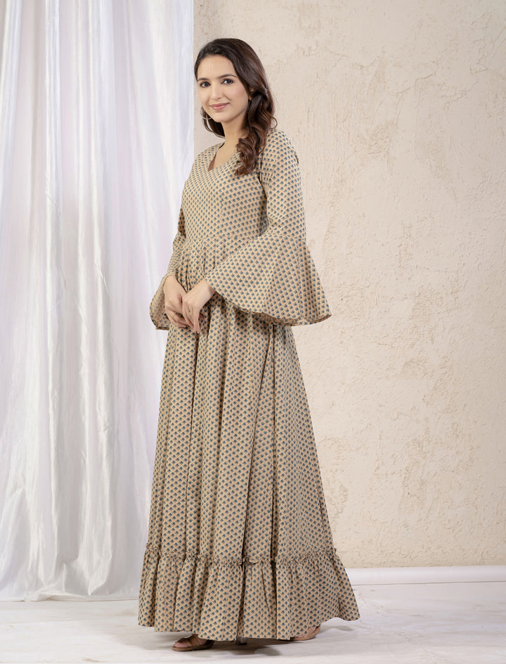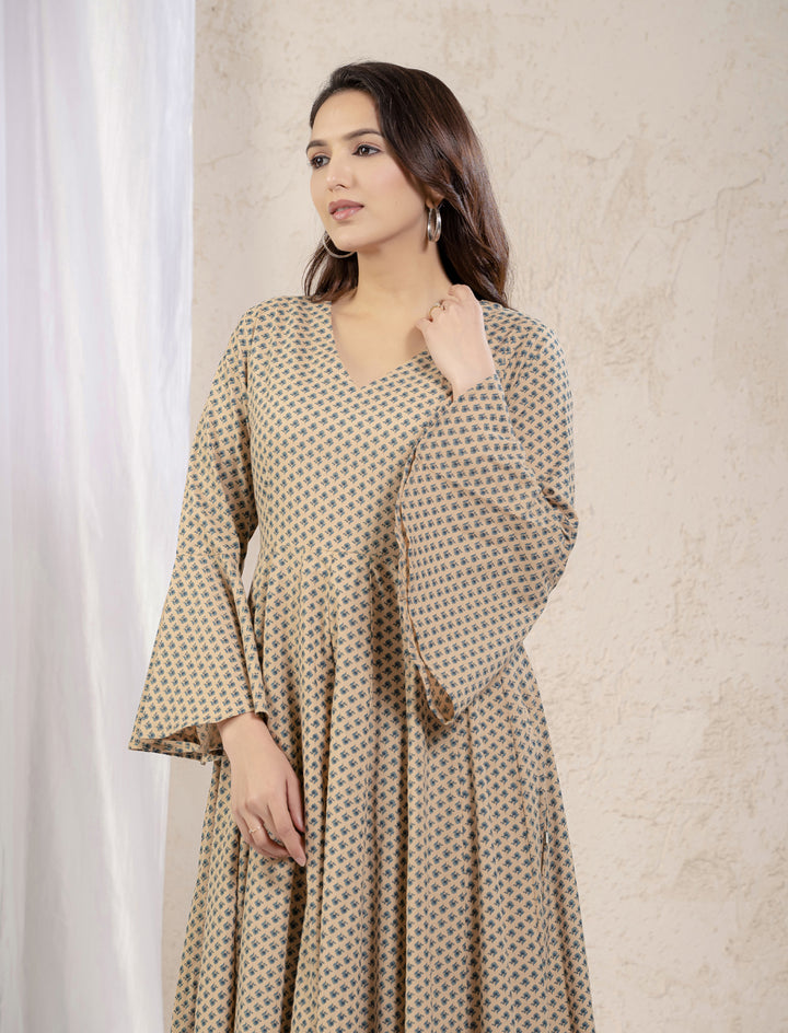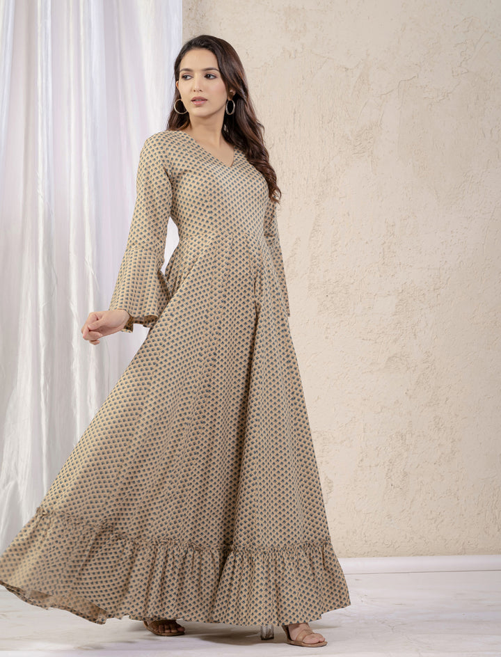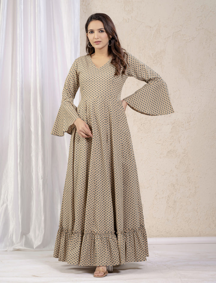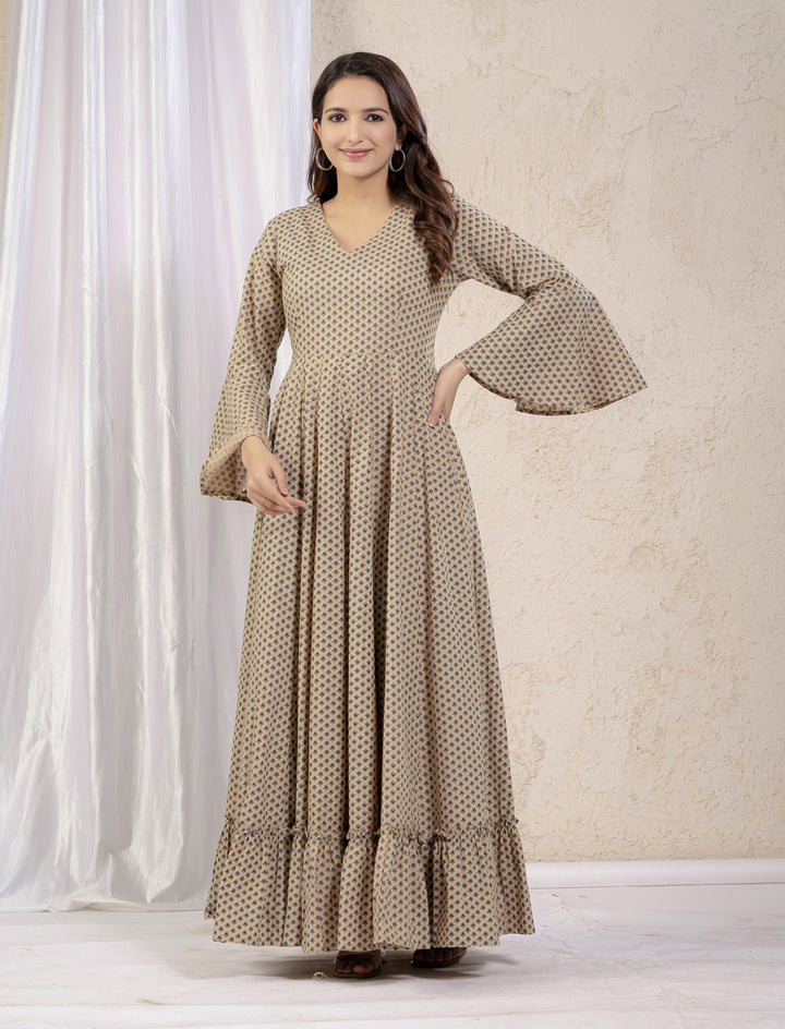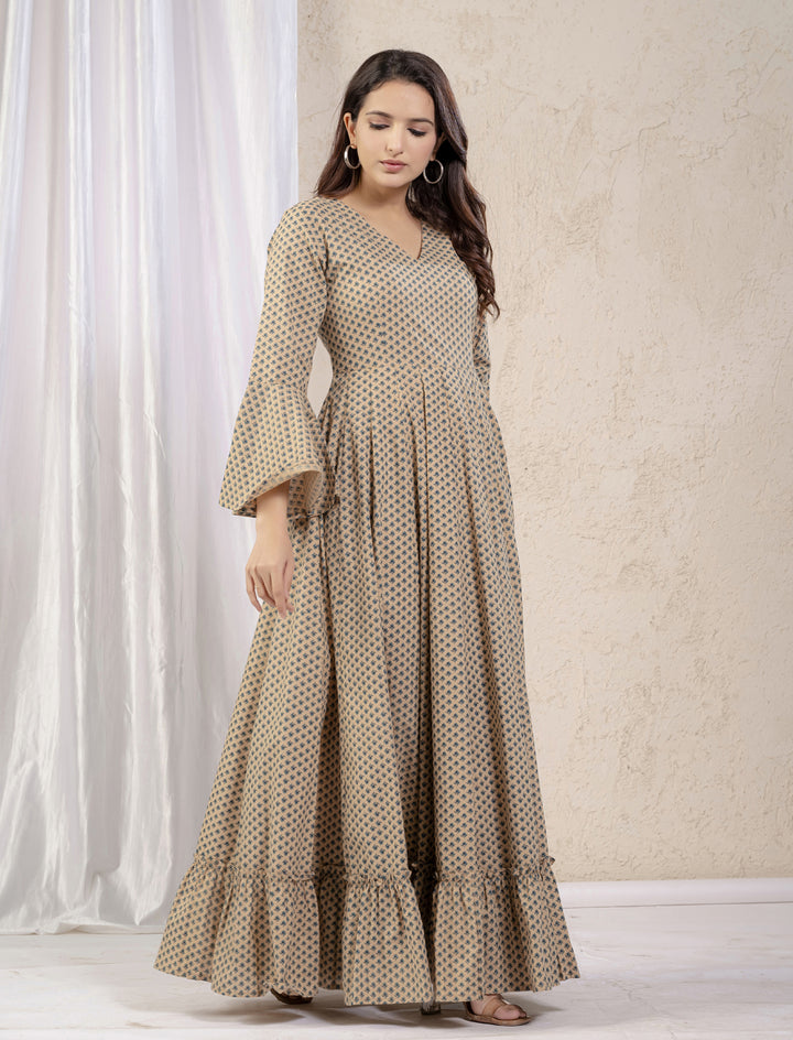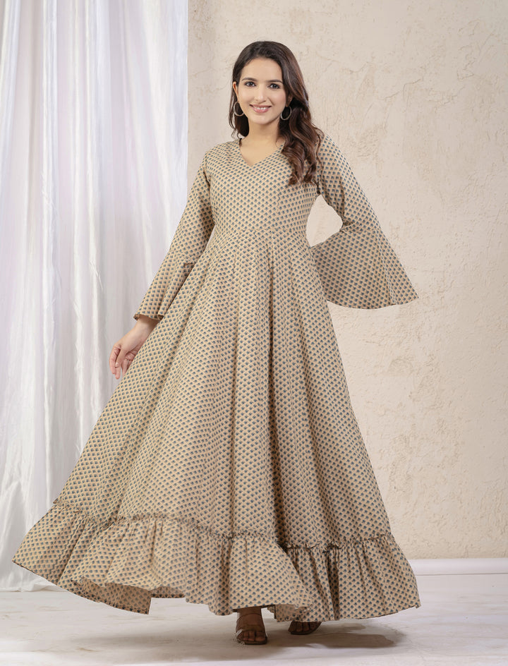 This printed ethnic wear dress is presented to you by Gulabchand Prints, A well-known brand in hand block prints from over 9 decades. This exclusively hand stitched dress is made of 100% pure cotton fabric with having printed prints over it. The dress is best suitable for you to showcase your women hood. Wear this at your ease and the fabric is so smooth to skin that you will love it and the attractive prints adds more charm to the same.