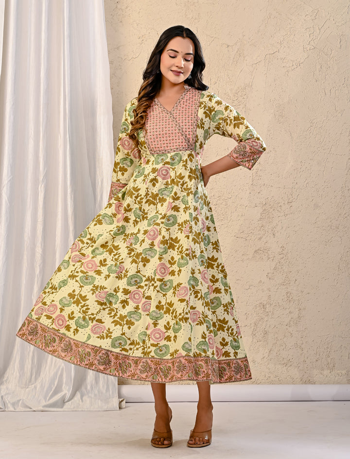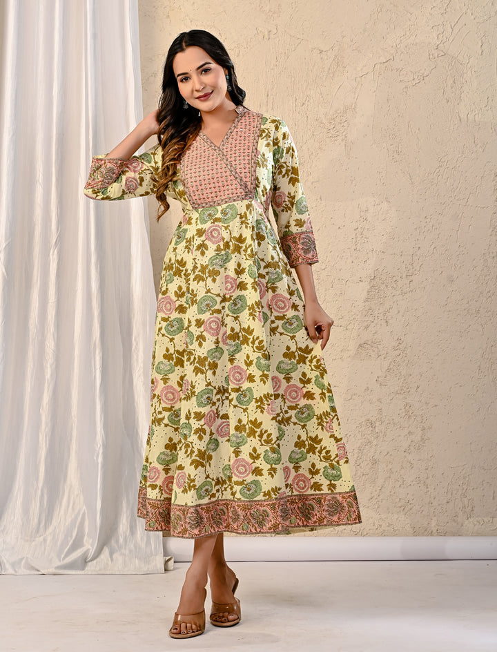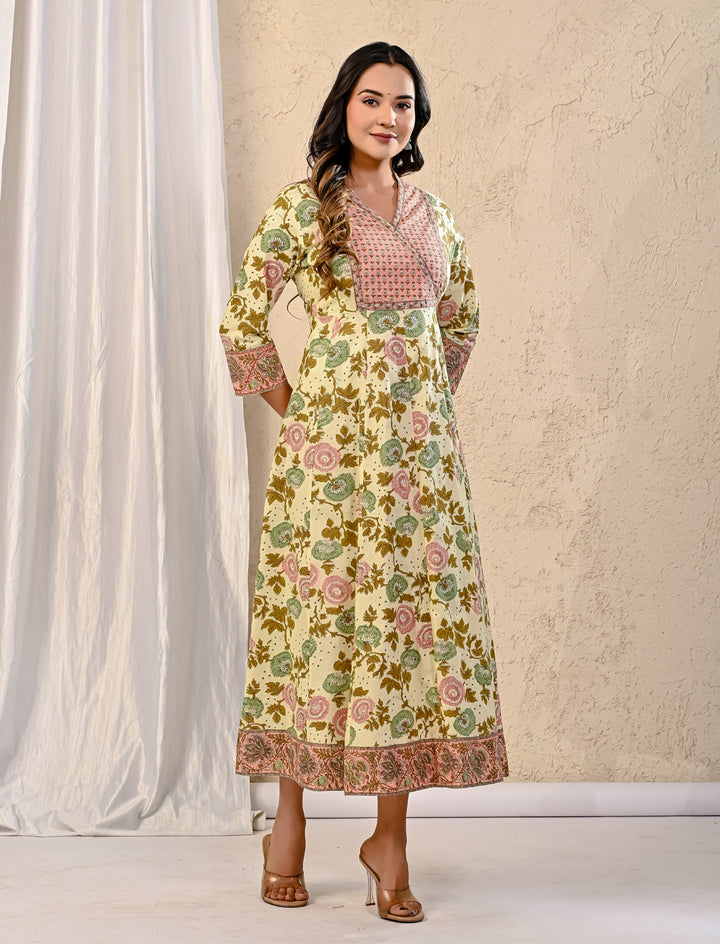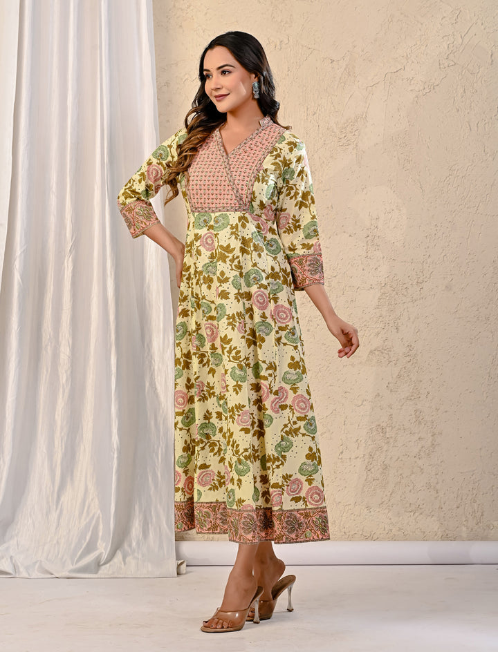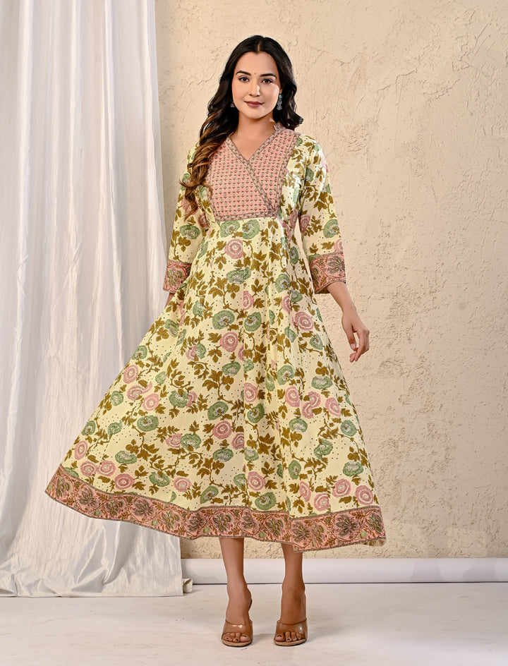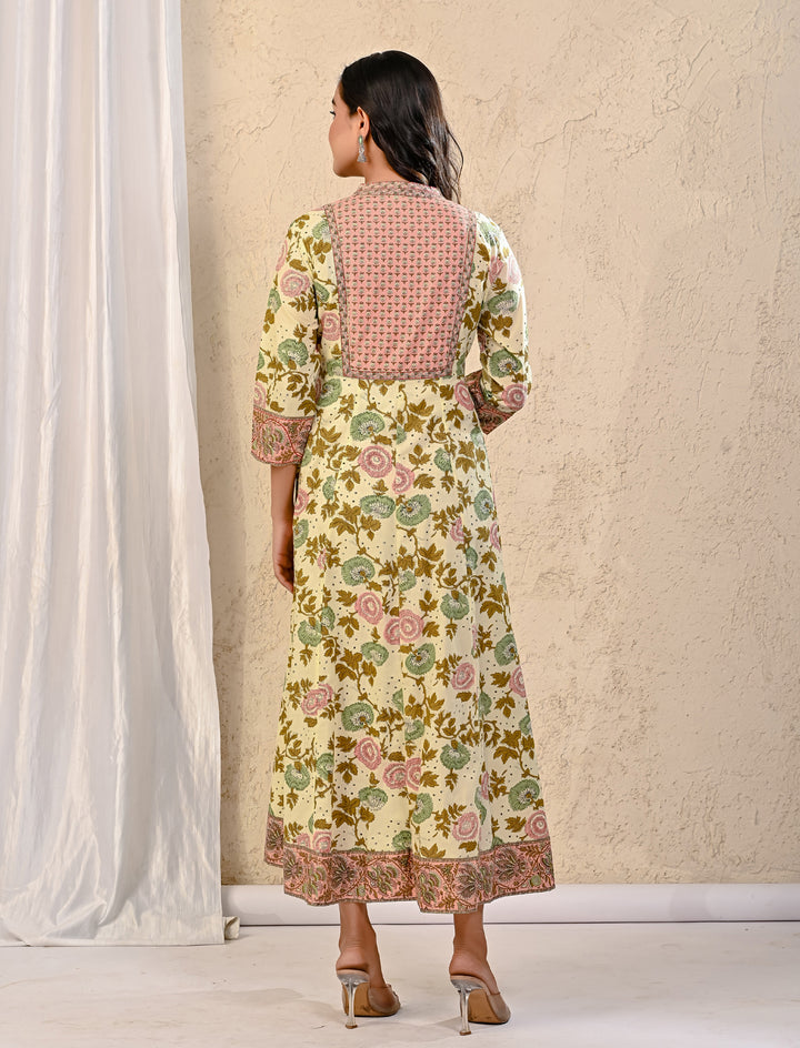 Expertly crafted with traditional prints, this cotton long dress exudes elegance. The stunning design on the yoke adds a touch of sophistication, making it perfect for any occasion. With its comfortable fit and beautiful detailing, this dress is a must-have for your wardrobe.