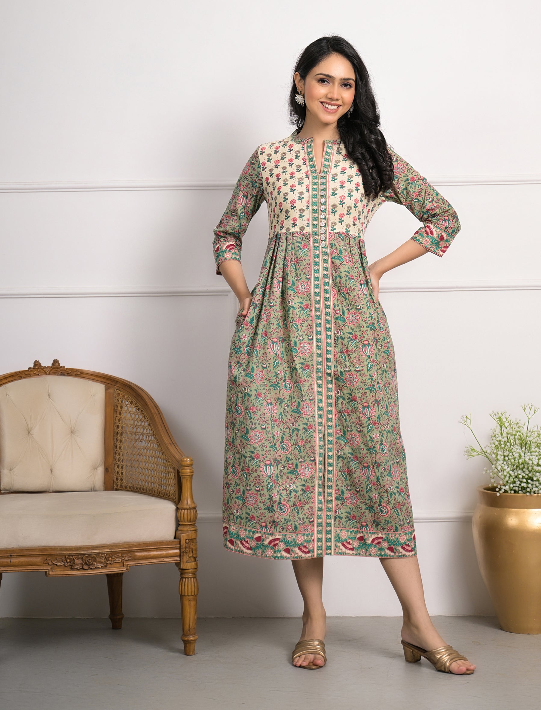 Green Block Printed Aline Long Cotton Dress