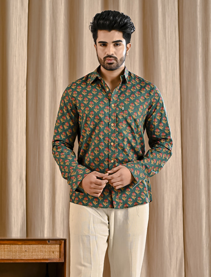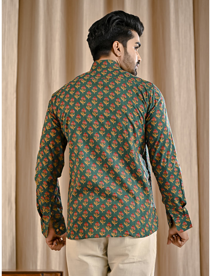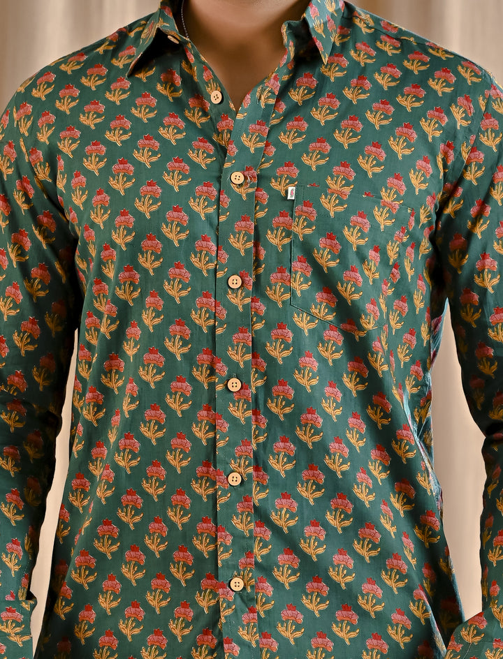 This hand block printed cotton shirt is presented to you by Gulabchand Prints, A well-known brand in hand block prints from over 9 decades. This exclusively hand stitched shirt is made of 100% pure cotton fabric with having hand block printed prints over it. Wear this at your ease and the fabric is so smooth to skin that you will love it and the attractive prints adds more charm to the same.