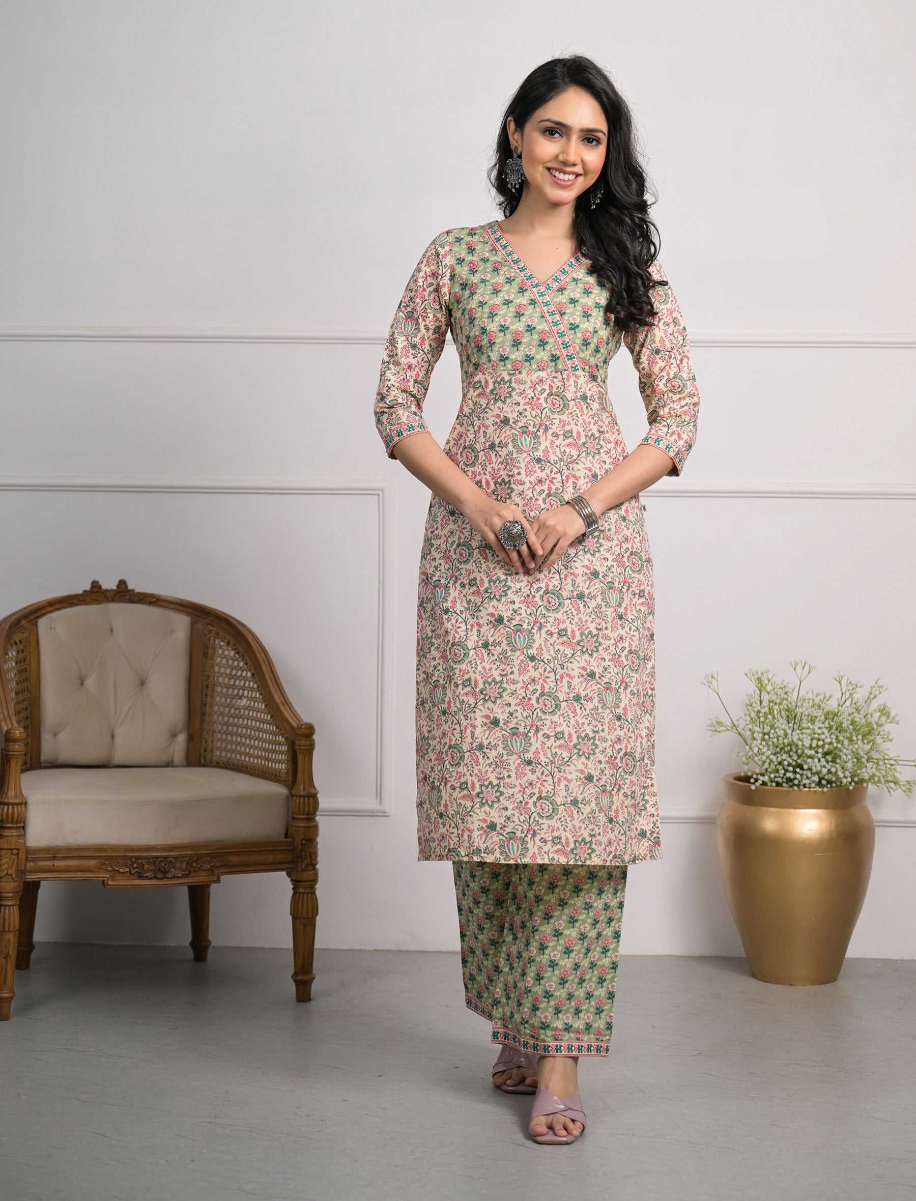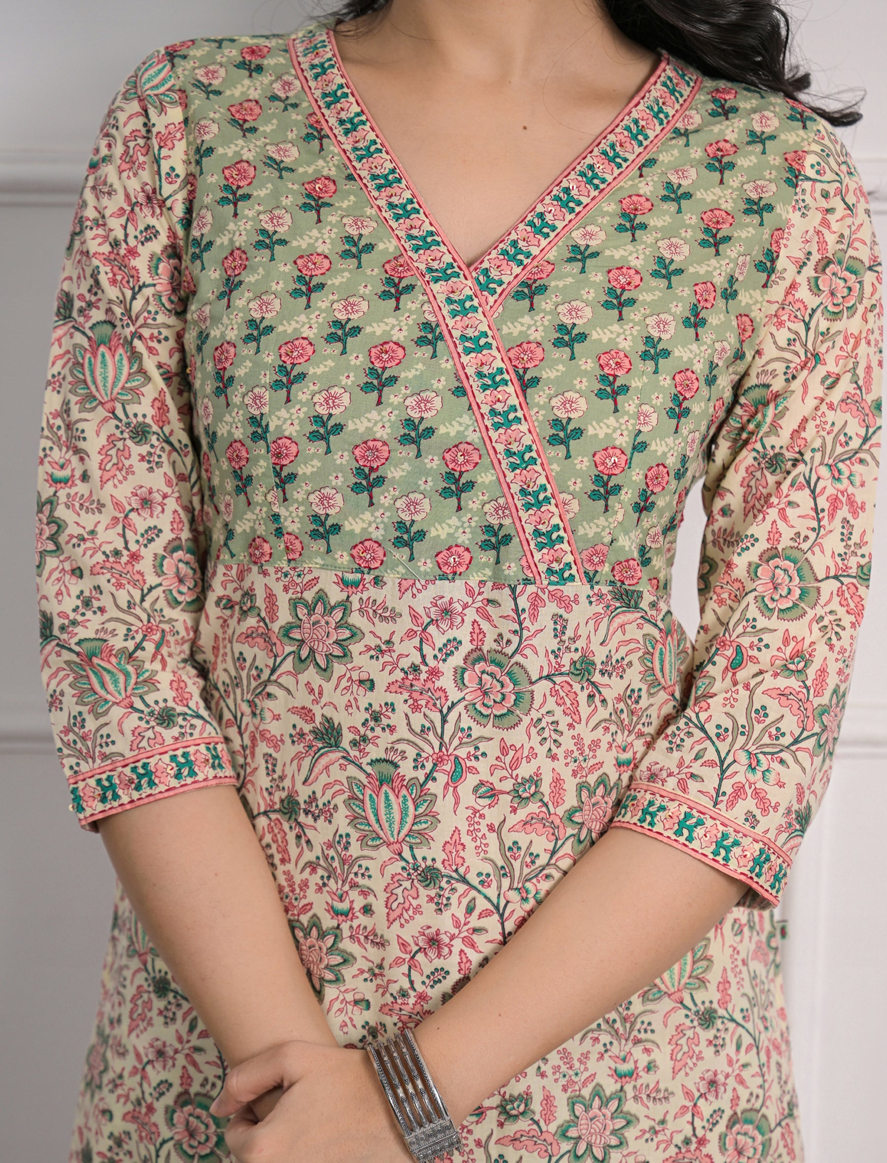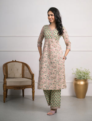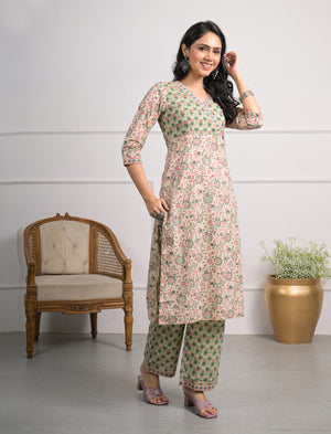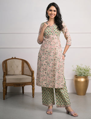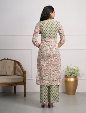 Green Cream Printed Cotton Block Printed Pant Set Of 2