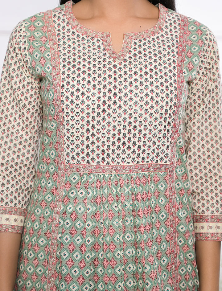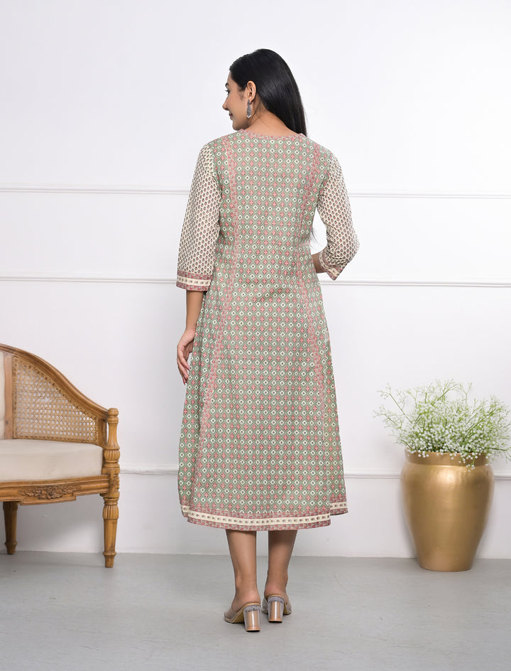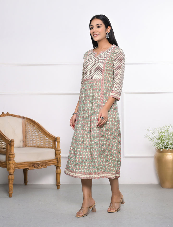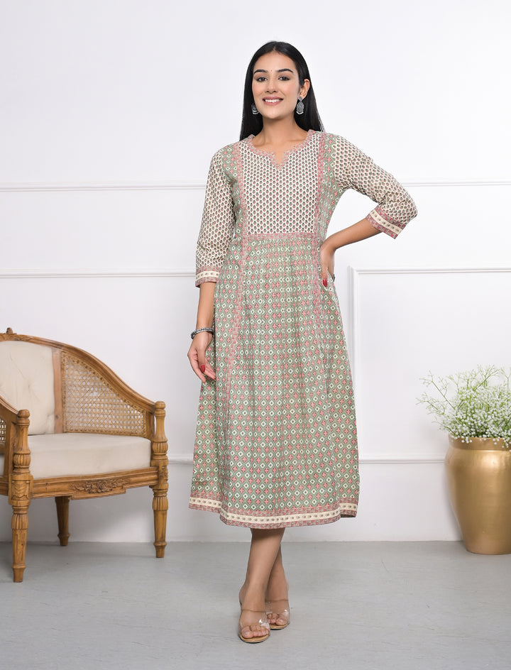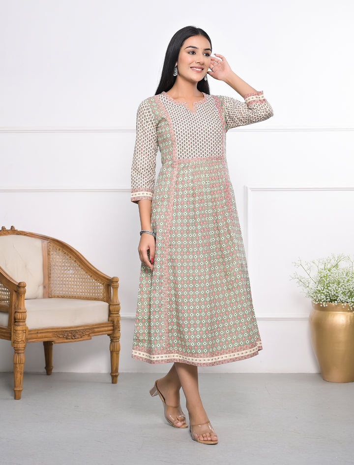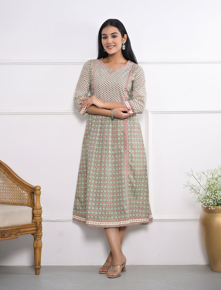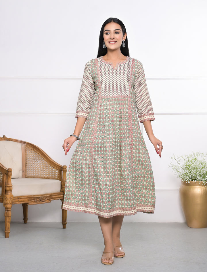 This printed ethnic wear dress is presented to you by Gulabchand Prints, A well-known brand in hand block prints from over 9 decades. This exclusively hand stitched dress is made of 100% pure cotton fabric with having printed prints over it. The dress is best suitable for you to showcase your women hood. Wear this at your ease and the fabric is so smooth to skin that you will love it and the attractive prints adds more charm to the same.