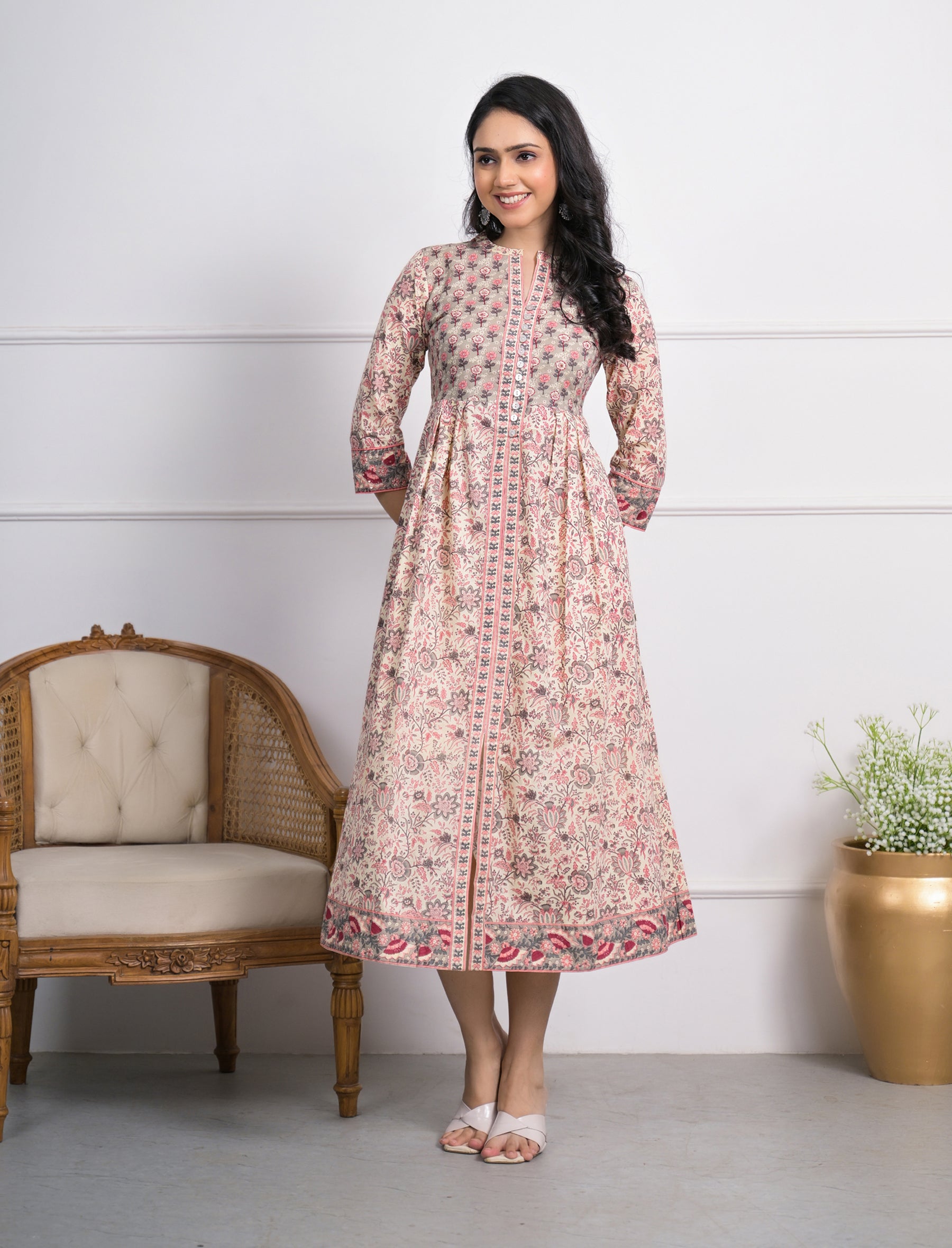 This printed ethnic wear dress is presented to you by Gulabchand Prints, A well-known brand in hand block prints from over 9 decades. This exclusively hand stitched dress is made of 100% pure cotton fabric with having printed prints over it. The dress is best suitable for you to showcase your women hood. Wear this at your ease and the fabric is so smooth to skin that you will love it and the attractive prints adds more charm to the same.
