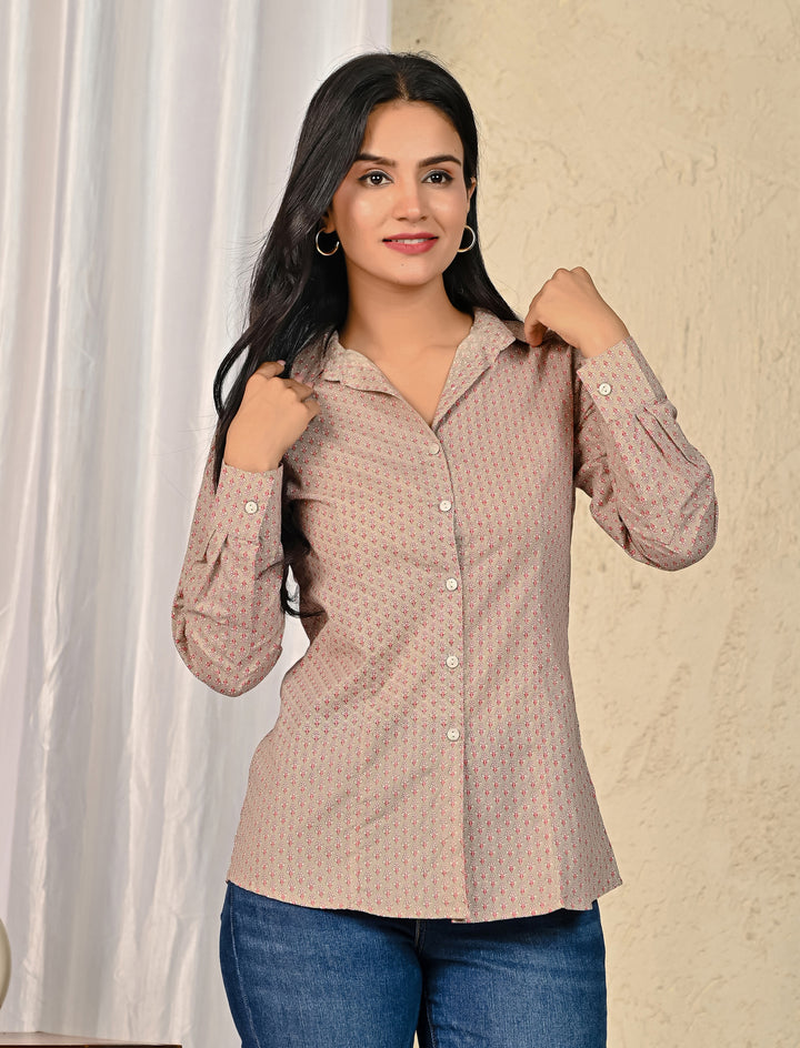 Grey Cotton Printed Full Sleeves Shirt For Women