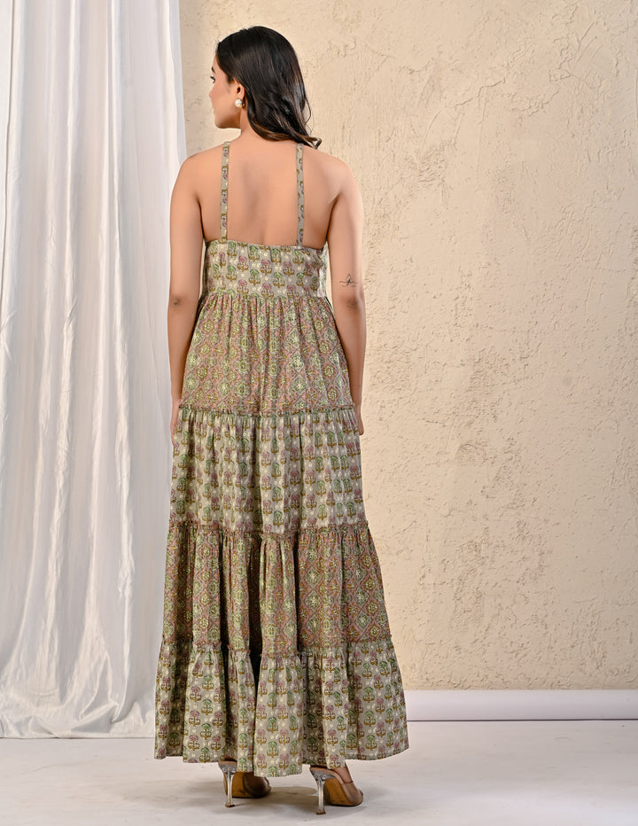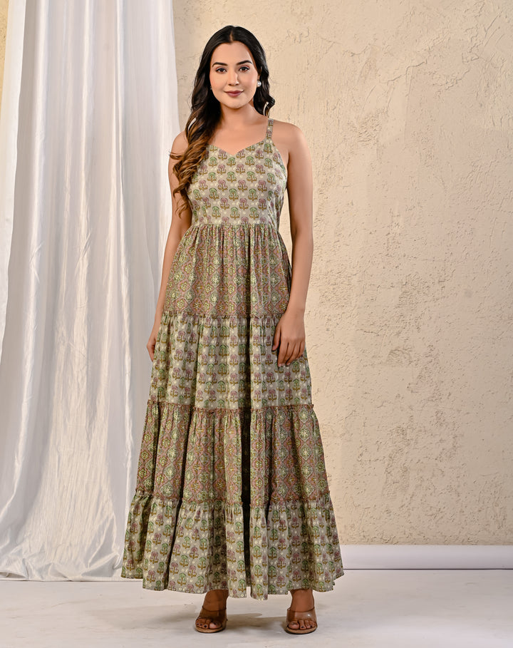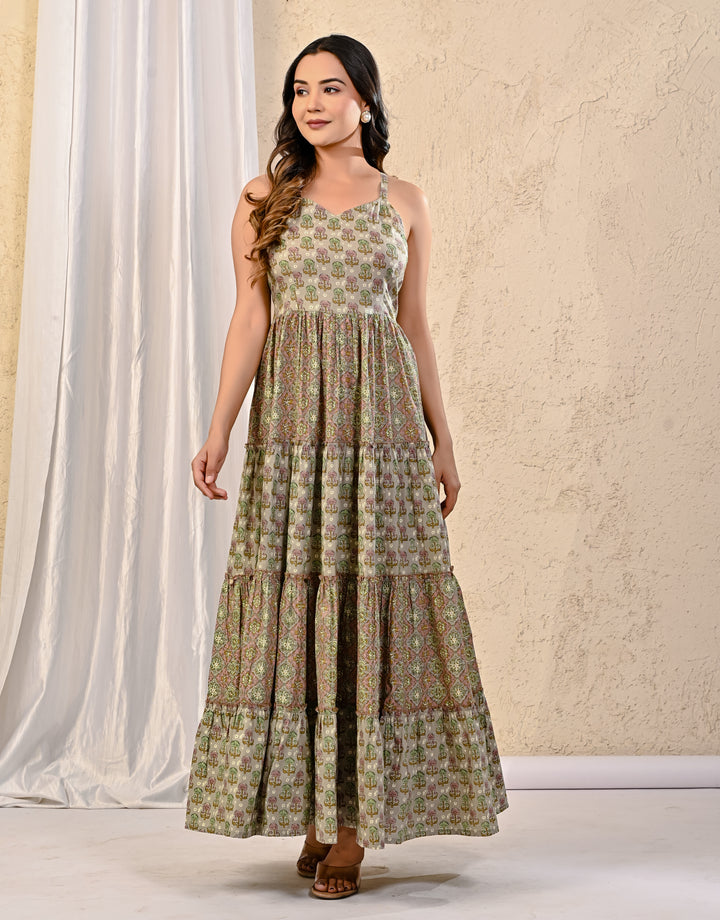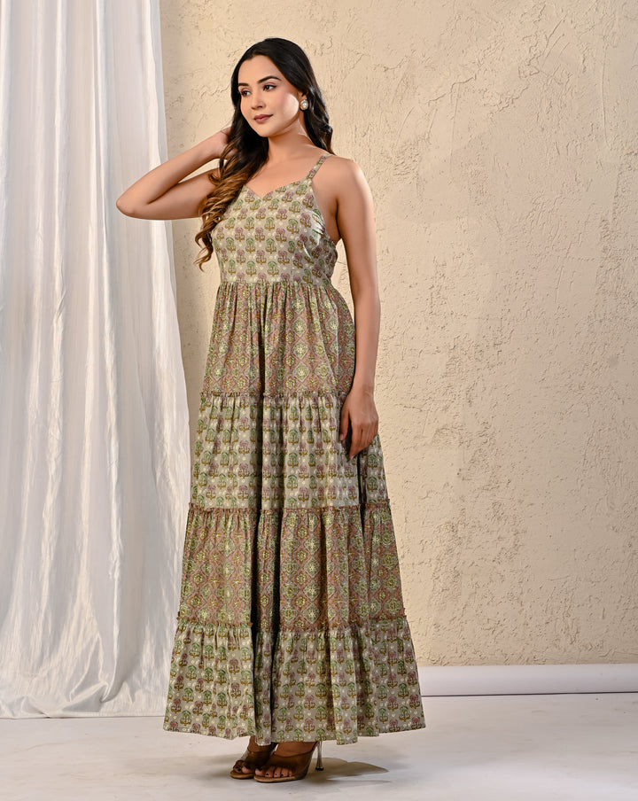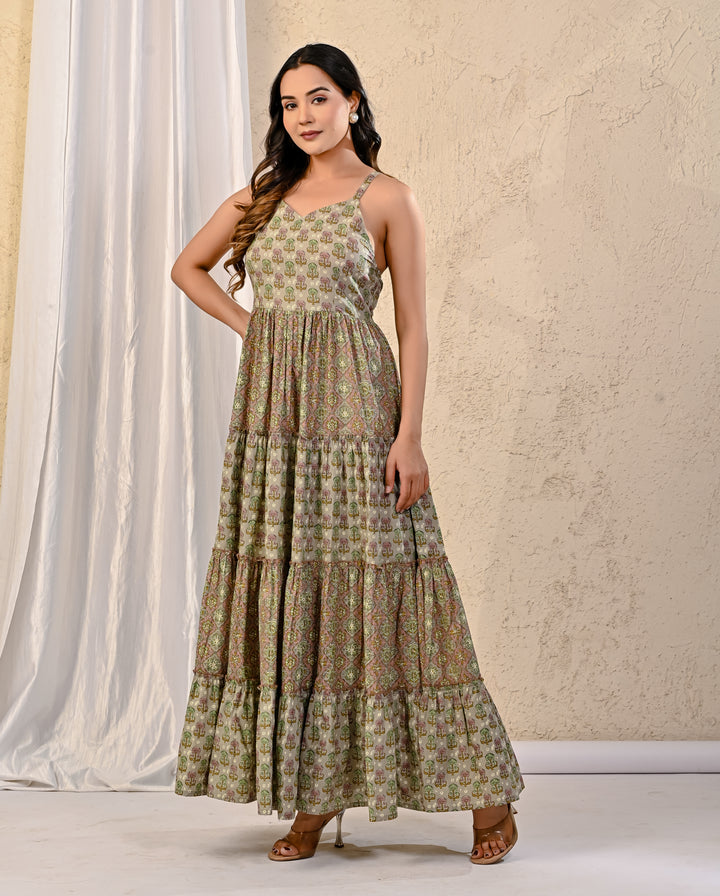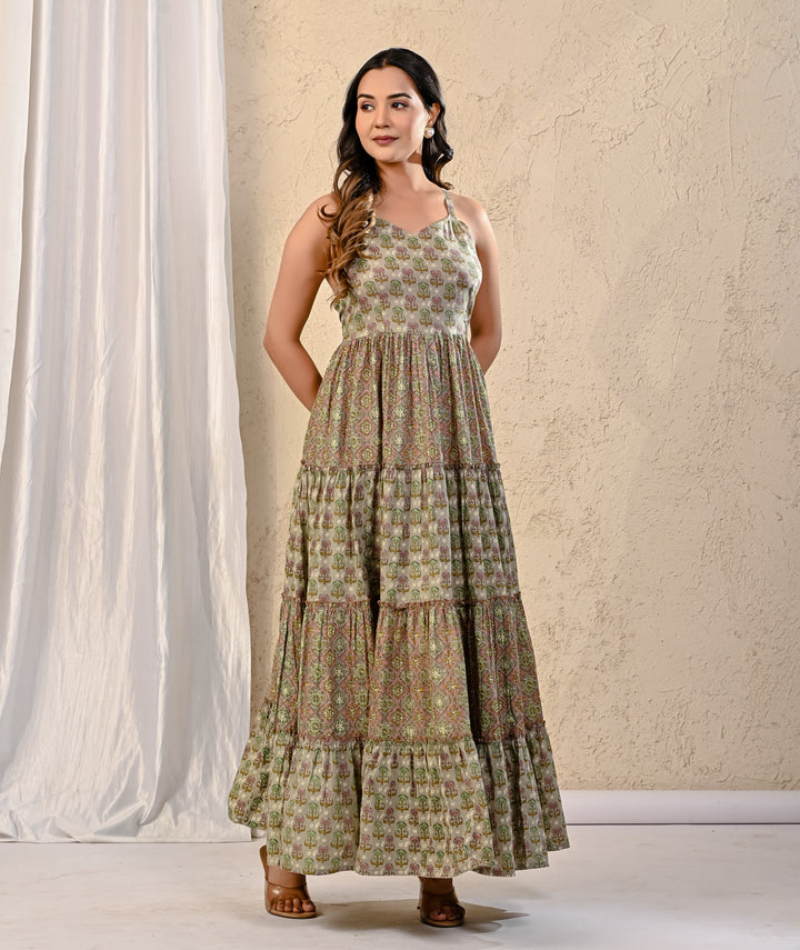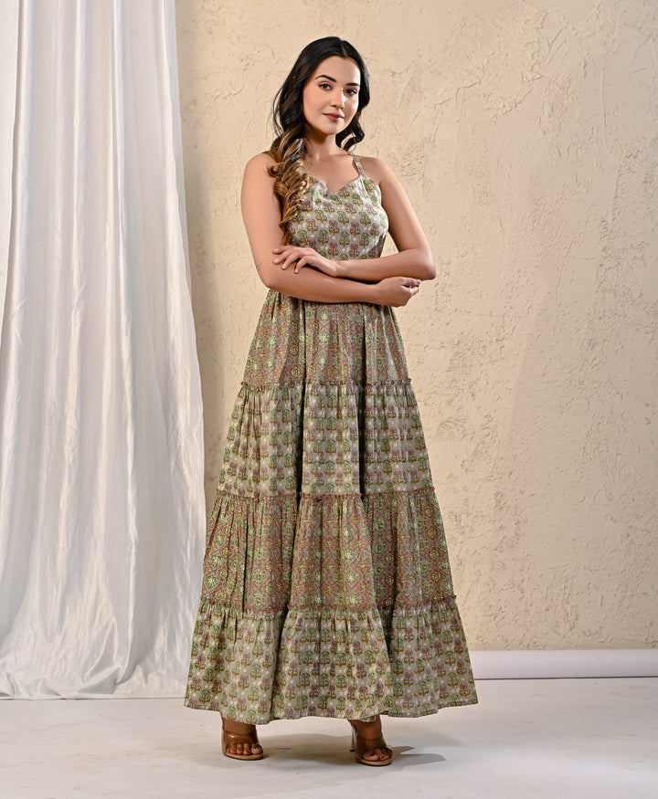 Expertly crafted with traditional Red Bandhej and intricate Kantha work, this cotton long dress exudes elegance. The stunning design on the yoke adds a touch of sophistication, making it perfect for any occasion. With its comfortable fit and beautiful detailing, this dress is a must-have for your wardrobe.