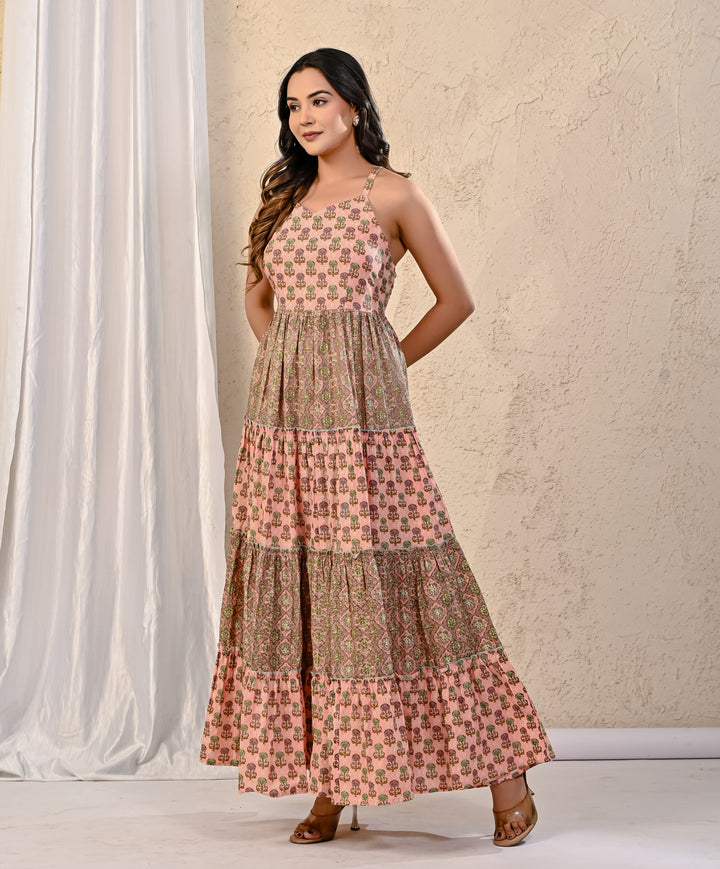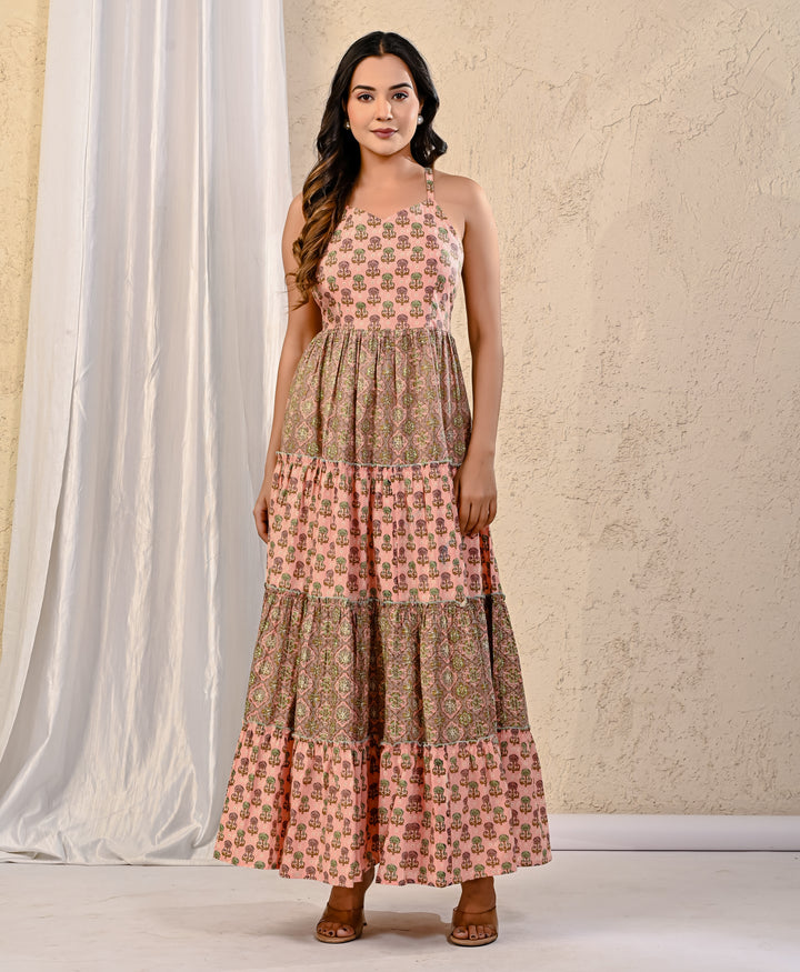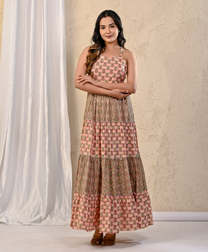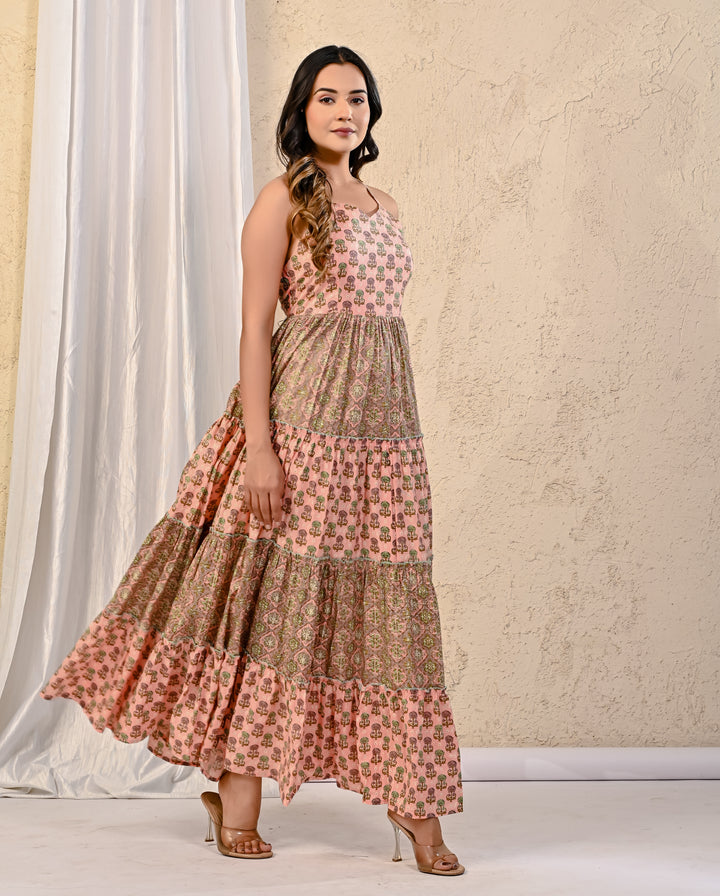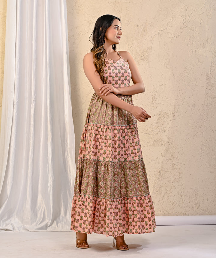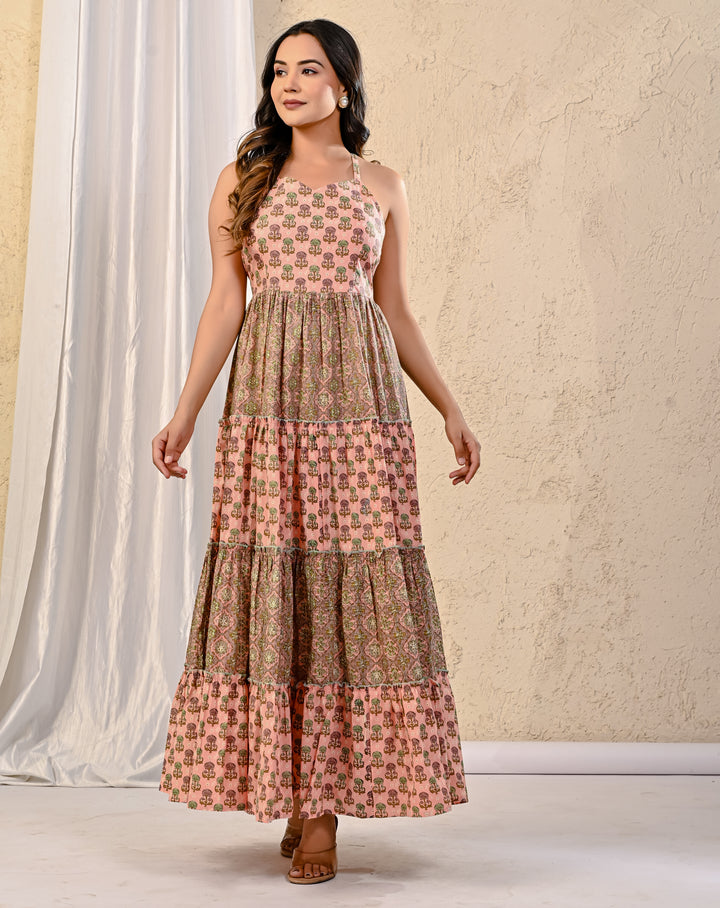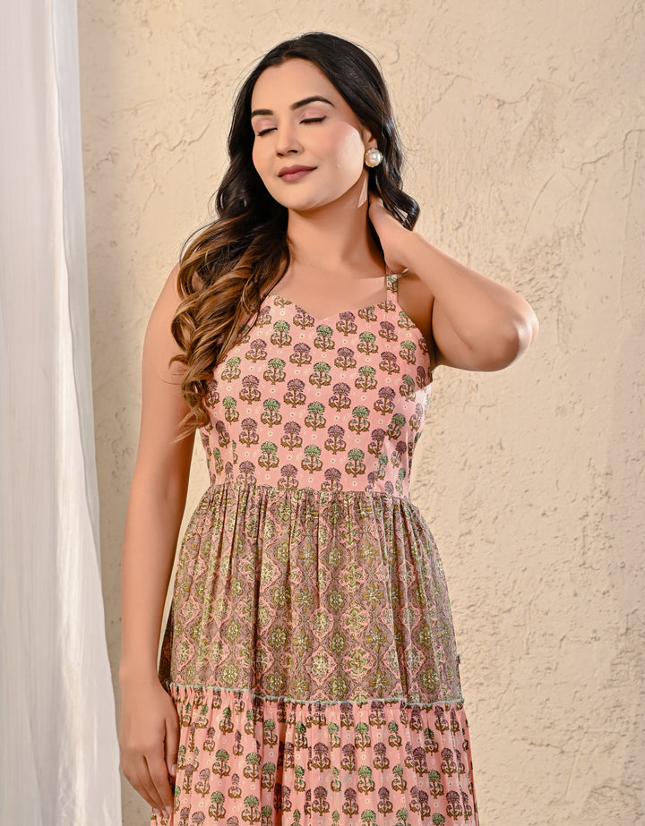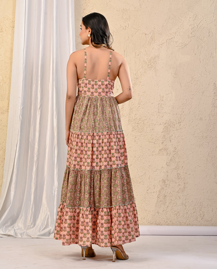 Expertly crafted with traditional Red Bandhej and intricate Kantha work, this cotton long dress exudes elegance. The stunning design on the yoke adds a touch of sophistication, making it perfect for any occasion. With its comfortable fit and beautiful detailing, this dress is a must-have for your wardrobe.
