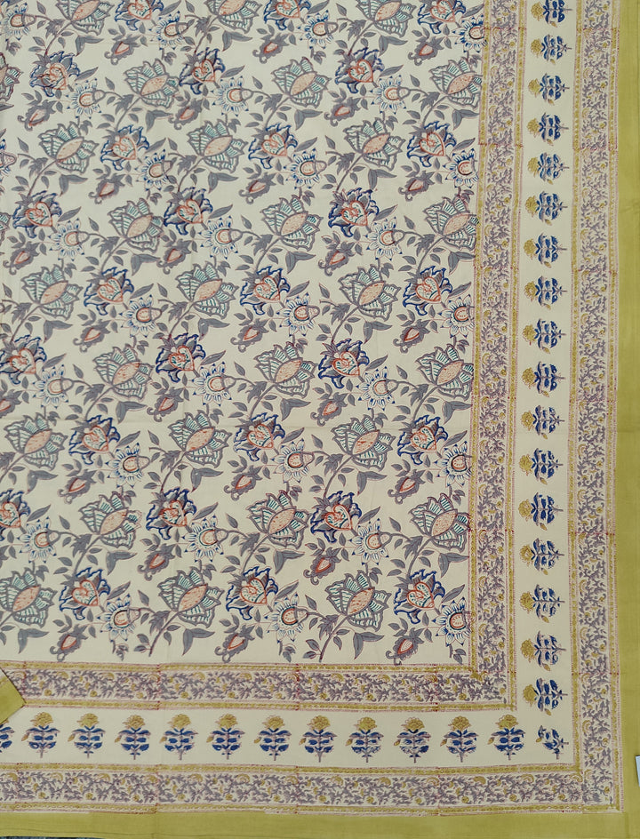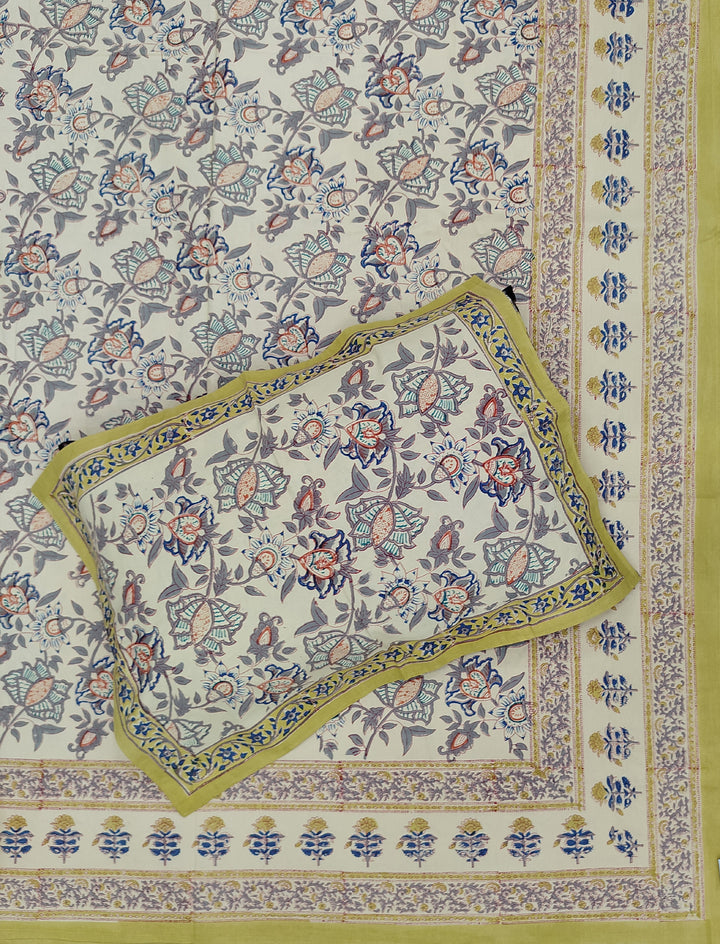 This hand block printed double bedsheet is presented to you by Gulabchand Prints, A well-known brand in hand block prints from over 9 decades. This exclusively hand stitched bedsheet is made of 100% pure cotton fabric with having hand block printed prints over it. The bedsheet is best suitable for your home decor
