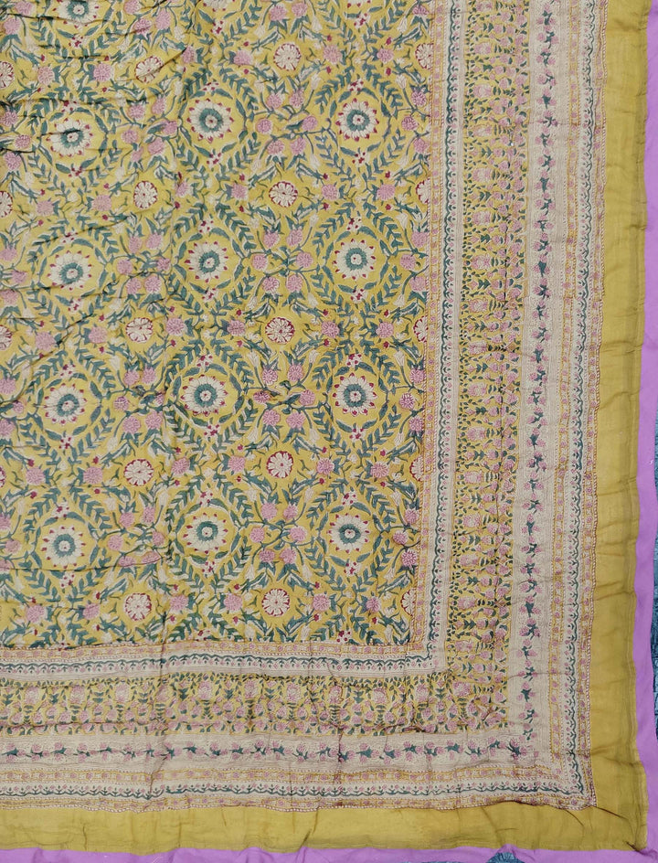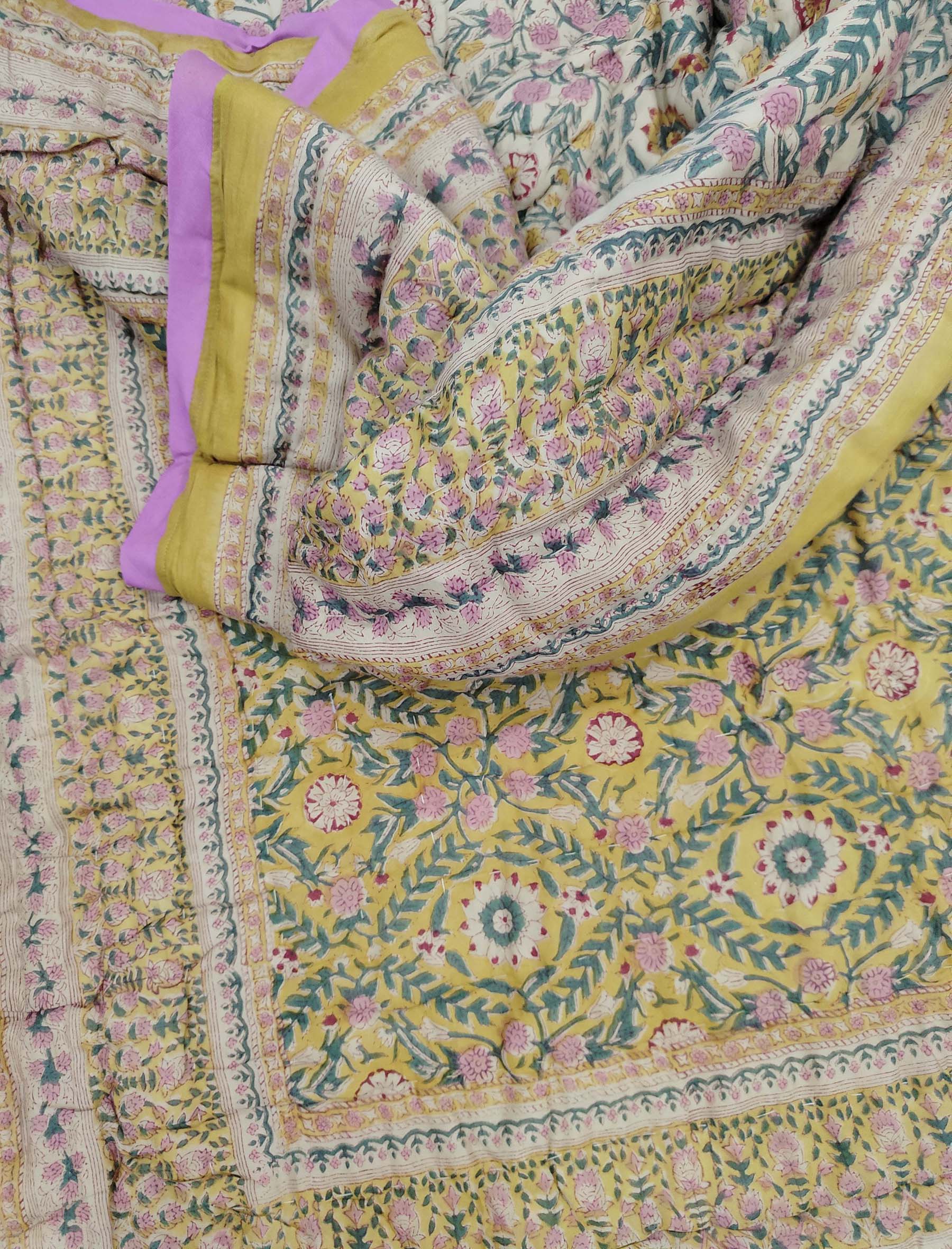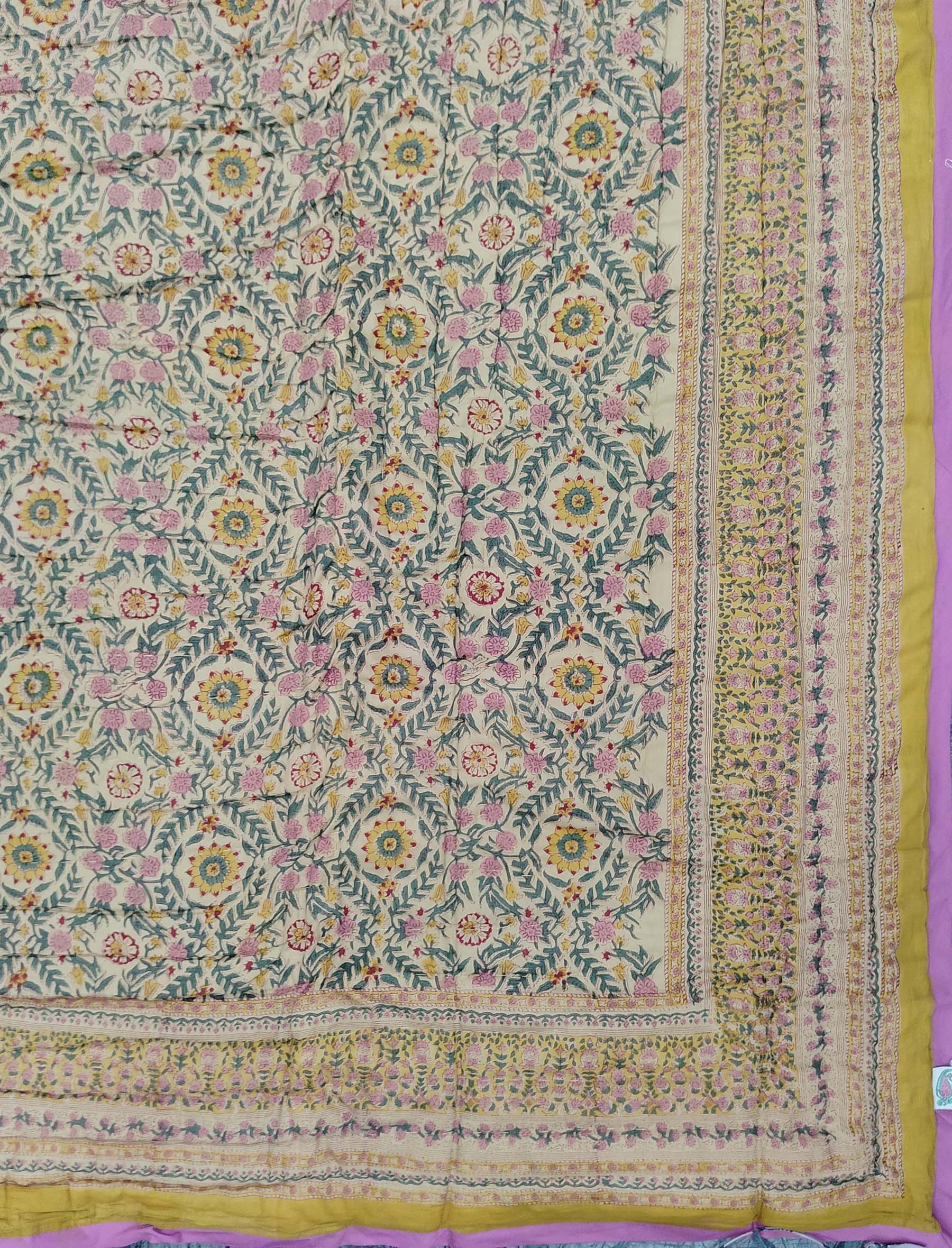 This hand block printed double quilt is presented to you by Gulabchand Prints, A well-known brand in hand block prints from over 9 decades. This exclusively hand stitched quilt is made of 100% pure cotton fabric with having hand block printed prints over it.