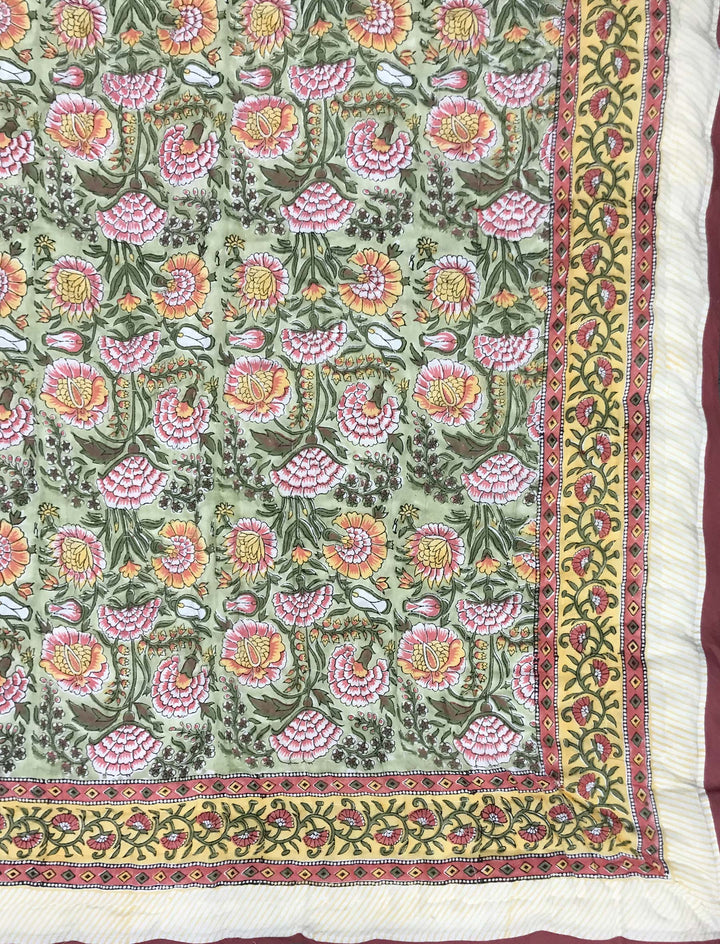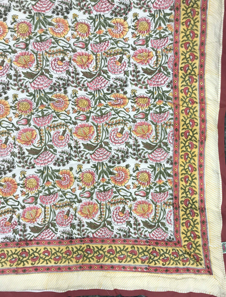 This hand block printed single quilt is presented to you by Gulabchand Prints, A well-known brand in hand block prints from over 9 decades. This exclusively hand stitched quilt is made of 100% pure cotton fabric with having hand block printed prints over it.