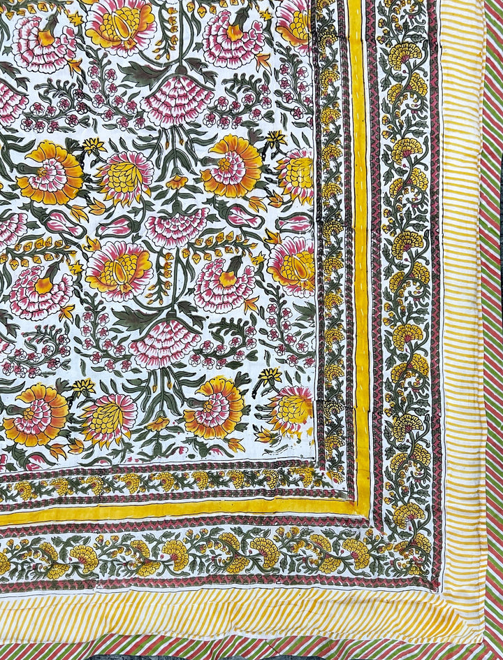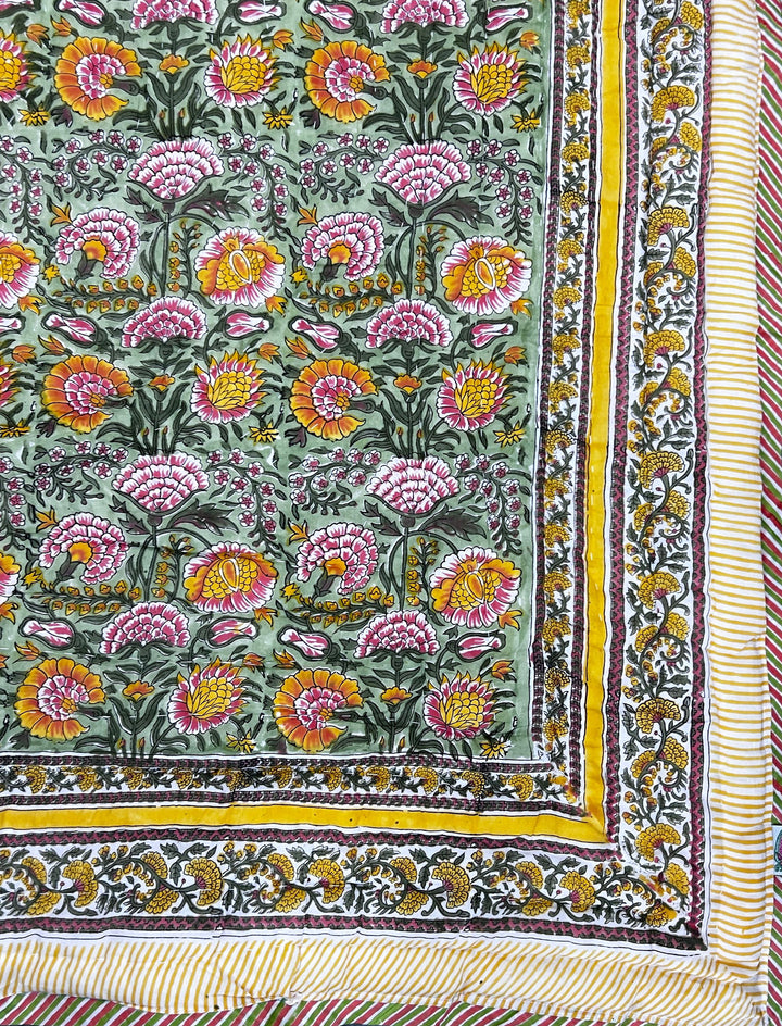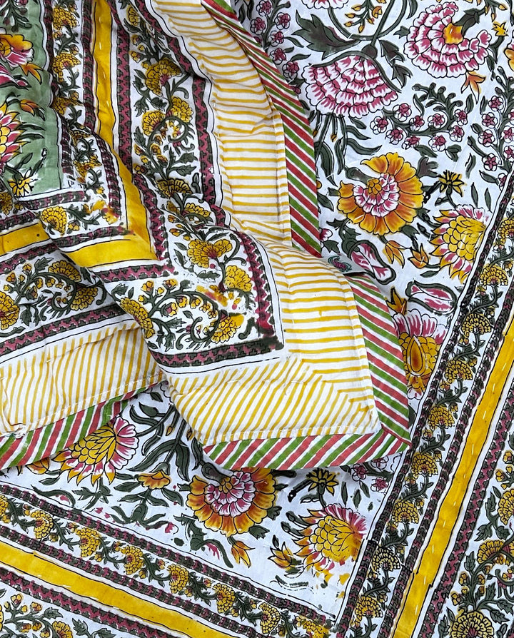 This hand block printed single quilt is presented to you by Gulabchand Prints, A well-known brand in hand block prints from over 9 decades. This exclusively hand stitched dohar is made of 100% pure cotton fabric with having hand block printed prints over it.