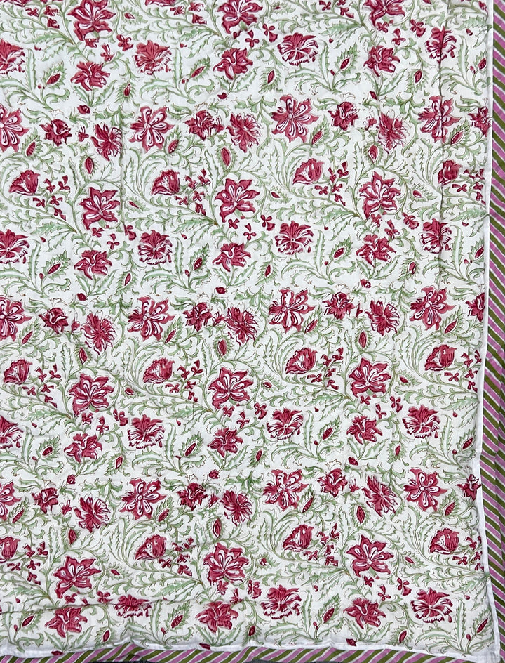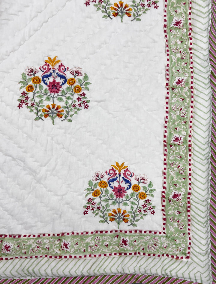 This hand block printed single quilt is presented to you by Gulabchand Prints, A well-known brand in hand block prints from over 9 decades. This exclusively hand stitched dohar is made of 100% pure cotton fabric with having hand block printed prints over it.