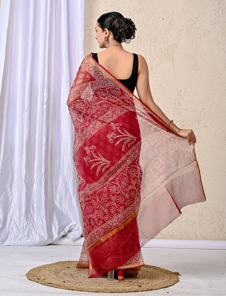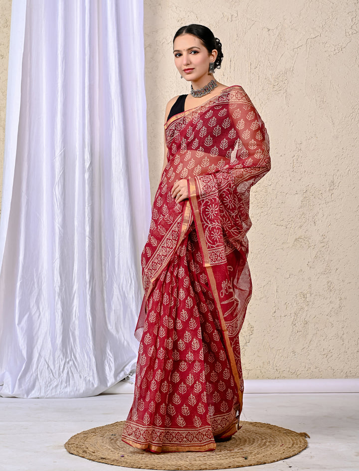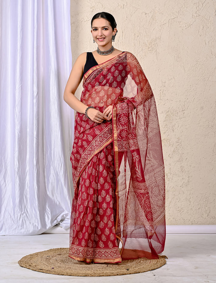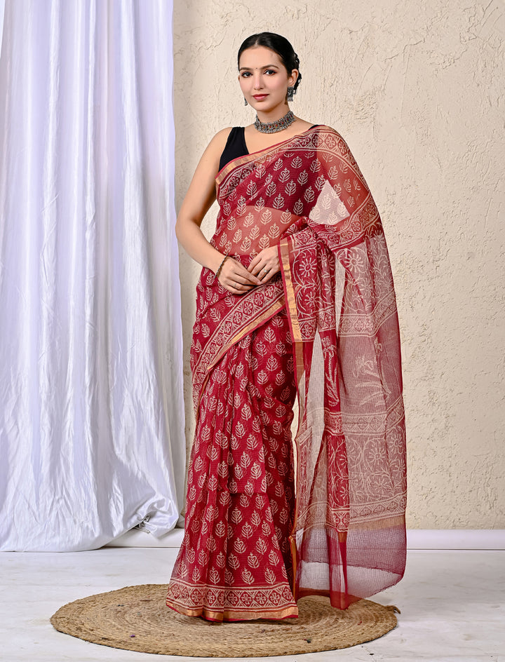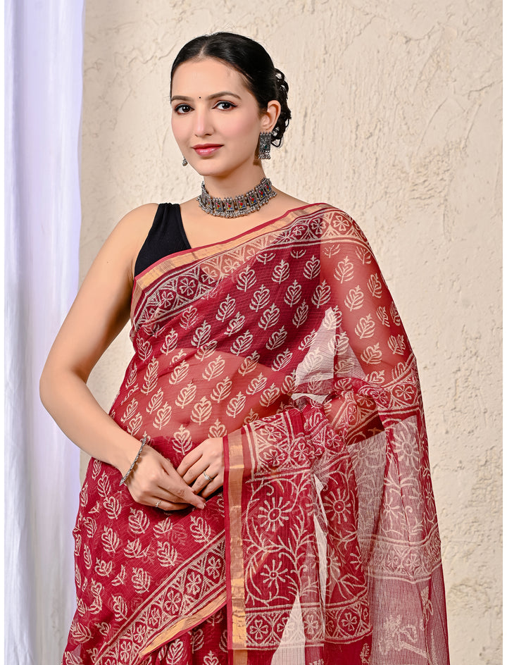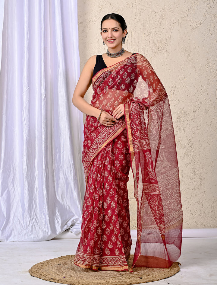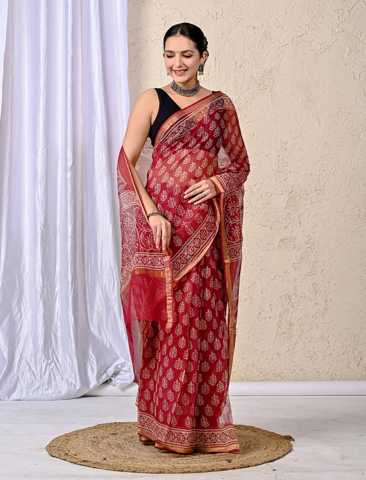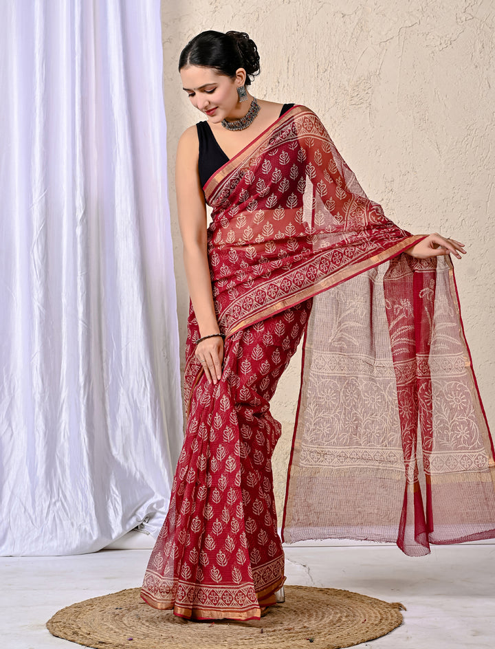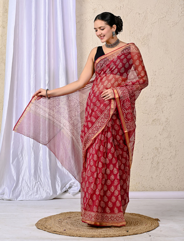 This printed saree is presented to you by Gulabchand Prints, A well-known brand in hand block prints from over 9 decades. This exclusively saree is made of 100% kota doriya fabric with having printed prints over it. Attached with a blouse, this saree can be your perfect for your saree needs.