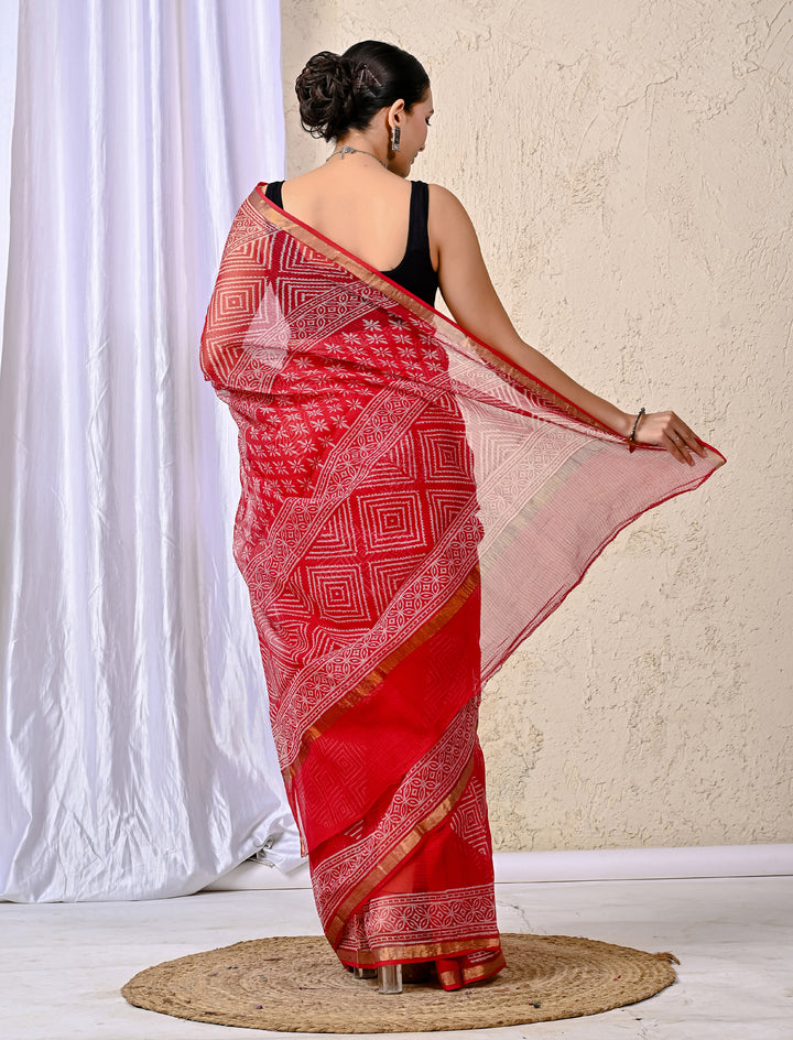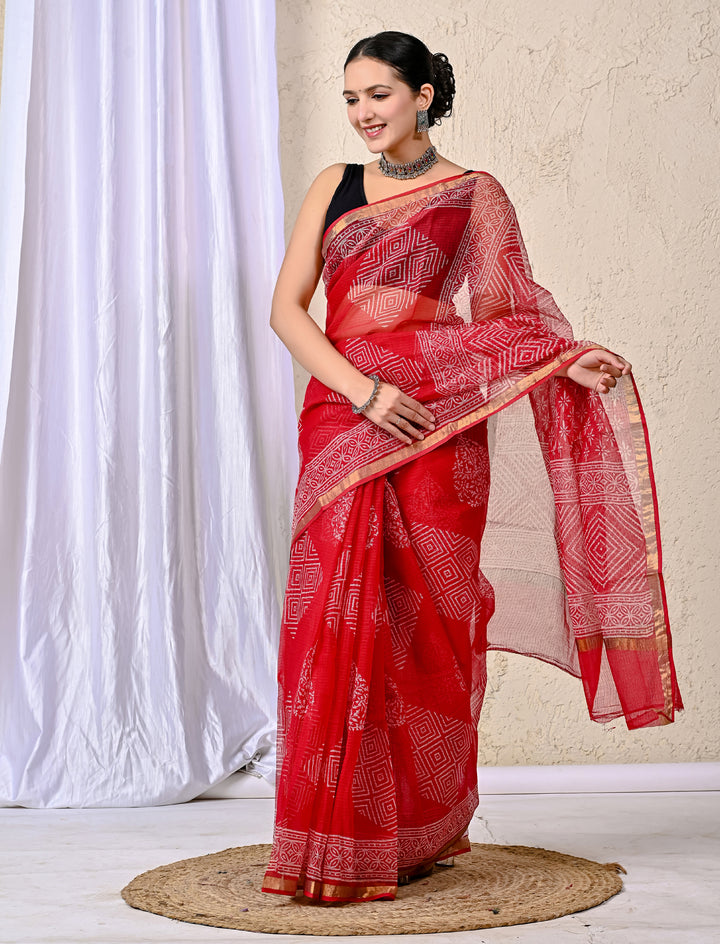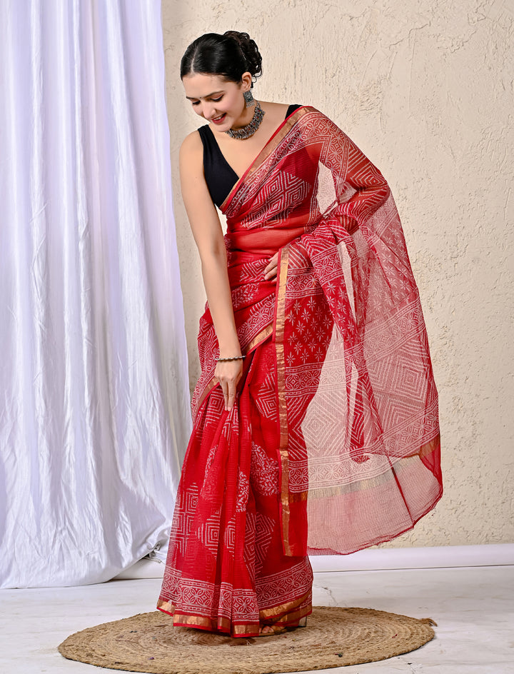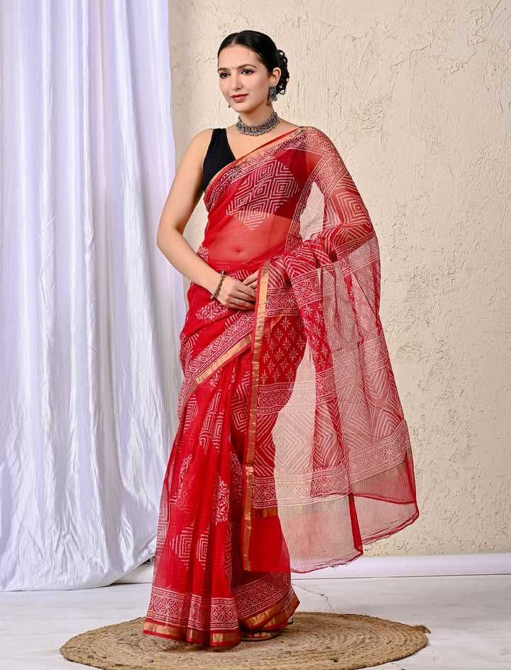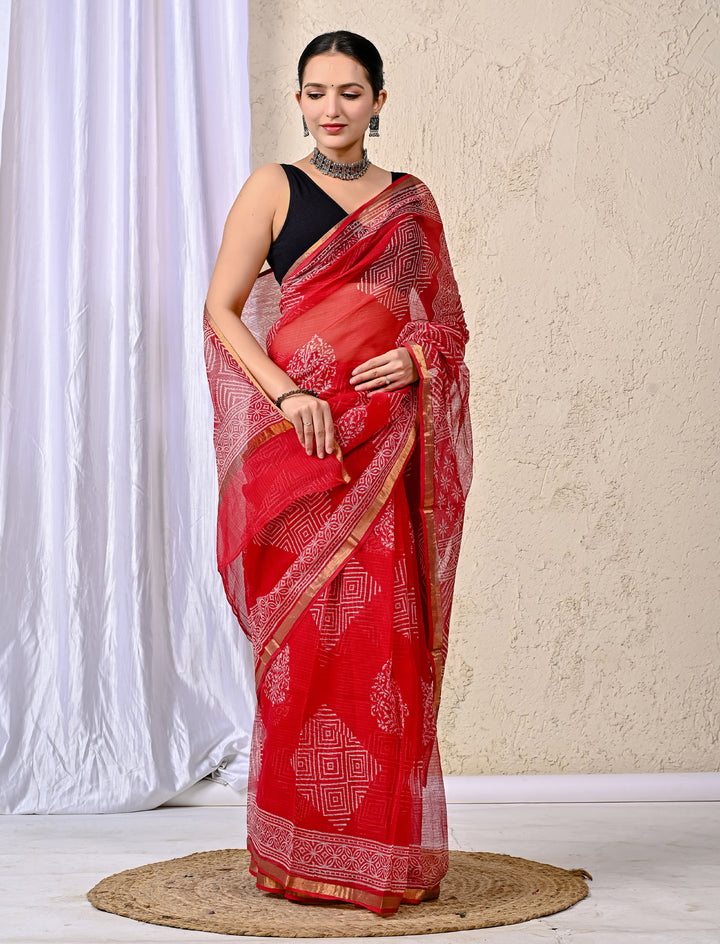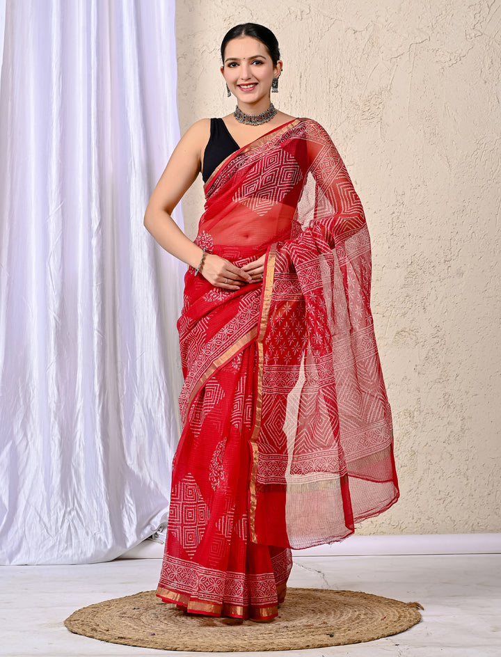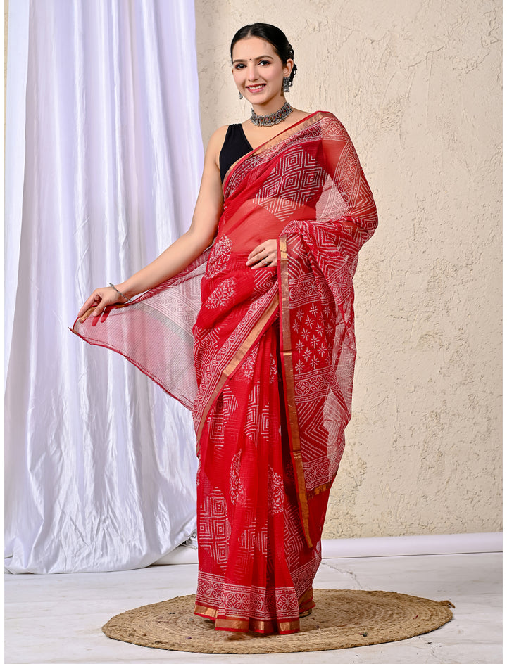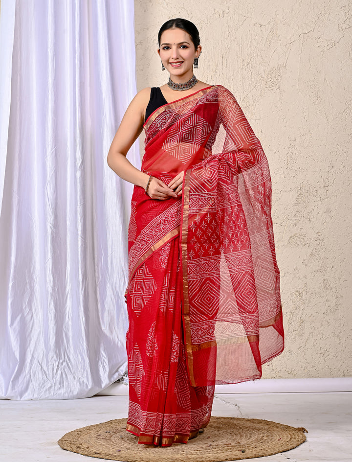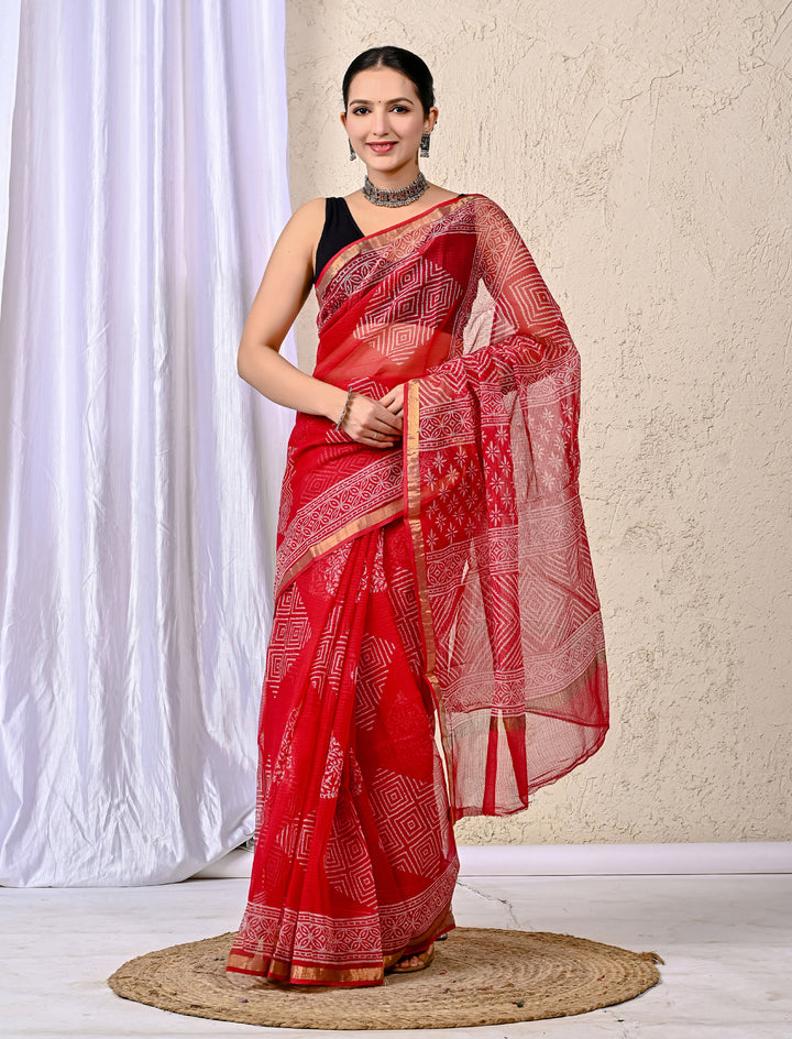 This printed saree is presented to you by Gulabchand Prints, A well-known brand in hand block prints from over 9 decades. This exclusively saree is made of 100% kota doriya fabric with having printed prints over it. Attached with a blouse, this saree can be your perfect for your saree needs.