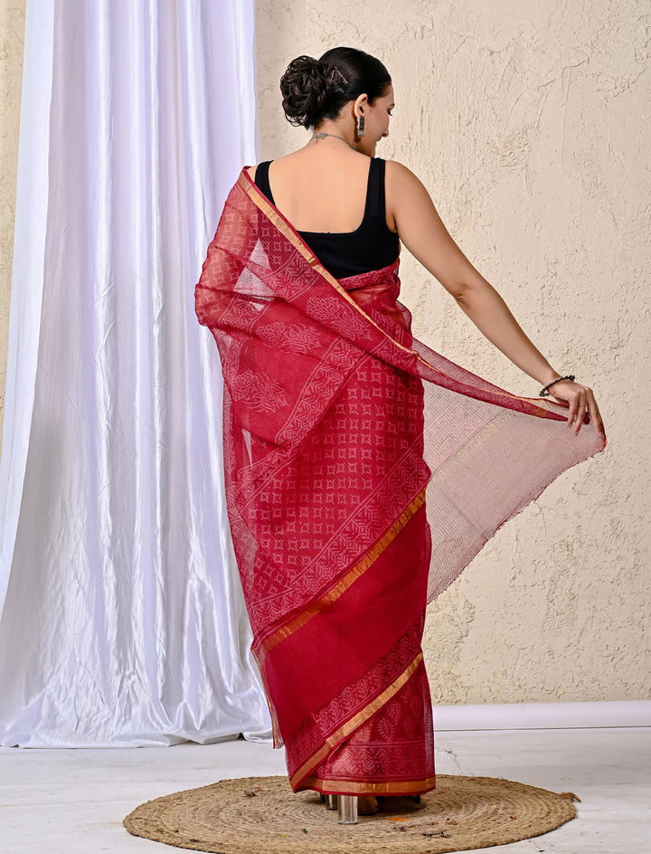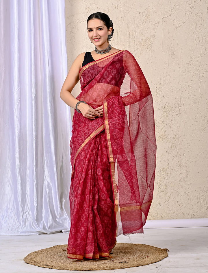 This printed saree is presented to you by Gulabchand Prints, A well-known brand in hand block prints from over 9 decades. This exclusively saree is made of 100% kota doriya fabric with having printed prints over it. Attached with a blouse, this saree can be your perfect for your saree needs.