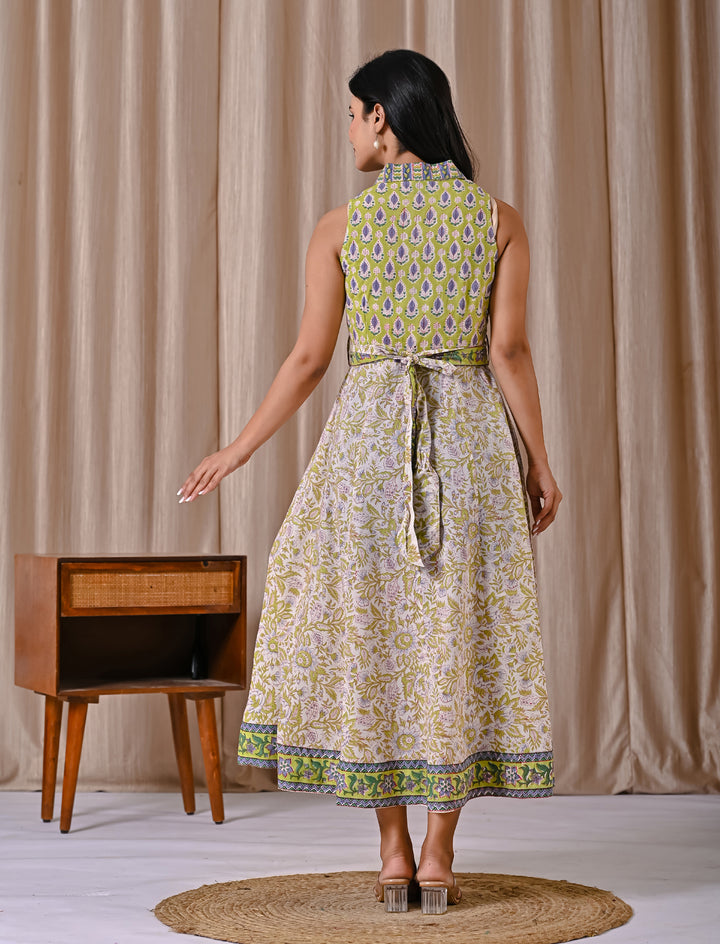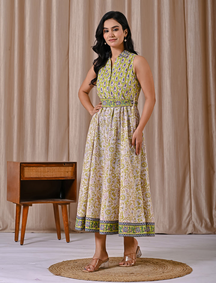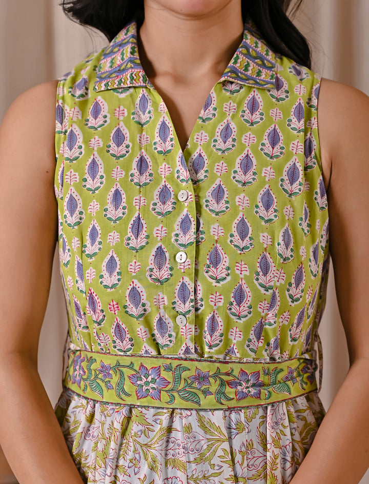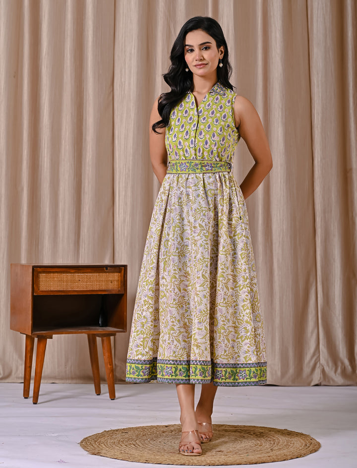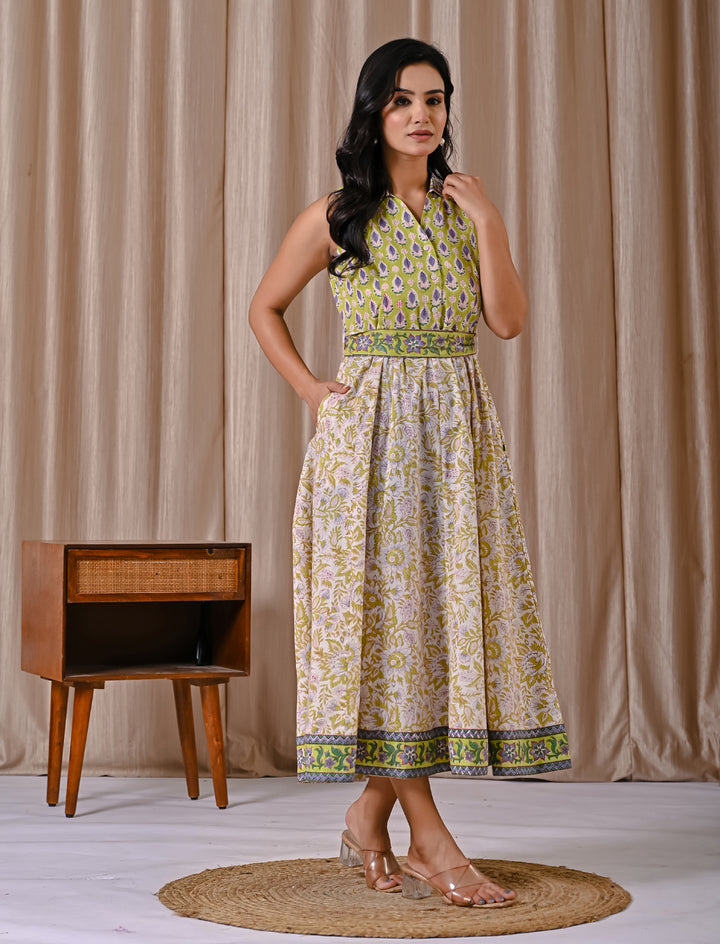 This light green and white sleeveless dress features a classic collar neck and intricate block prints, blending traditional craftsmanship with modern style. Its lightweight fabric ensures comfort and breathability, ideal for warm days. The elegant design makes it a versatile addition to your wardrobe, perfect for casual outings or relaxed gatherings. Embrace effortless style while staying comfortable throughout the day.