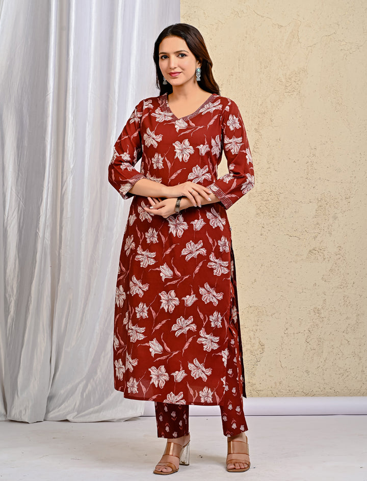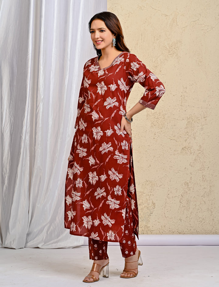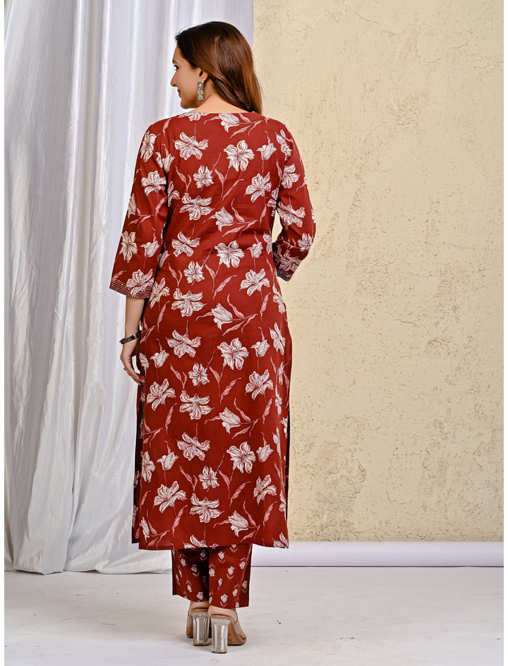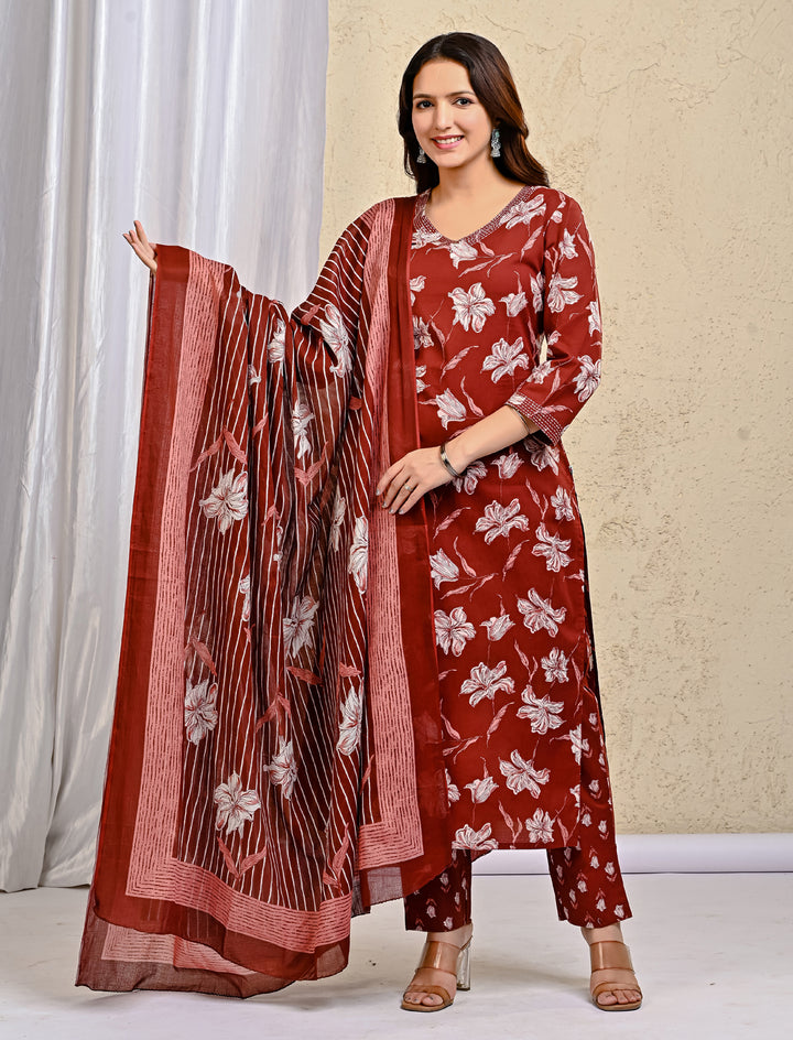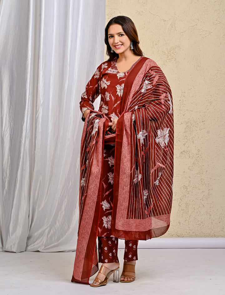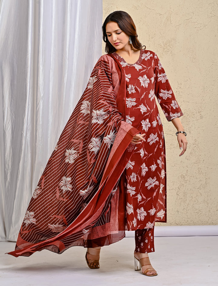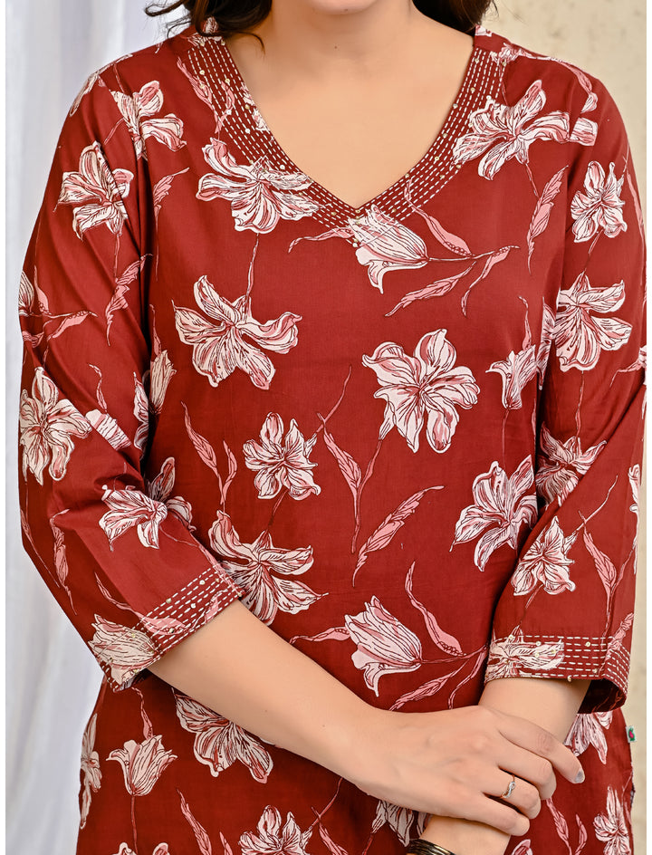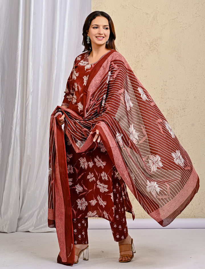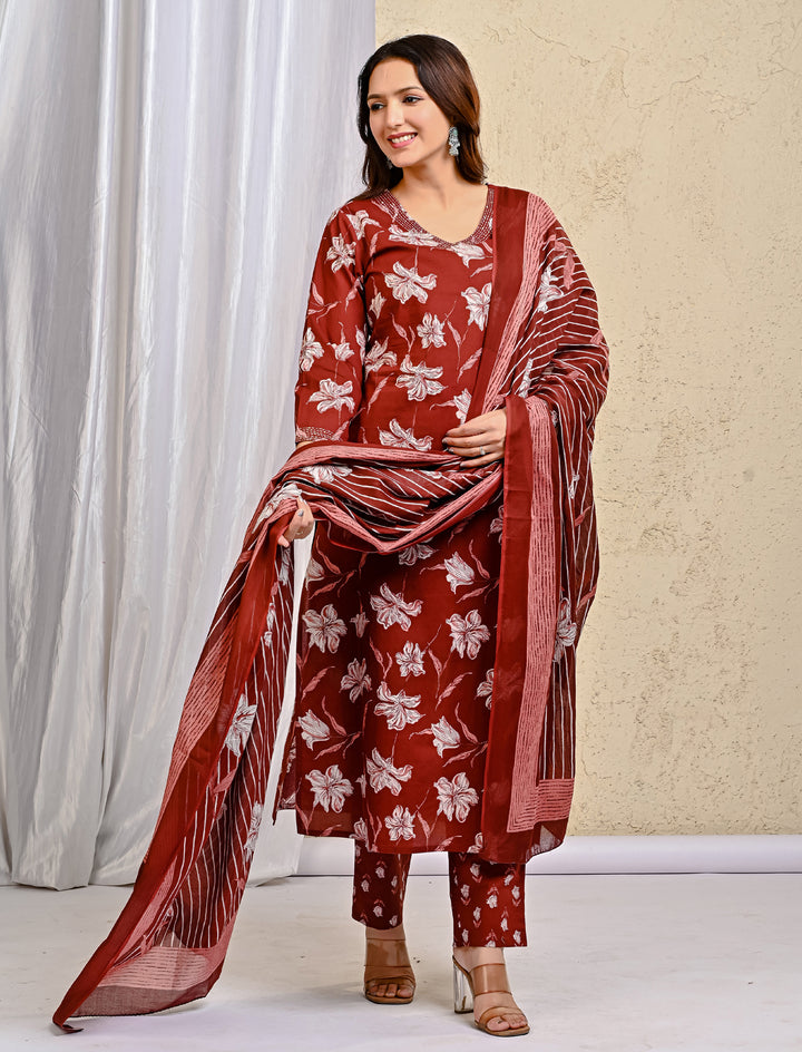 Maroon Block Printed Cotton Kurta Pant Set With Mulmul Dupatta