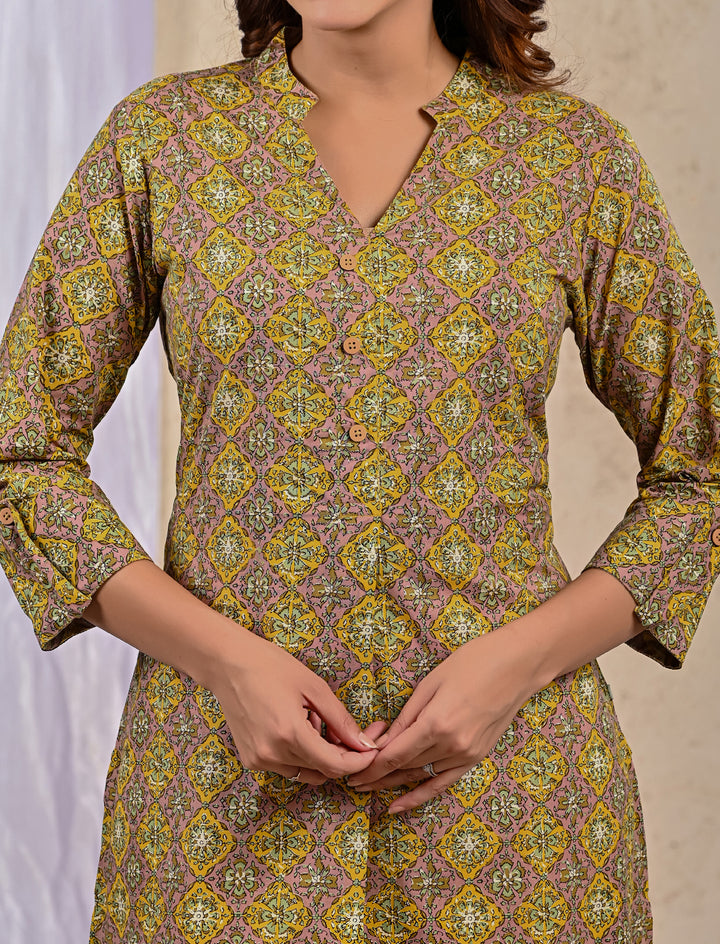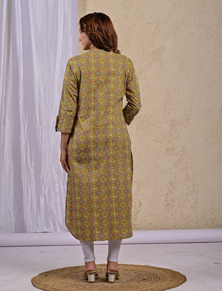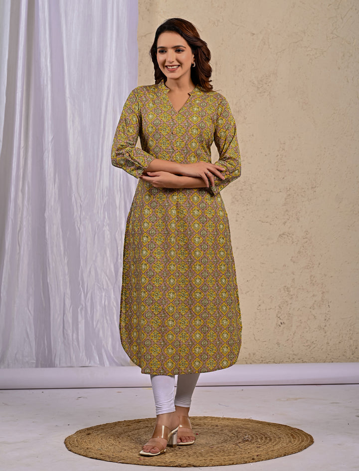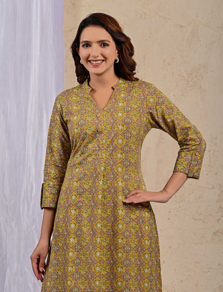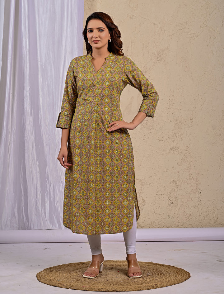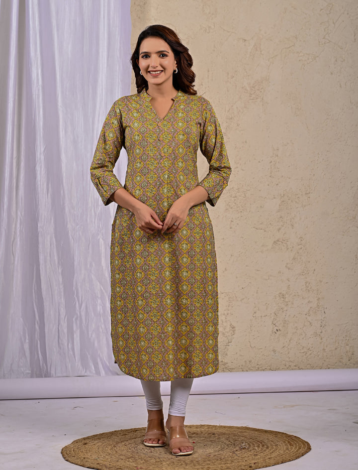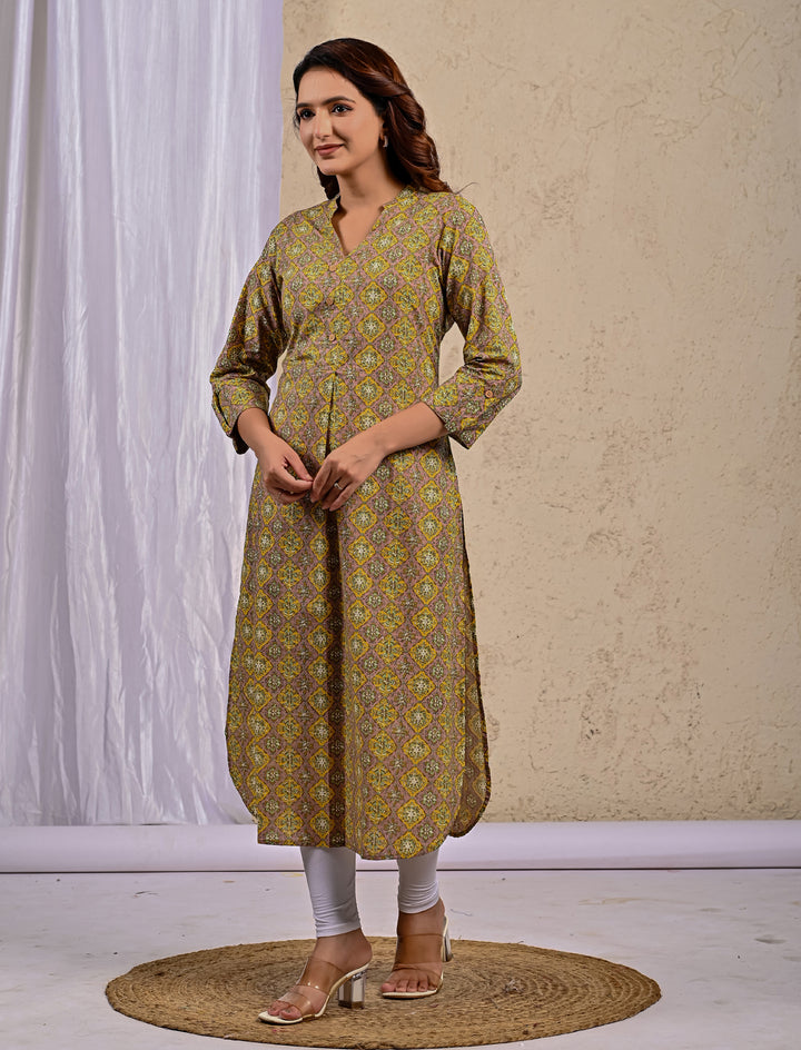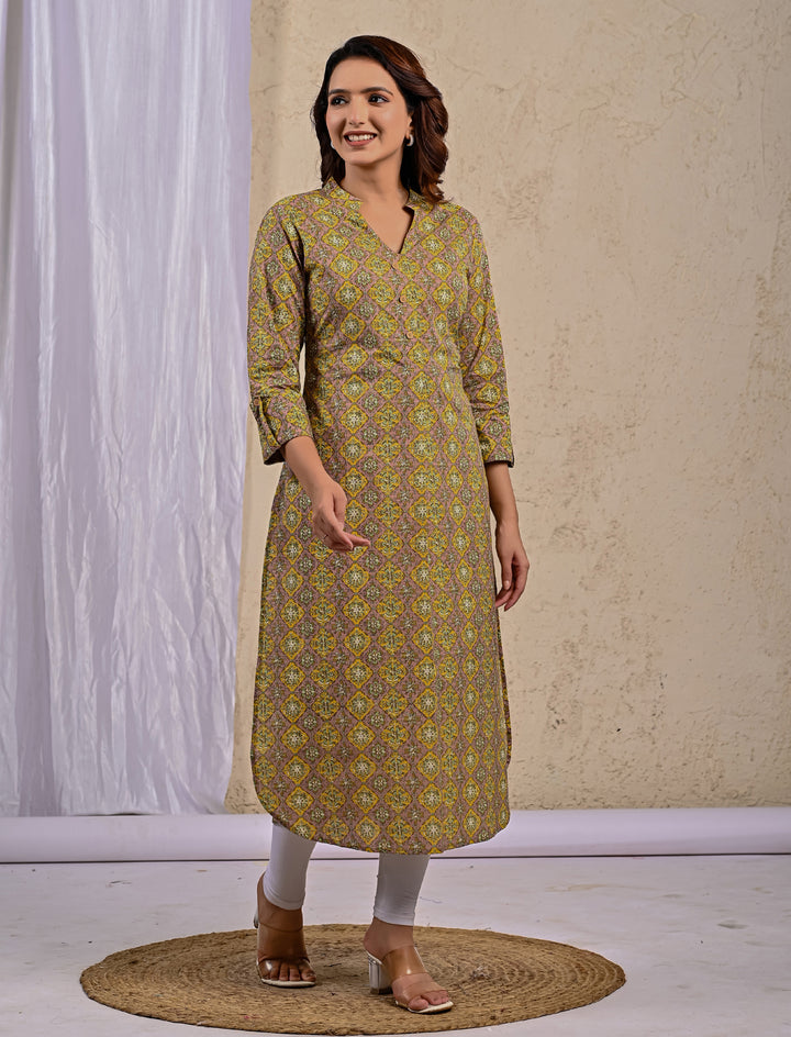 This printed ethnic wear kurti is presented to you by Gulabchand Prints, A well-known brand in hand block prints from over 9 decades. This exclusively hand stitched kurti is made of 100% pure cotton fabric with having printed prints over it. The kurti is best suitable for you to showcase your women hood. Wear this at your ease and the fabric is so smooth to skin that you will love it and the attractive prints adds more charm to the same.